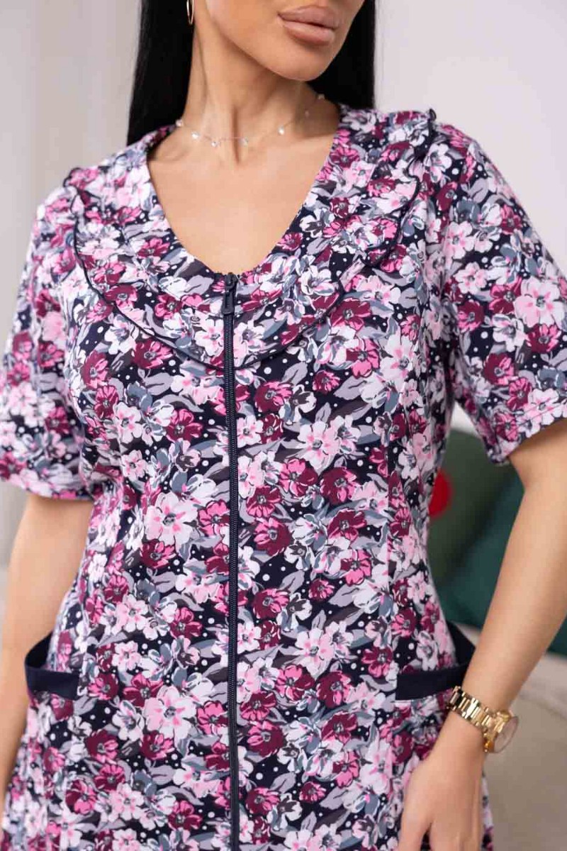Представляем Вашему вниманию женский халат на молнии из хлопка, с рельефами, карманами в бочке и воланом по кокетке, сзади пояс из основного материала. Волан обработан роликовым швом, карманы обработаны обтачкой компаньоном к основному материалу.