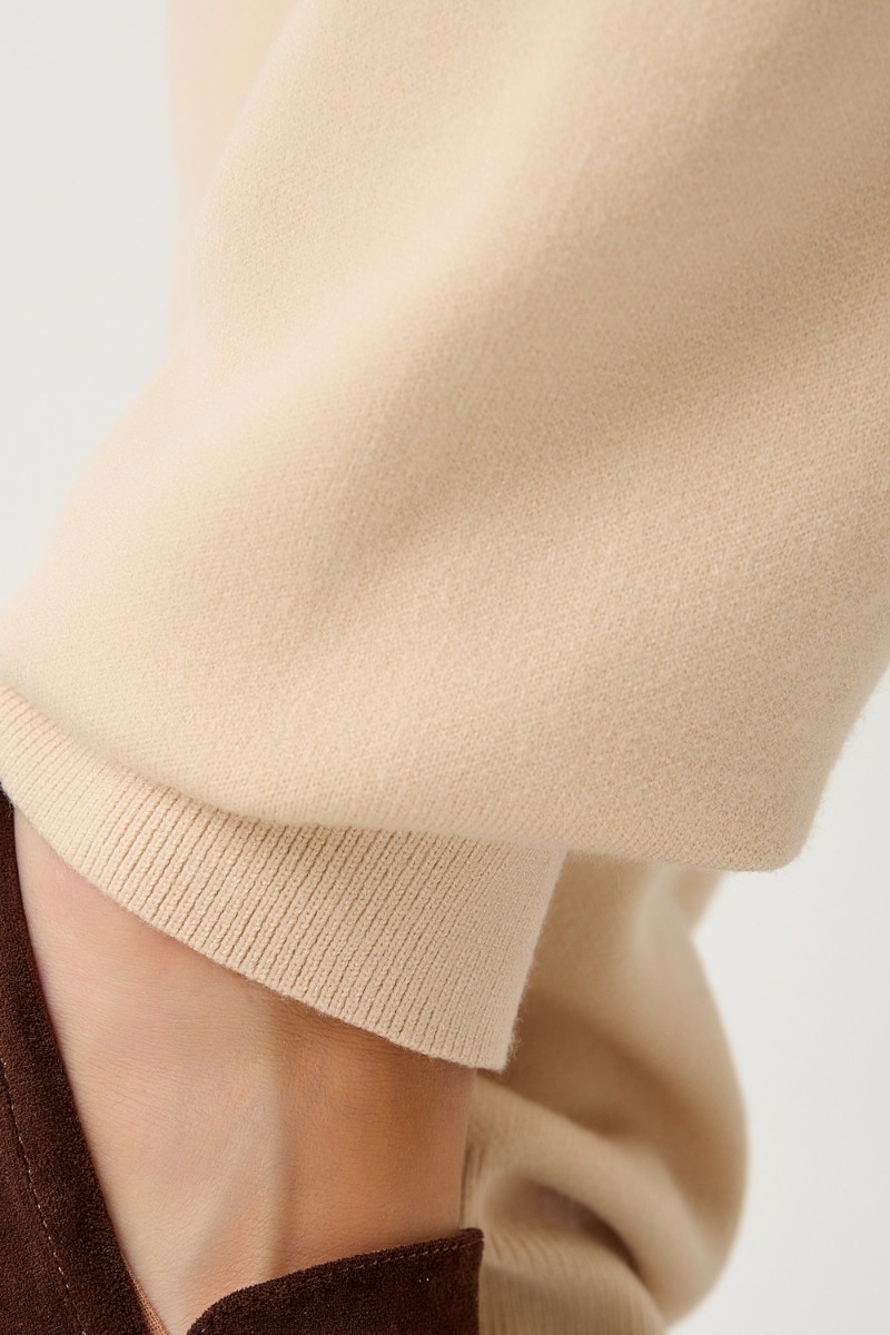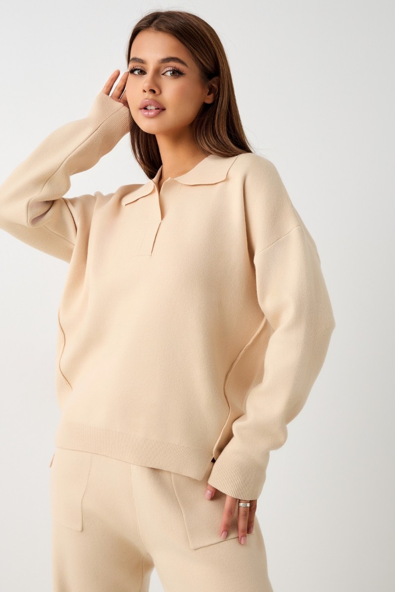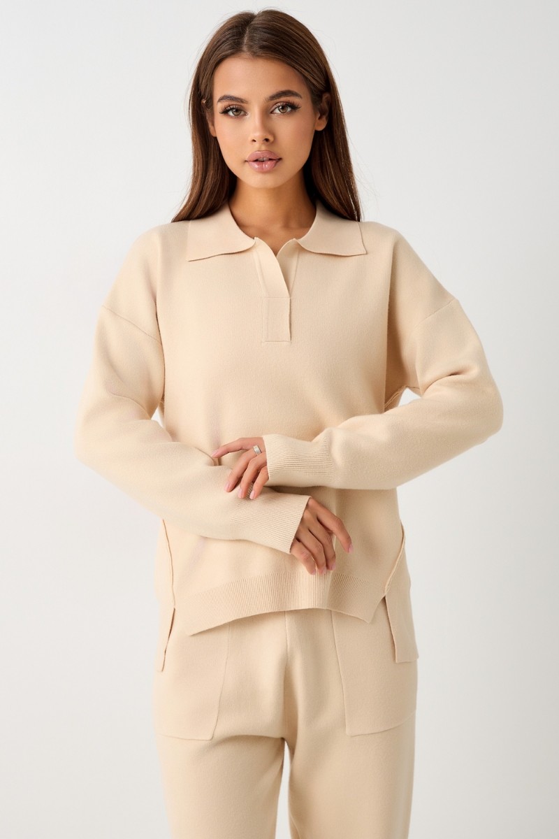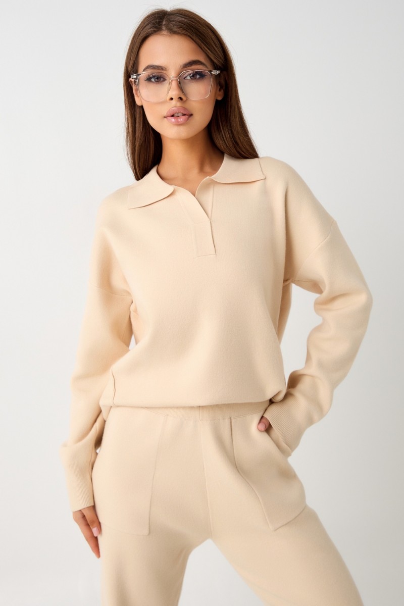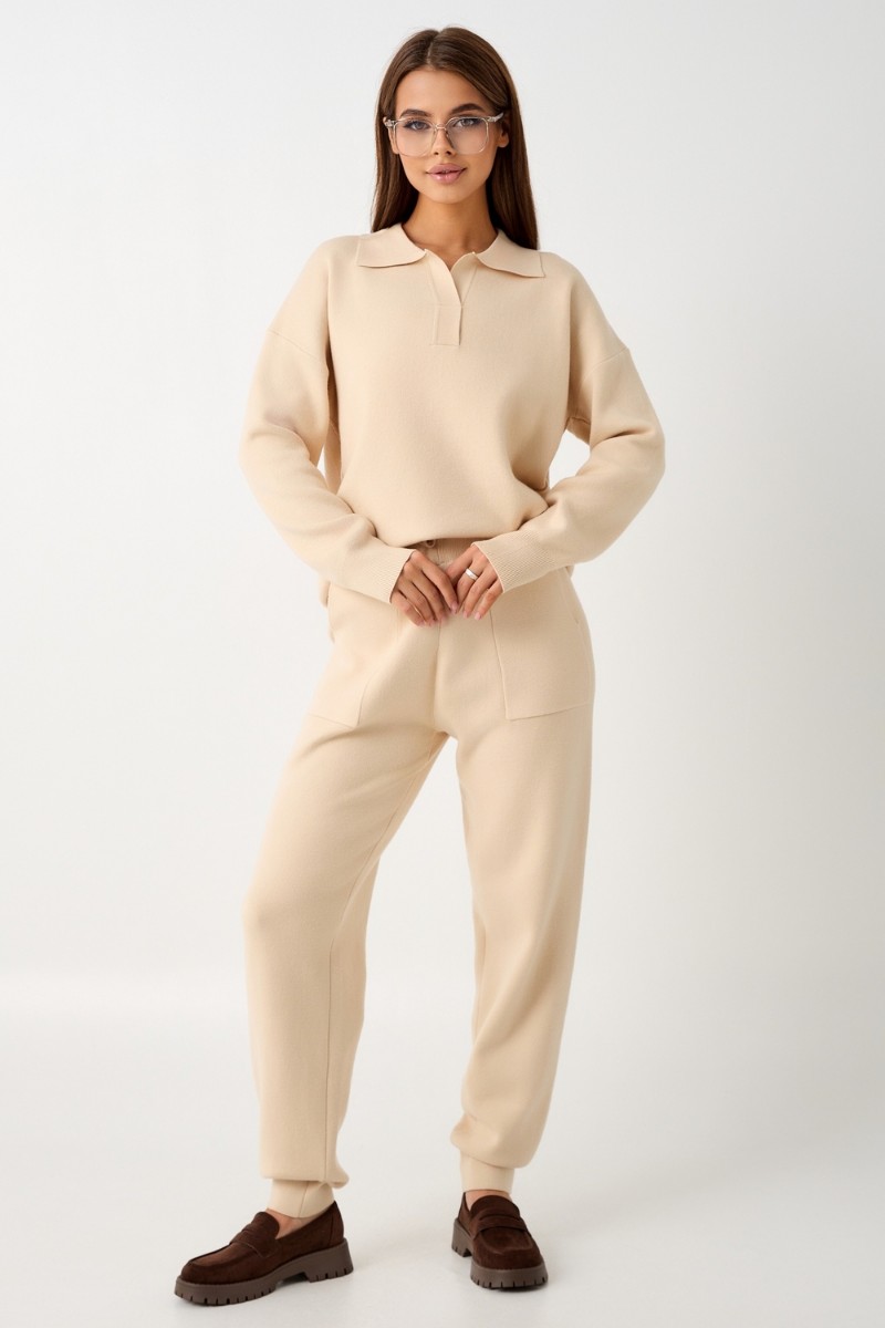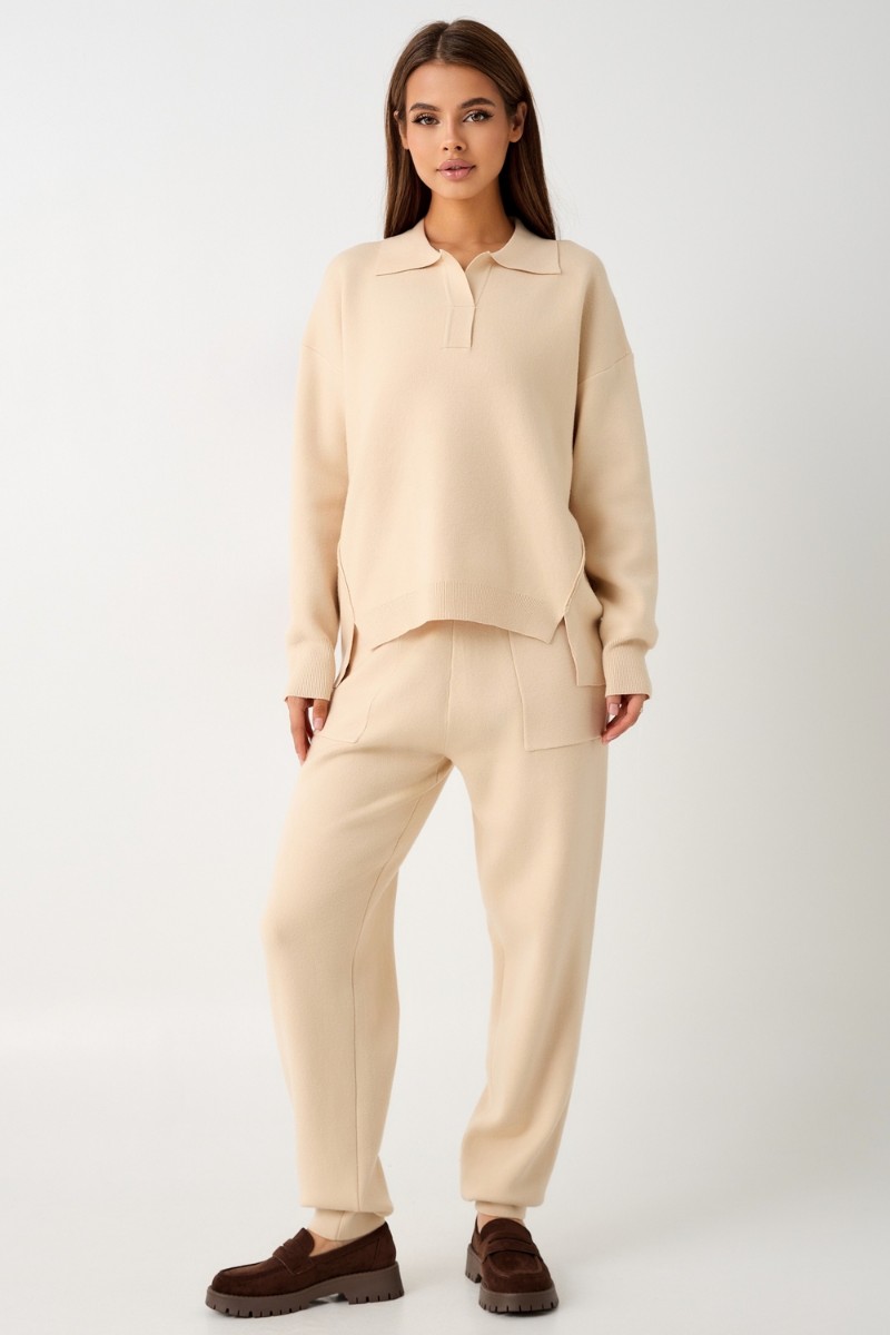 Представляем Вашему вниманию вязаный костюм, который станет незаменимой основой женского гардероба для прохладной погоды, комфортным способом утепления. Он сшит из мягкой, приятной к телу пряжи с шерстяными волокнами, которая надолго сохраняет насыщенность цвета и свою форму, выдерживая интенсивное ношение и частые стирки. Стильный дизайнерский комплект отличается продуманным дизайном: кофточка - оверсайз со спущенным плечом, V-образным вырезом горловины и отложным воротником обеспечивает комфорт, а брюки - спортивки с широким поясом - резинкой, длинными штанинами с манжетами и удобными карманами подчеркивают силуэт, не сковывая движений. Универсальность классической пастельной палитры и лаконичного дизайна позволяет легко включать комплект в коллекцию вещей для осенне - весеннего демисезонного и зимнего периода. Он идеально сочетается с однотонными вариантами обуви и нарядными праздничными аксессуарами для создания элегантного и собранного образа.