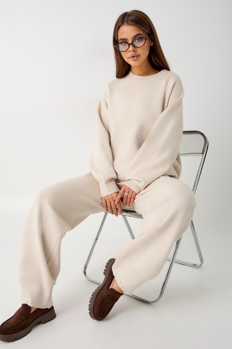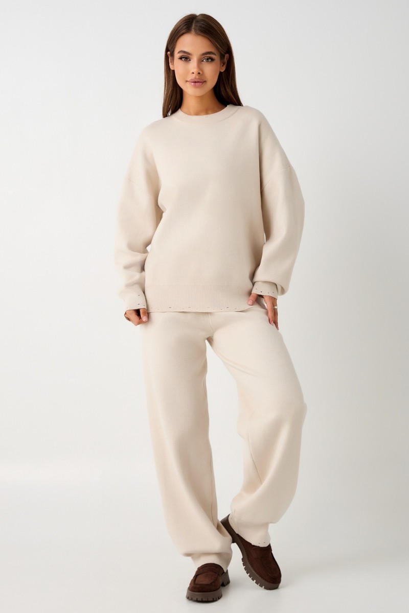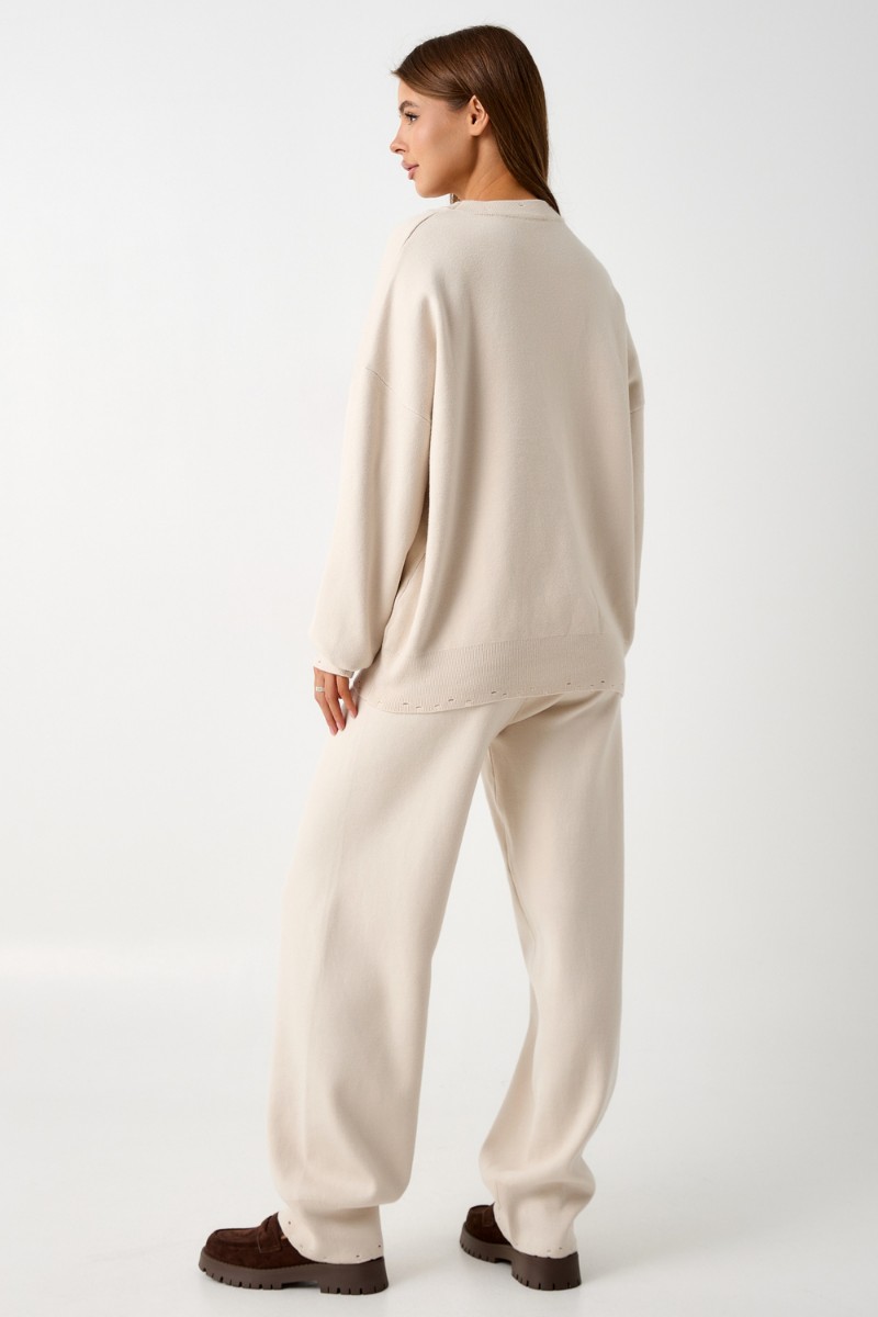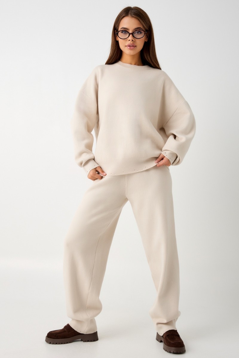 Представляем Вашему вниманию вязаный костюм, который станет незаменимой основой женского гардероба для прохладной погоды, комфортным способом утепления. Он сшит из мягкой, приятной к телу пряжи с шерстяными волокнами, которая надолго сохраняет насыщенность цвета и свою форму, выдерживая интенсивное ношение и частые стирки. Стильный дизайнерский комплект отличается продуманным дизайном: кофточка - оверсайз со спущенным плечом, V-образным вырезом горловины и отложным воротником обеспечивает комфорт, а брюки - спортивки с широким поясом - резинкой, длинными штанинами с манжетами и удобными карманами подчеркивают силуэт, не сковывая движений. Универсальность классической пастельной палитры и лаконичного дизайна позволяет легко включать комплект в коллекцию вещей для осенне - весеннего демисезонного и зимнего периода. Он идеально сочетается с однотонными вариантами обуви и нарядными праздничными аксессуарами для создания элегантного и собранного образа.