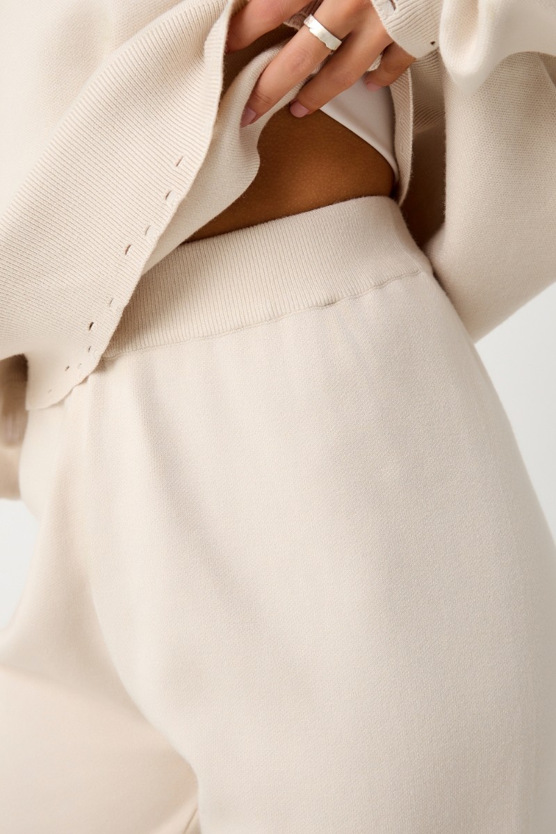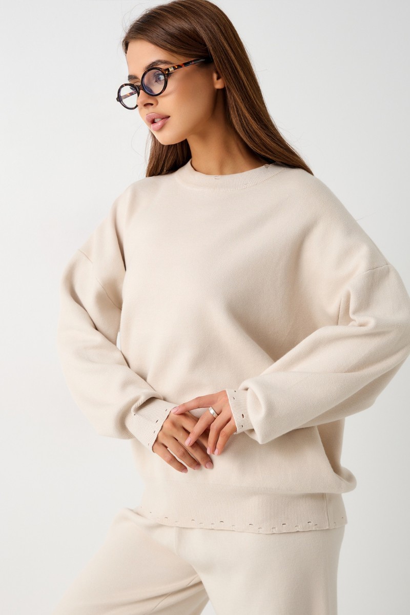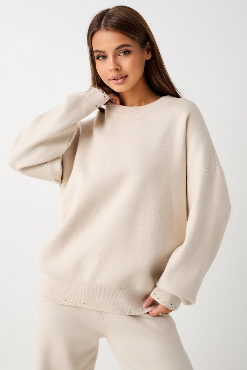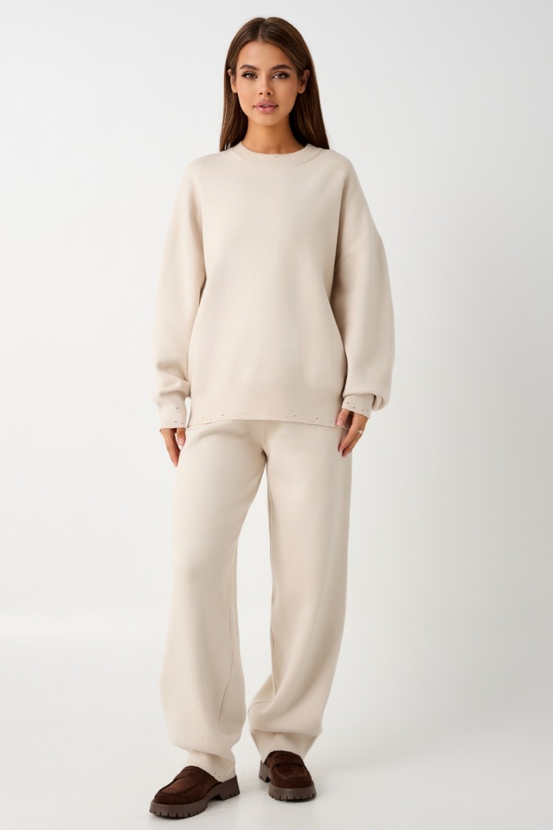 Представляем Вашему вниманию вязаный костюм, который станет незаменимой основой женского гардероба для прохладной погоды, комфортным способом утепления. Он сшит из мягкой, приятной к телу пряжи с шерстяными волокнами, которая надолго сохраняет насыщенность цвета и свою форму, выдерживая интенсивное ношение и частые стирки. Стильный дизайнерский комплект отличается продуманным дизайном: кофточка - оверсайз со спущенным плечом, V-образным вырезом горловины и отложным воротником обеспечивает комфорт, а брюки - спортивки с широким поясом - резинкой, длинными штанинами с манжетами и удобными карманами подчеркивают силуэт, не сковывая движений. Универсальность классической пастельной палитры и лаконичного дизайна позволяет легко включать комплект в коллекцию вещей для осенне - весеннего демисезонного и зимнего периода. Он идеально сочетается с однотонными вариантами обуви и нарядными праздничными аксессуарами для создания элегантного и собранного образа.