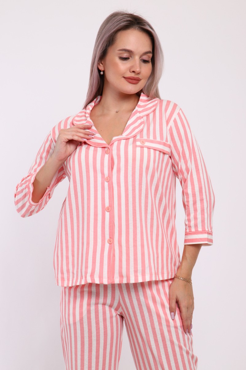 Представляем Вашему вниманию пижаму женскую с брюками. Рубашка прямого, свободного кроя на пуговицах с имитацией кармана на груди. Воротник фигурный. Кроя полочки, рукав и воротник обработан внутренней окантовкой. Брюки с карманами, длина по щиколотку.