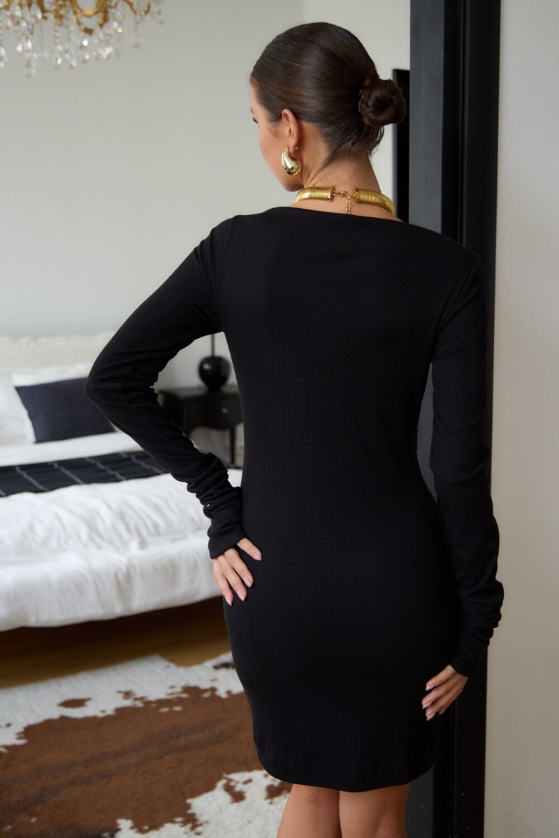 В поисках идеального вечернего наряда или платья для новогодней ночи, обратите внимание на эту модель. Прилегающий крой, кокетливая длина мини и удлиненные рукава с чувственными прорезями для пальцев создают неповторимый образ, исполненный женственности. Главная изюминка – возможность трансформации. Одно движение, и платье превращается в соблазнительный наряд на одно плечо или с открытыми плечами.