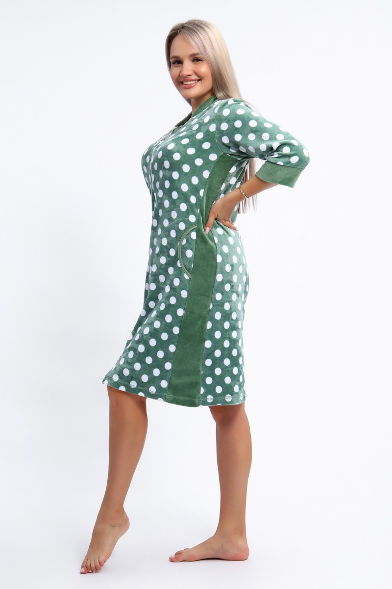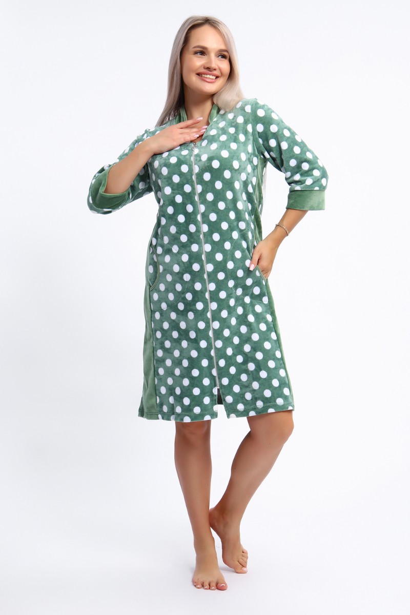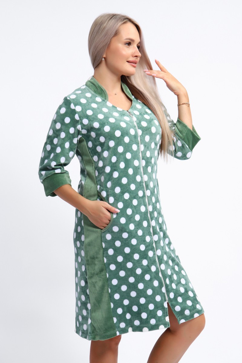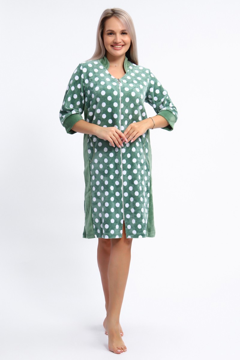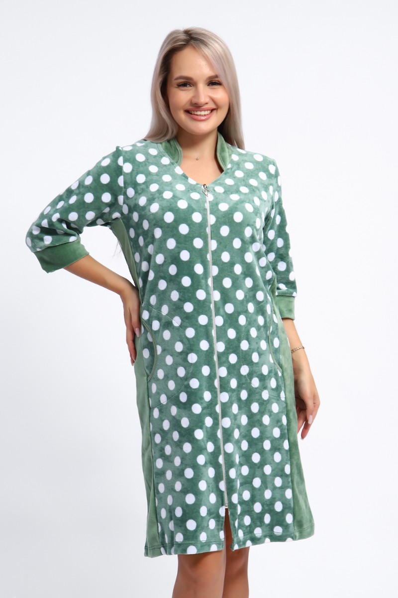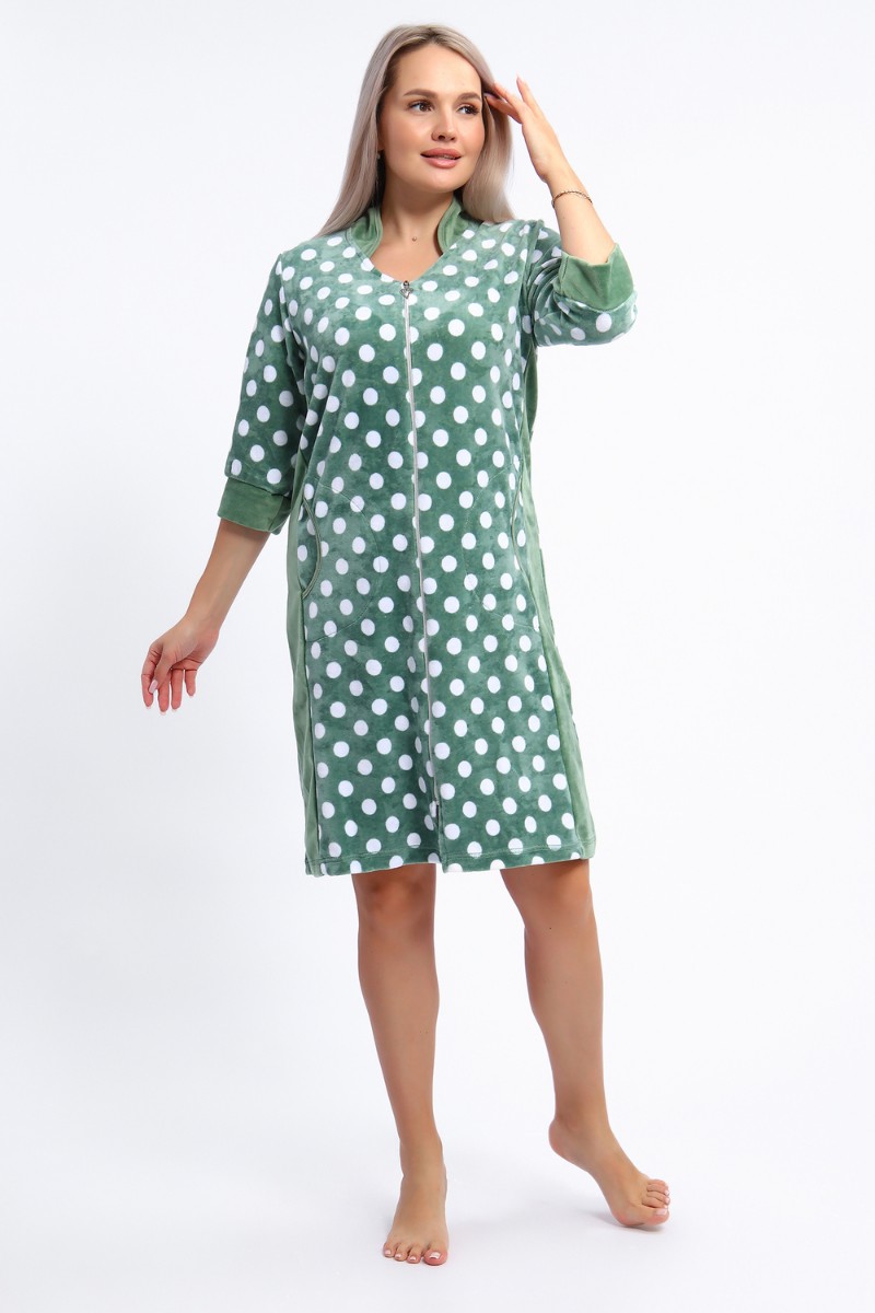 Представляем Вашему вниманию халат велюровый на молнии в горошек. Воротник-стойка, рукава 3/4 на манжете, по бокам однотонная вставка, с карманами. Ткань велюр, качество отличное, после стирки цвет не теряет, не деформируется, приятное к телу. Для дома и отдыха.