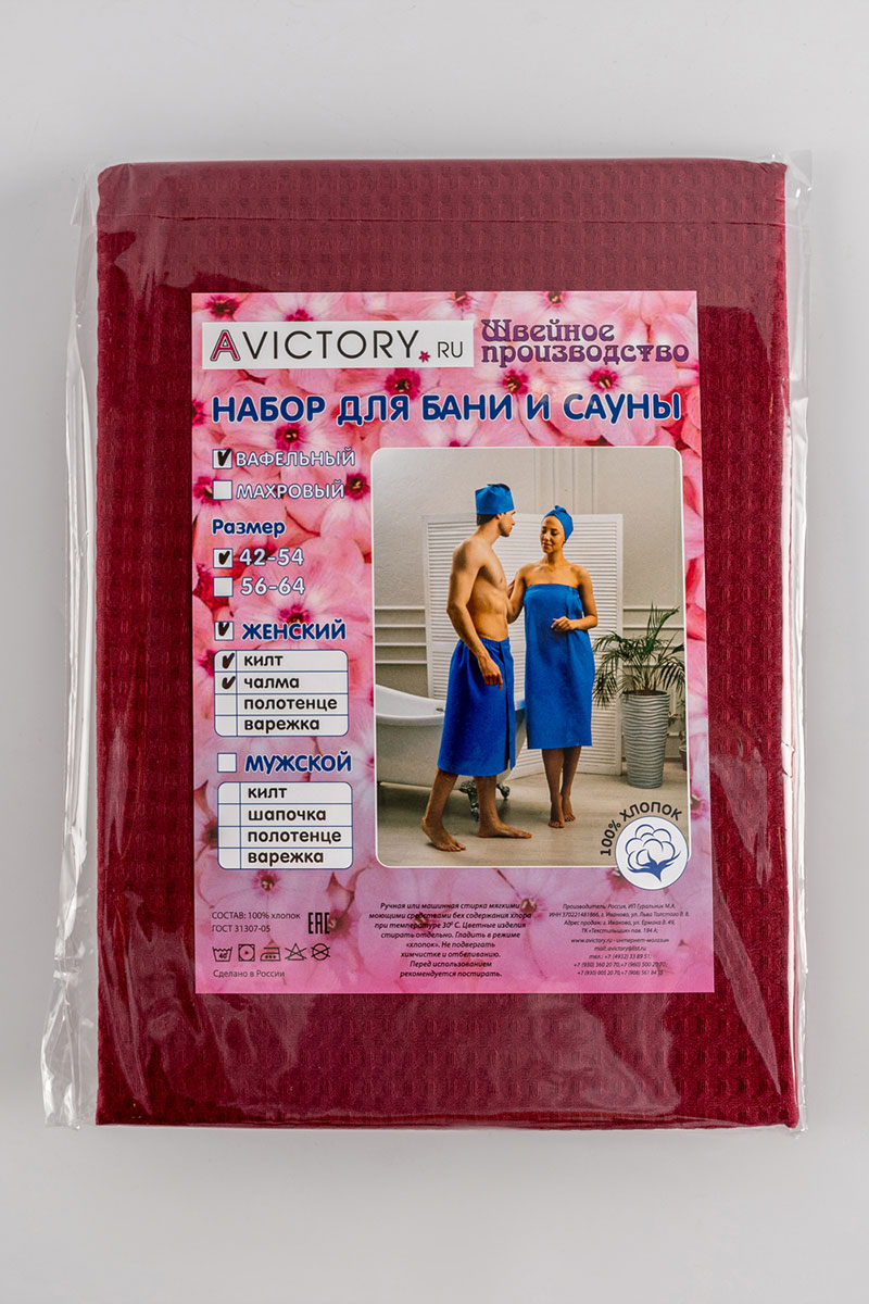 Вафельный текстиль из чистого хлопка плотностью 240 г/м² отлично впитывает влагу. Вафельные килты на резинке лучше впитывают влагу, чем махровые халаты или полотенца, и при этом они компактнее и занимают меньше места. Килт размером 90х150 см идеально садится по фигуре. Комфортная накидка и шапочка станут незаменимыми спутниками в бане, сауне, спа-салоне и душевой спортивного клуба.