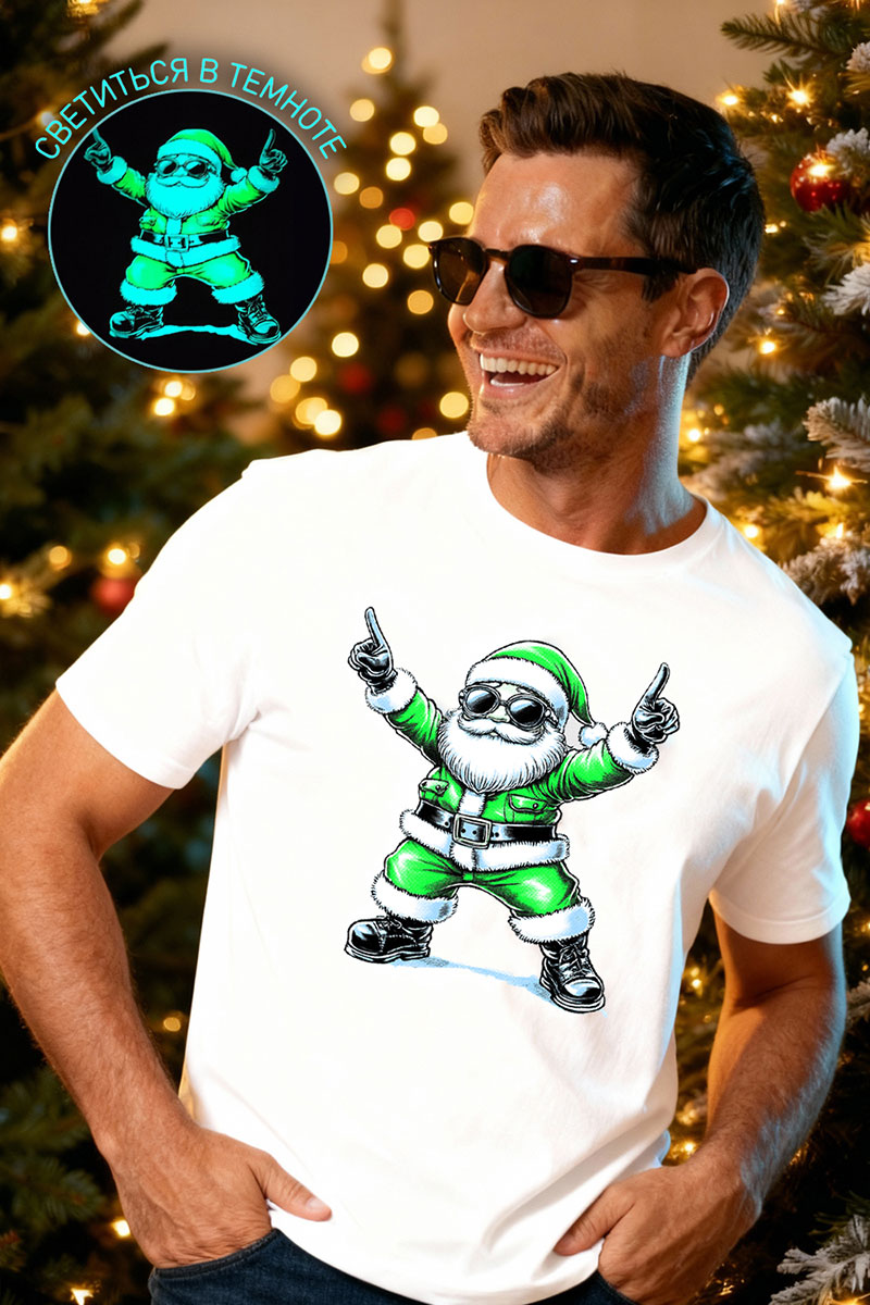 Футболка унисекс светящаяся №8581 кулирка (р-ры: 42-74) белый дедМ зеленый