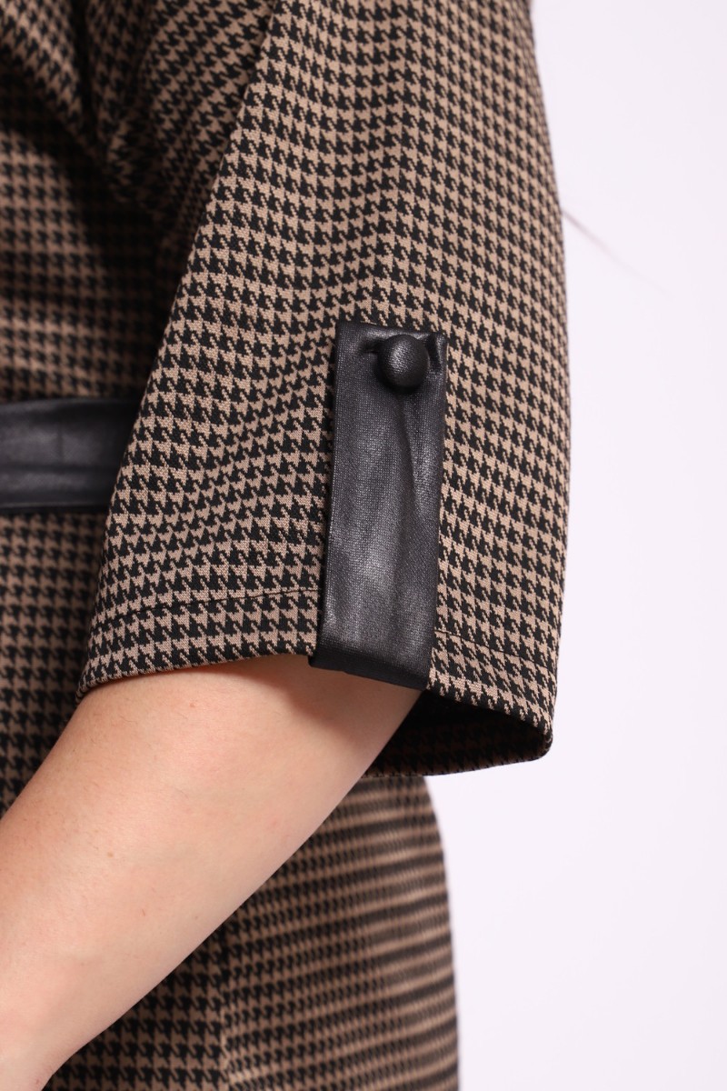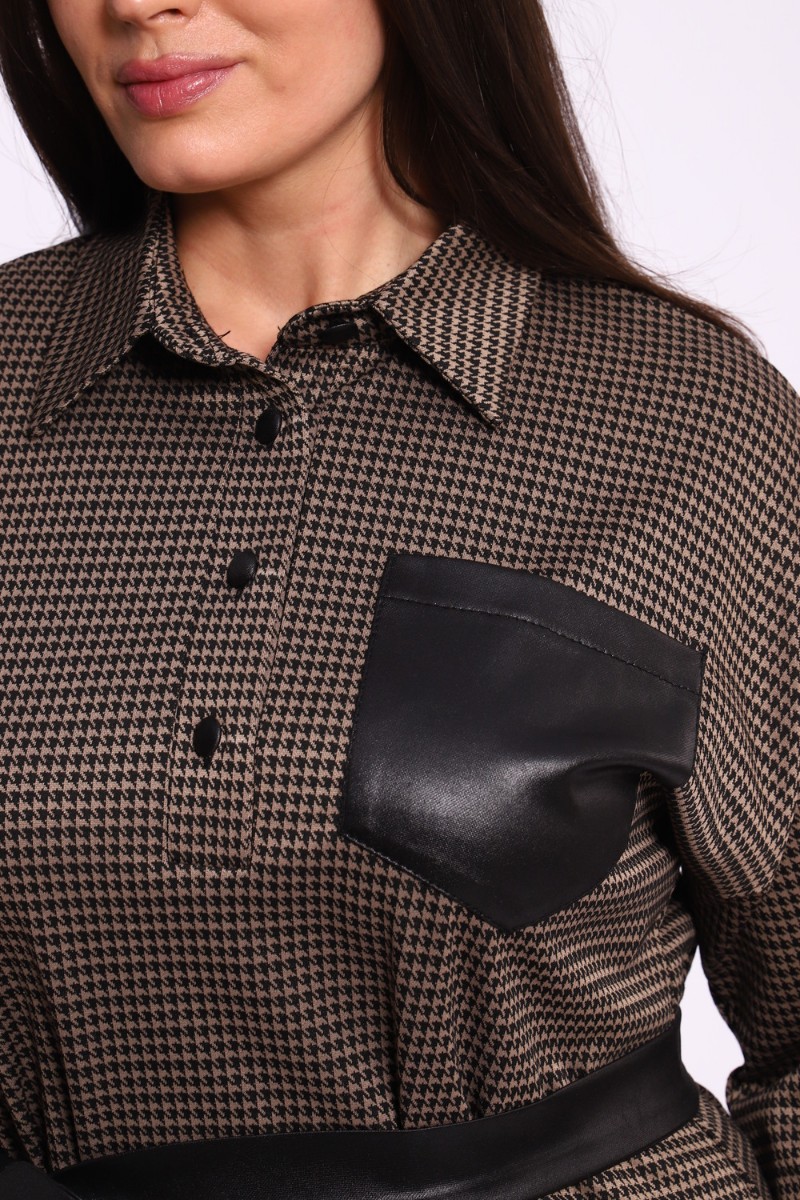 Ключевое преимущество этого платья — его изысканный дизайн. Спущенные рукава придают образу лёгкость и непринуждённость, которые так необходимы в повседневной жизни и на официальных мероприятиях. Рубашечный воротник, выполненный из стреч-кожи, добавляет нотку современности и придаёт облику благородства и стиля. Это оригинальное сочетание делает платье особенно привлекательным для модниц, стремящихся оставаться в тренде.