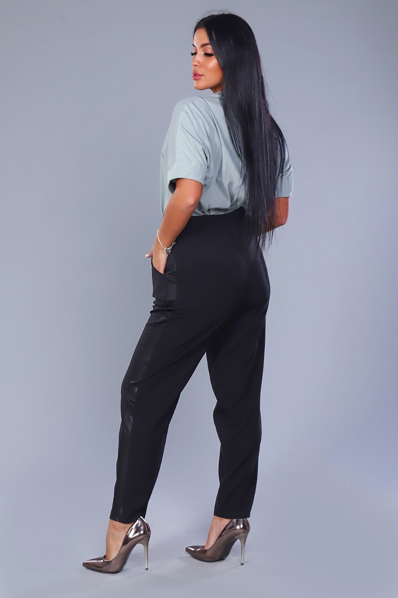 Представляем Вашему вниманию классические черные брюки с лампасами из ткани - имитации кожи. Брюки будут актуальны практически везде: работа, деловая встреча, прогулка, торжественный случай, смотря с каким верхом их комбинировать. Благодаря высокой посадке и широкому поясу на резинке, изделие хорошо сядет на любую фигуру. Брюки заужены книзу, по бокам внутренние карманы. Ширина лампаса - 3,5 см. В замерах объем талии соответствует длине пояса в растянутом виде.
