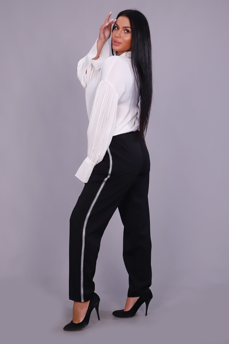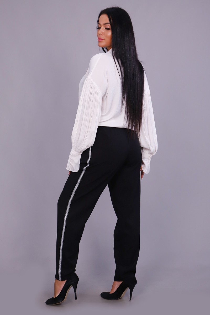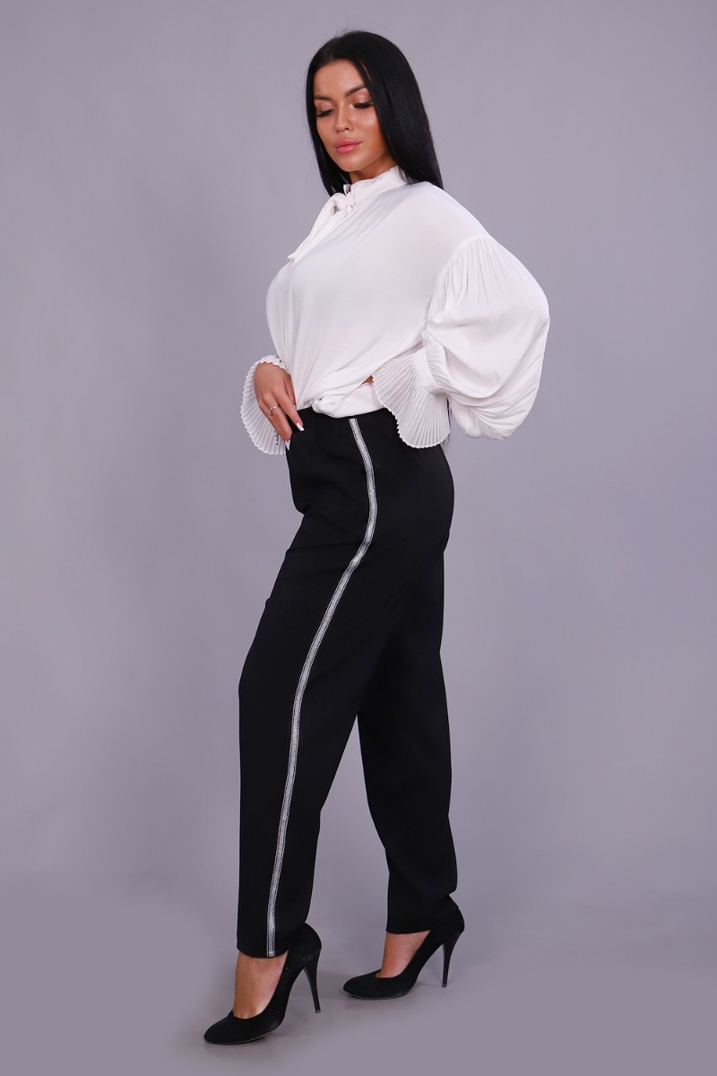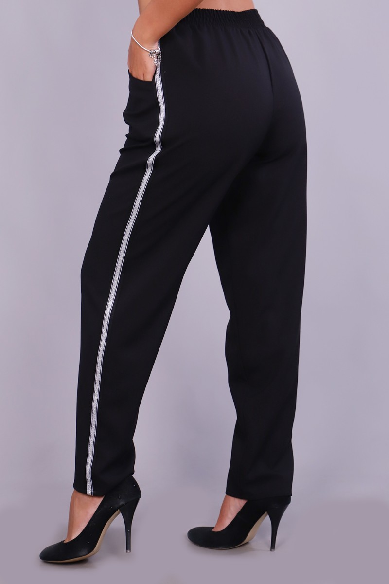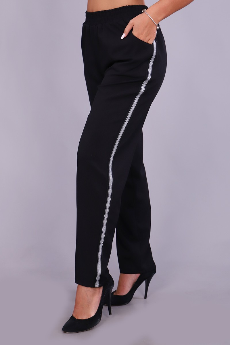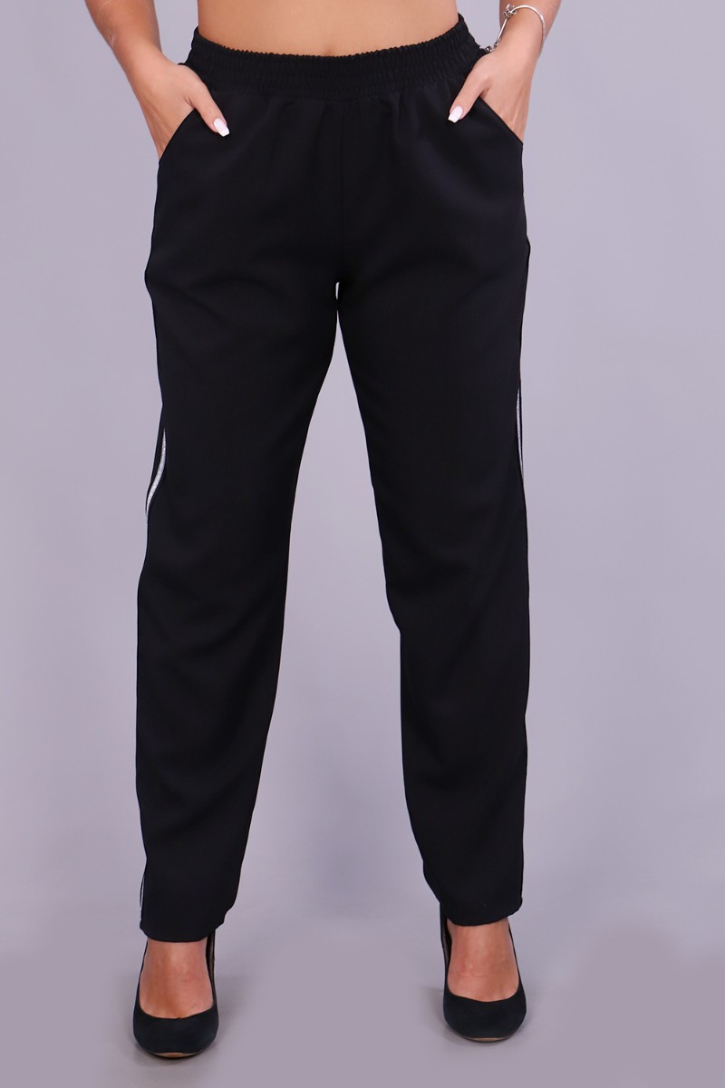 Представляем Вашему вниманию удобные практичные классические черные брюки. Подойдут и для работы, и для торжественных случаев. Нарядность им придает лампас с серебряной люрексовой полосой. Ткань с содержанием льна не электризуется, приятна и комфортна к телу. Удобный пояс на широкой резинке, по бокам внутренние карманы. Будут хорошо смотреться с туфлями на каблуках и со спортивной обувью.