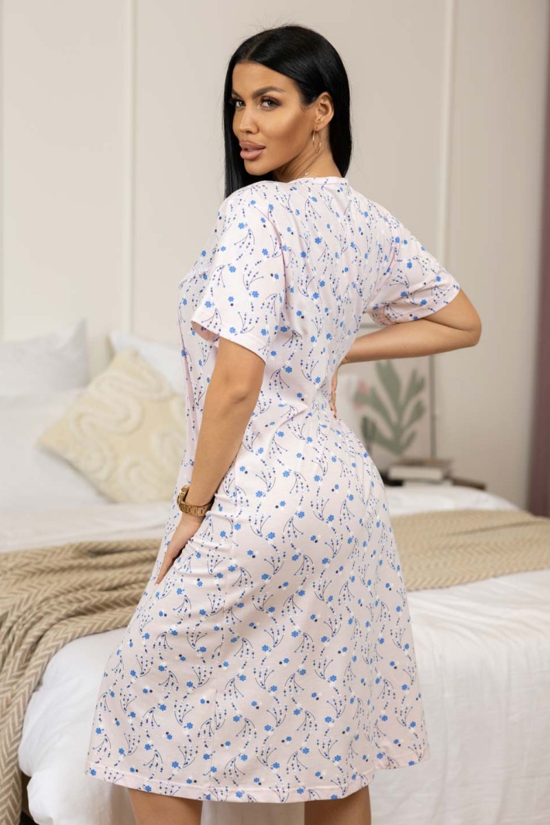 Представляем Вашему вниманию женскую ночную сорочку из хлопка, длиной до колена, с коротким рукавом, кокеткой на запах и оторочкой кружевом по кокетке.