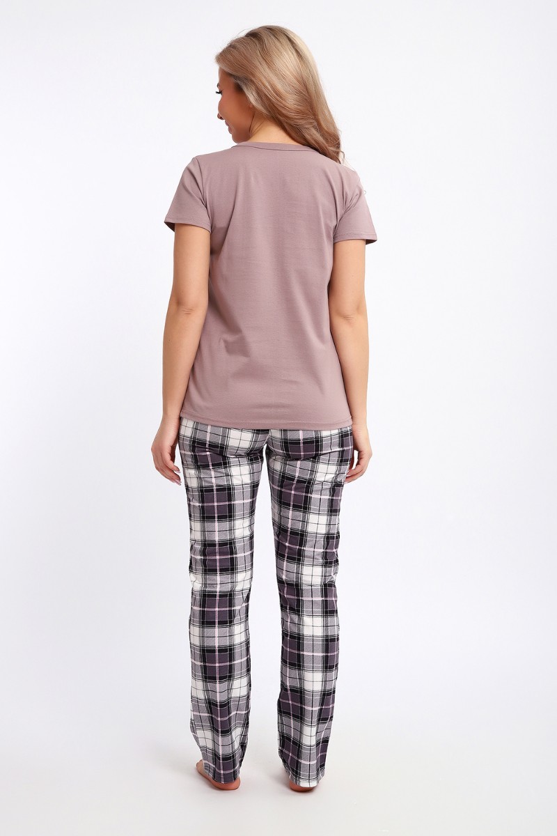 Представляем Вашему вниманию женский костюм двойку. Комплект футболка + брюки из хлопкового полотна кулирка. Футболка цвета кофе с молоком, на полочке серебристый принт в виде стилизованного сердечка, брюки в клетку, с карманами, пояс на резинке.