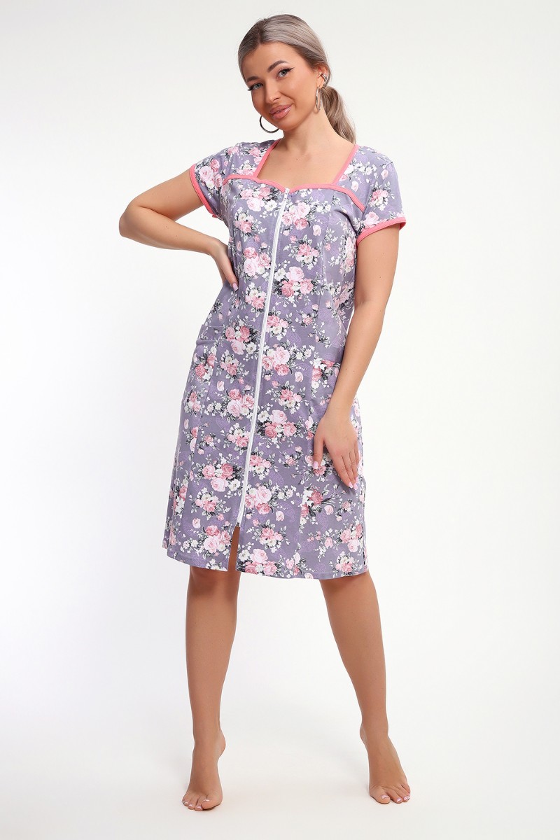 Представляем Вашему вниманию красивый женский халат на молнии. На полочках рельеф, который подчеркнет вашу фигуру. В рельефе карман. Рукав короткий. Горловина, кокетки и рукава обработаны бейкой из отделочной ткани. Халат прекрасно подойдет для дома, дачи и отдыха.