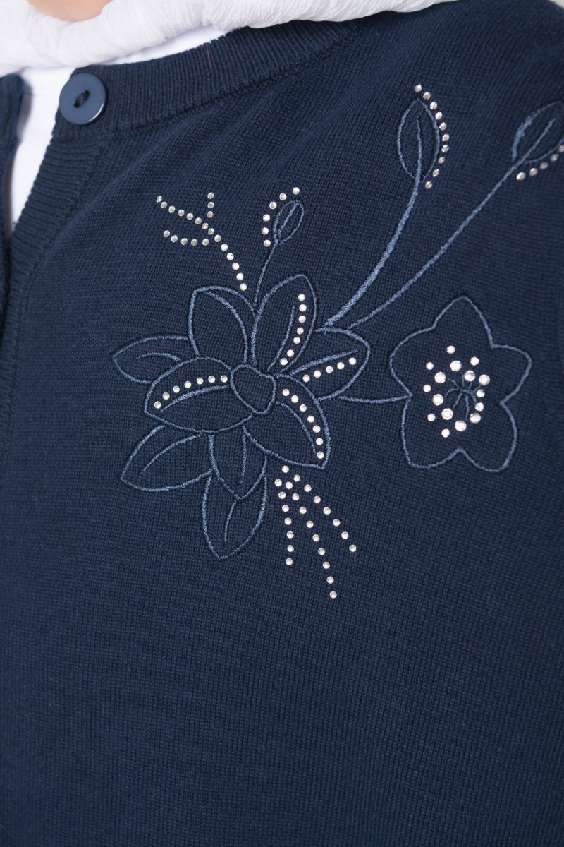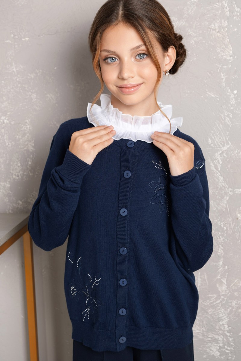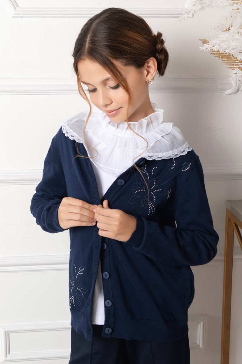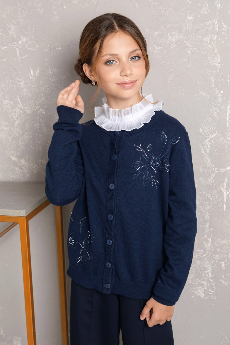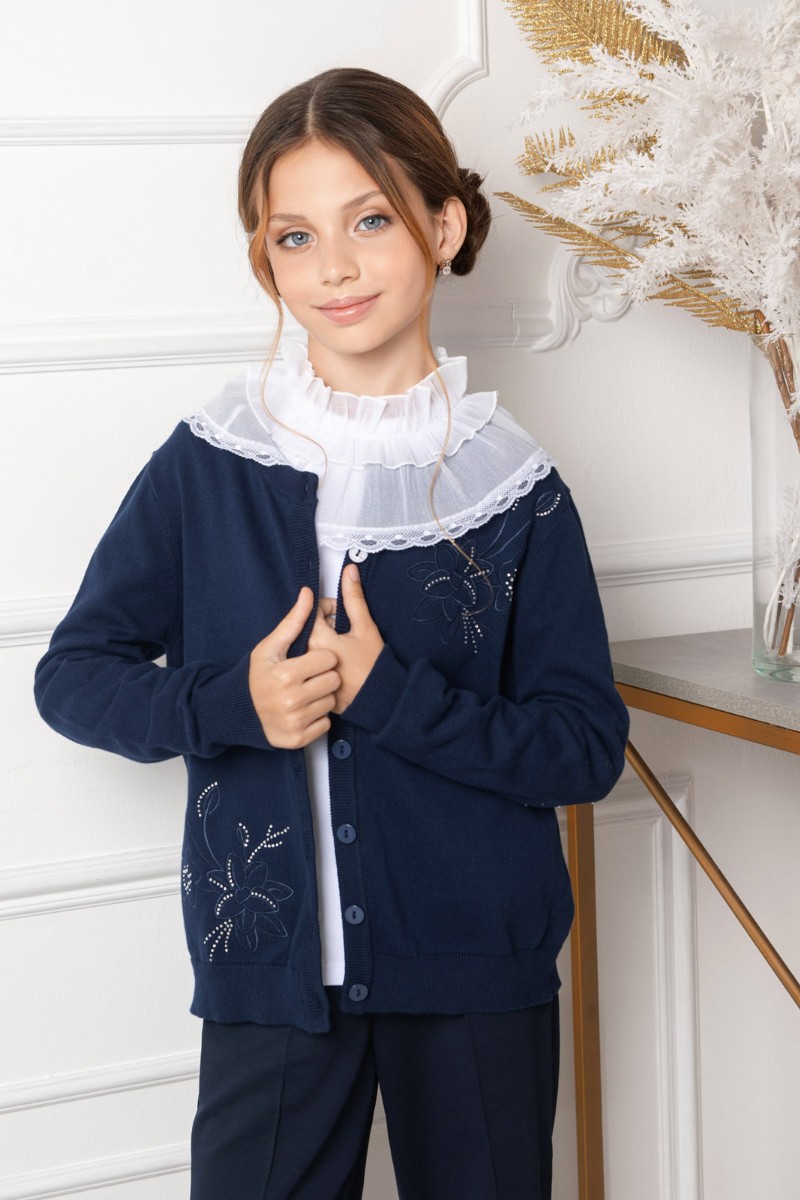 Представляем Вашему вниманию школьный жакет "Flower", выполненный из мягкого трикотажа глубокого синего оттенка. Украшен изящной вышивкой и стразами в форме цветов. Классический фасон на пуговицах отлично сидит и сочетается с любой школьной блузкой. Комфортный, элегантный и практичный вариант.