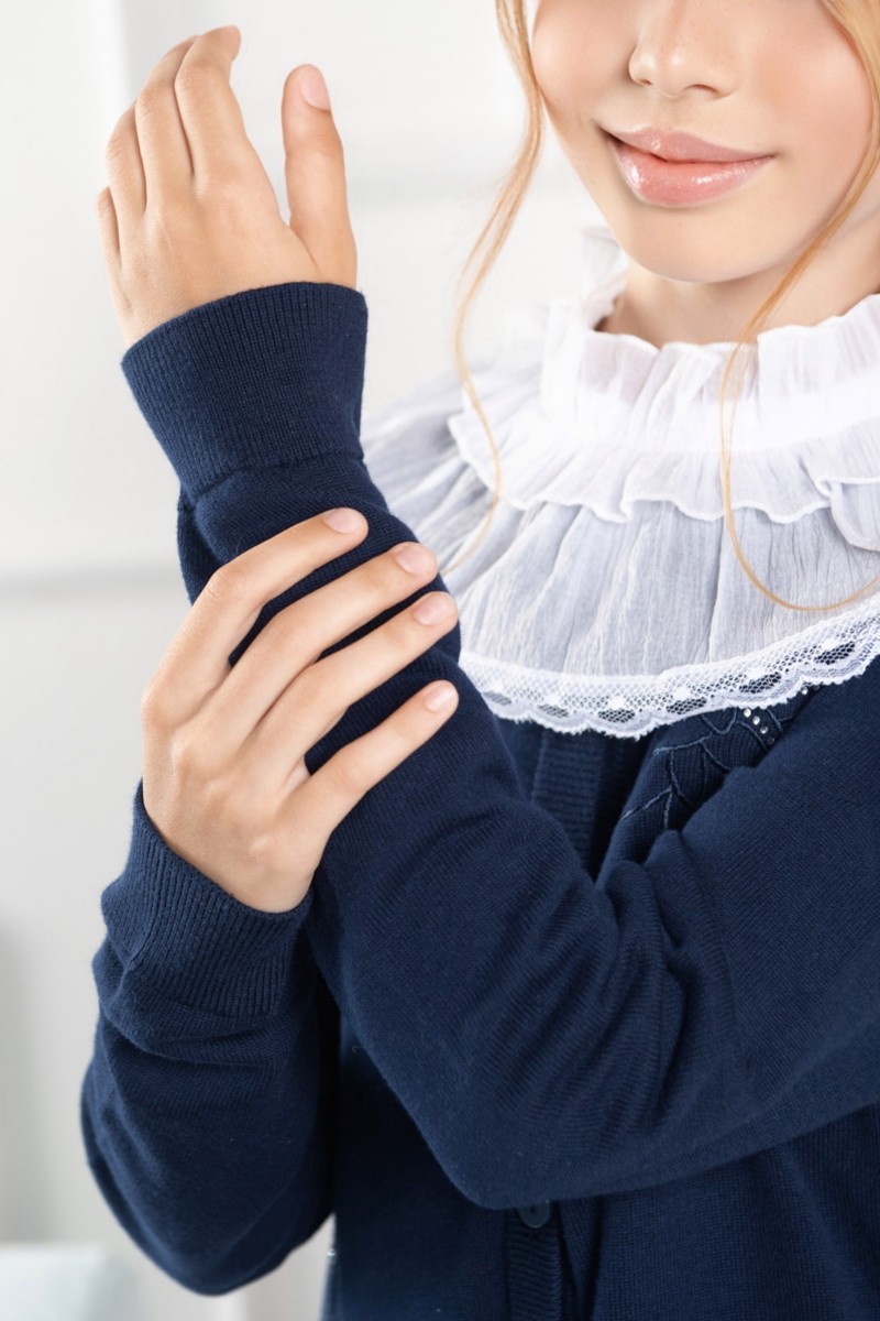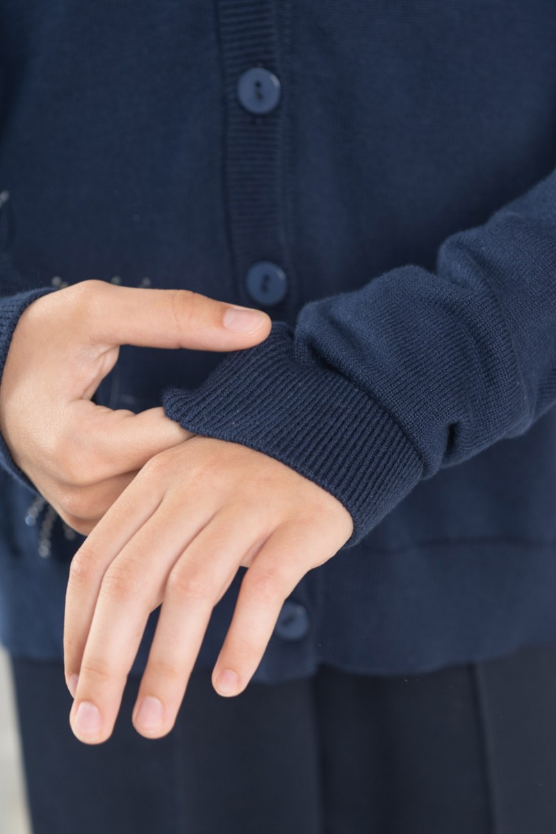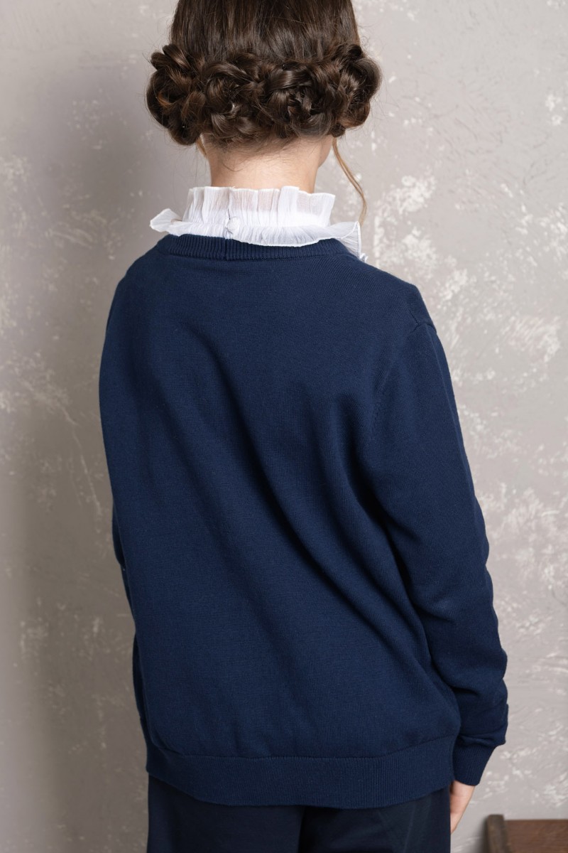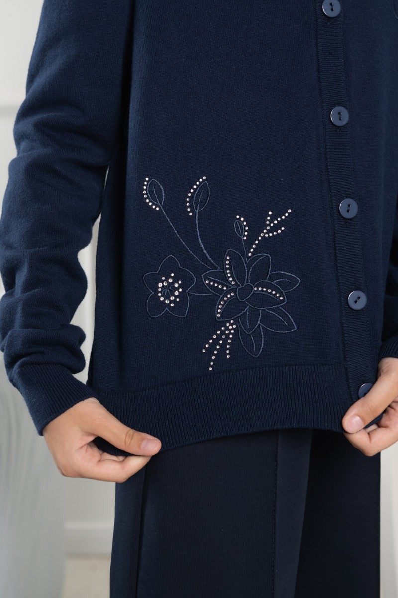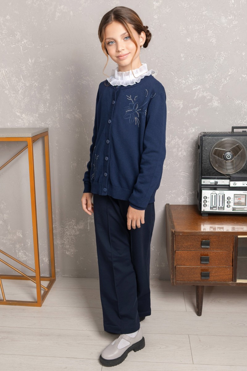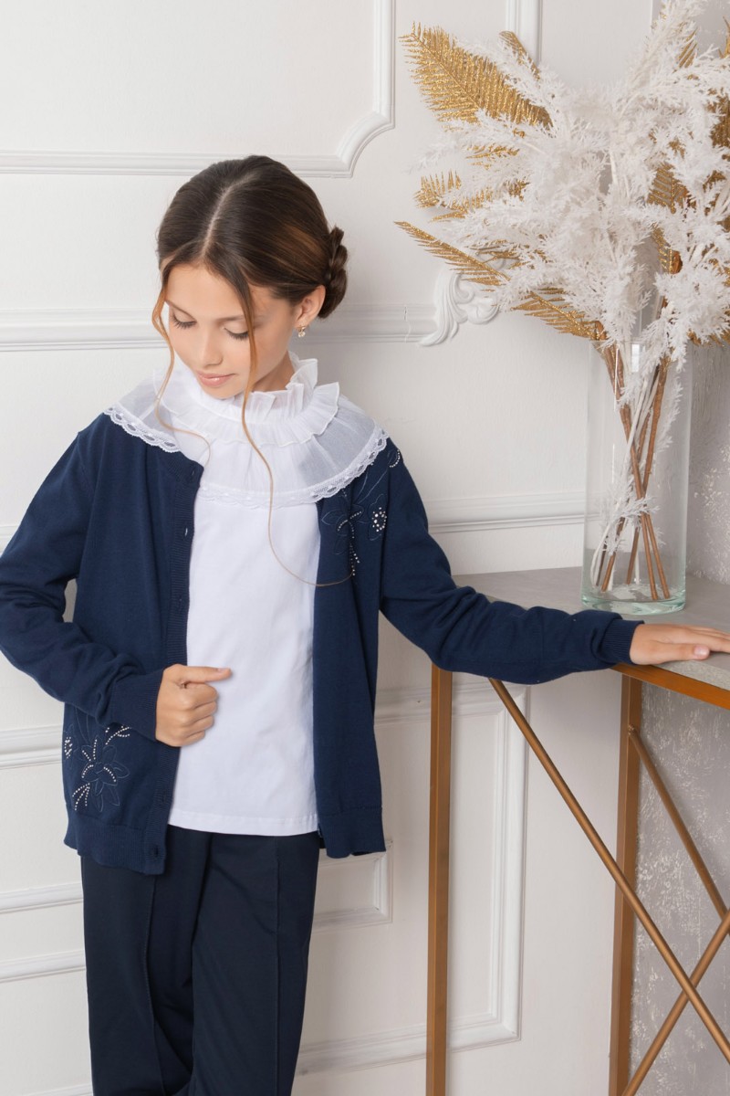 Представляем Вашему вниманию школьный жакет "Flower", выполненный из мягкого трикотажа глубокого синего оттенка. Украшен изящной вышивкой и стразами в форме цветов. Классический фасон на пуговицах отлично сидит и сочетается с любой школьной блузкой. Комфортный, элегантный и практичный вариант.