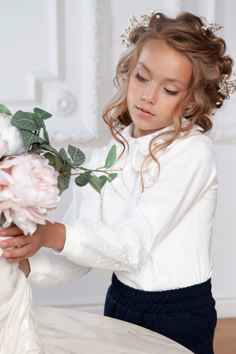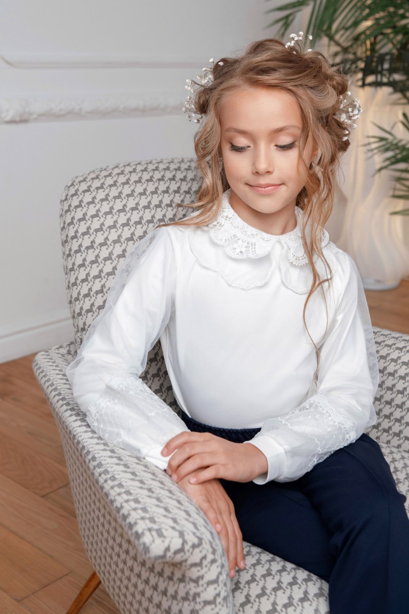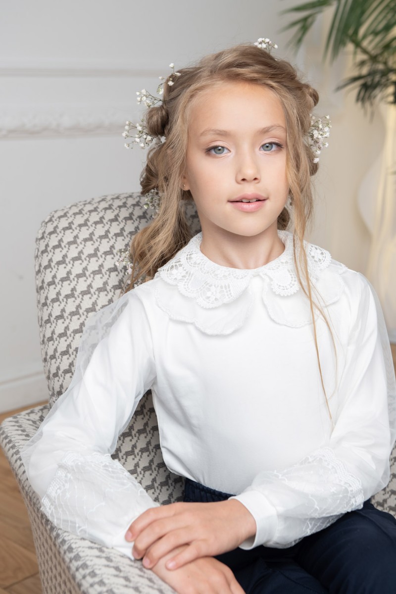 Представляем Вашему вниманию школьную блузку "Виктория", выполненную из мягкого хлопкового трикотажа с кружевным воротником и прозрачными рукавами из сеточки. Лёгкая, приятная к телу и нарядная. Идеально подходит для школы, праздников и торжественных линеек.