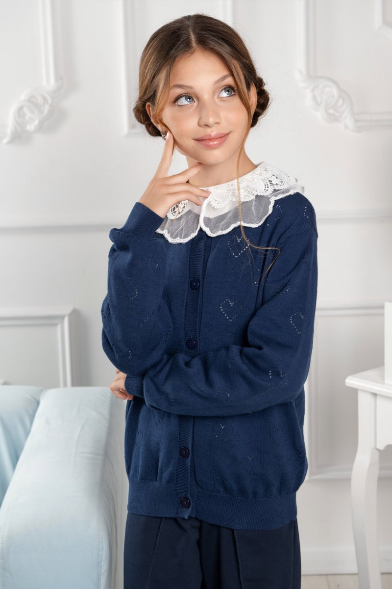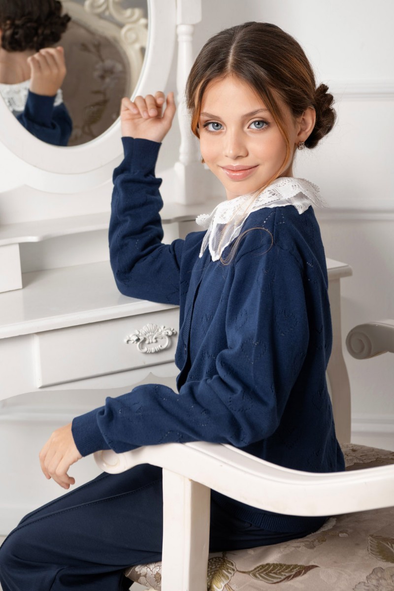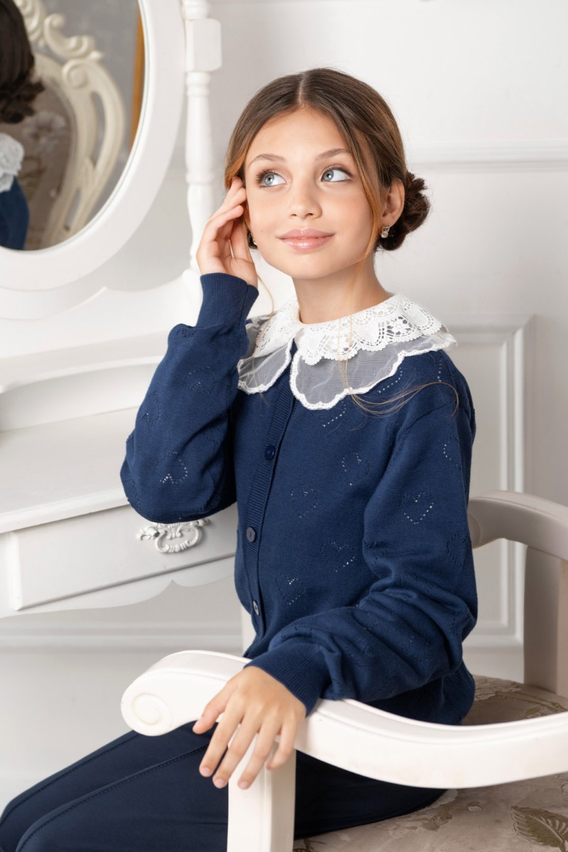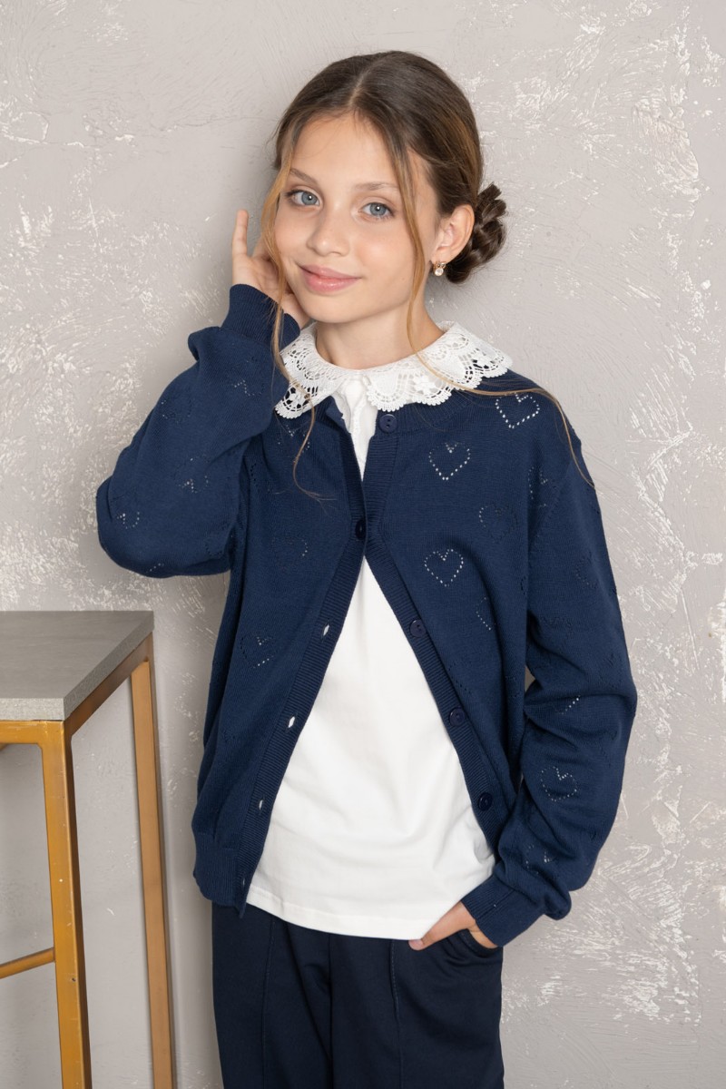 Представляем Вашему вниманию школьный жакет "Hearts", выполненный из мягкого трикотажа глубокого синего цвета. Ажурный узор с сердечками придаёт наряду нежность и стиль. Удобная застёжка на пуговицы и аккуратная посадка обеспечивают комфорт в течение всего учебного дня.