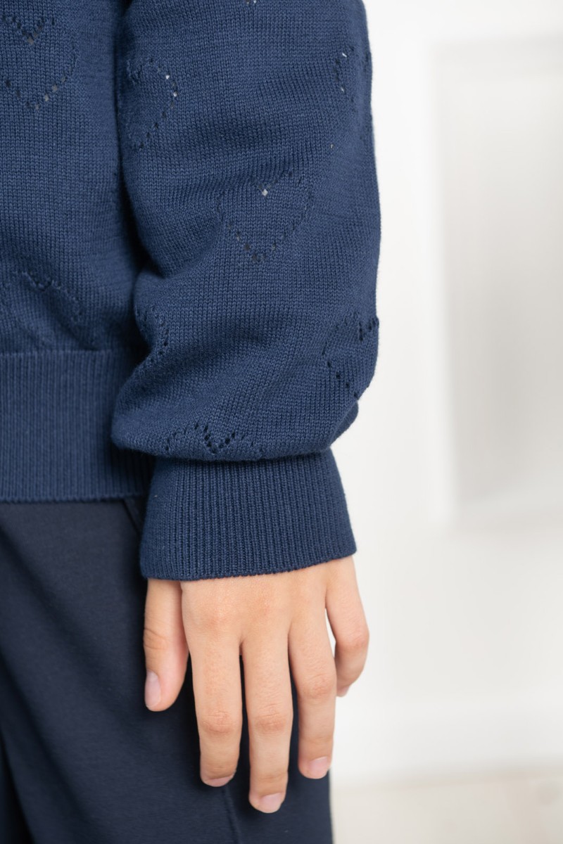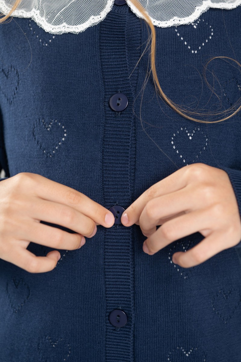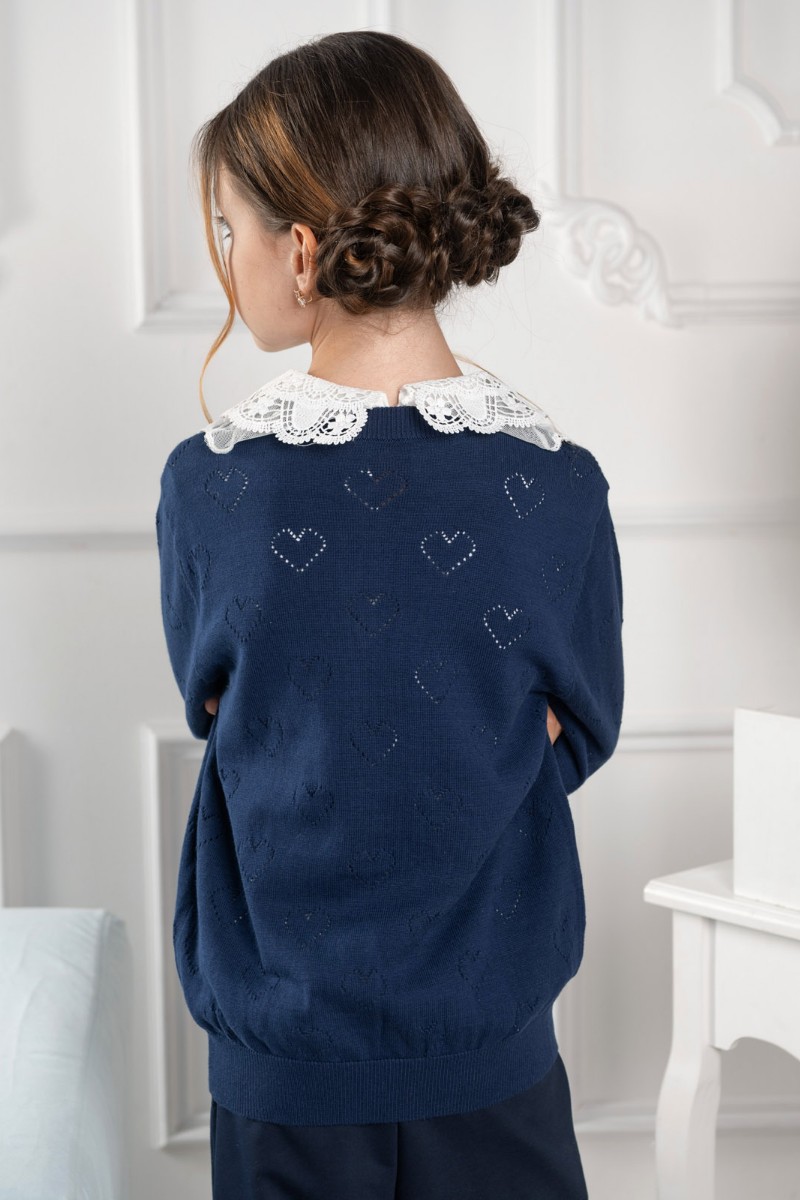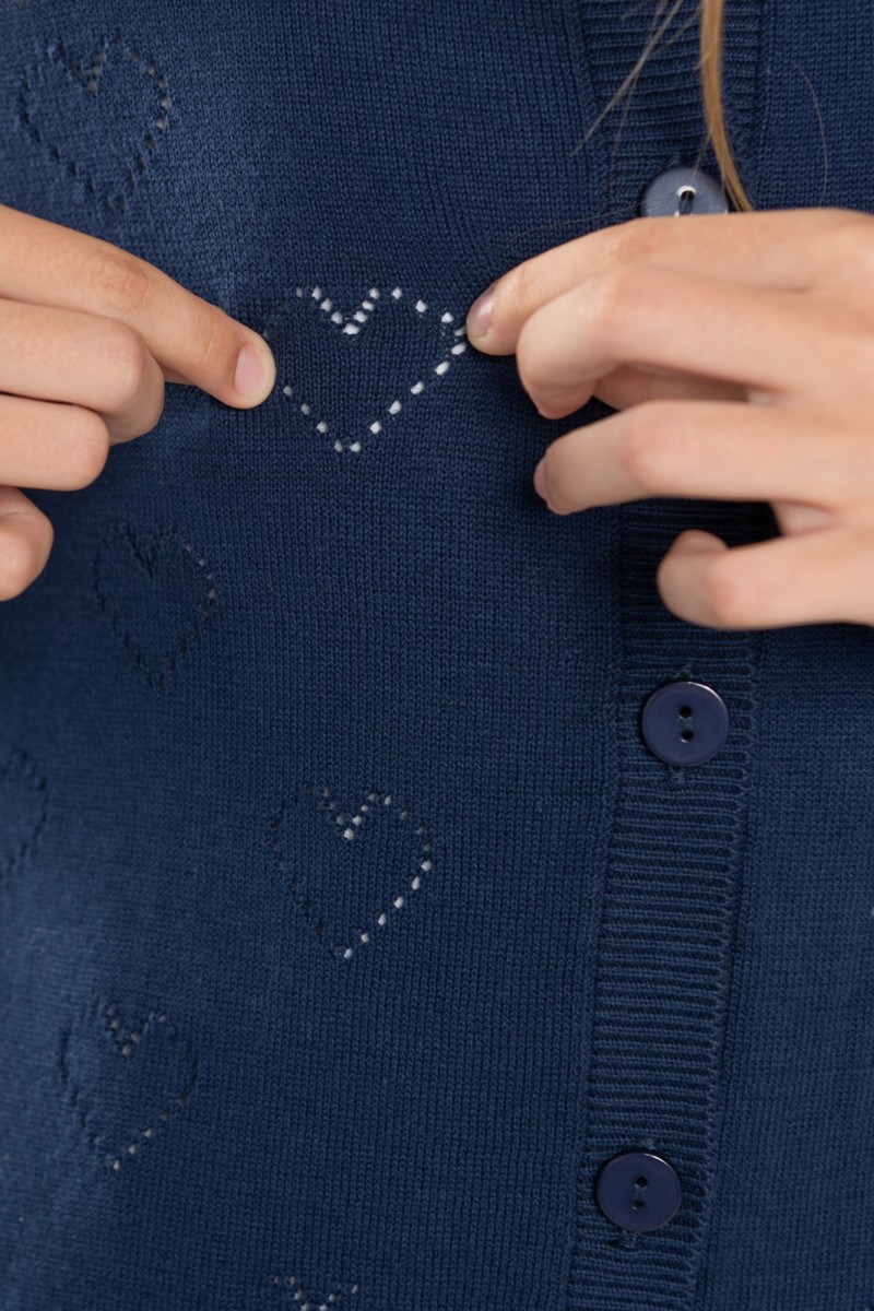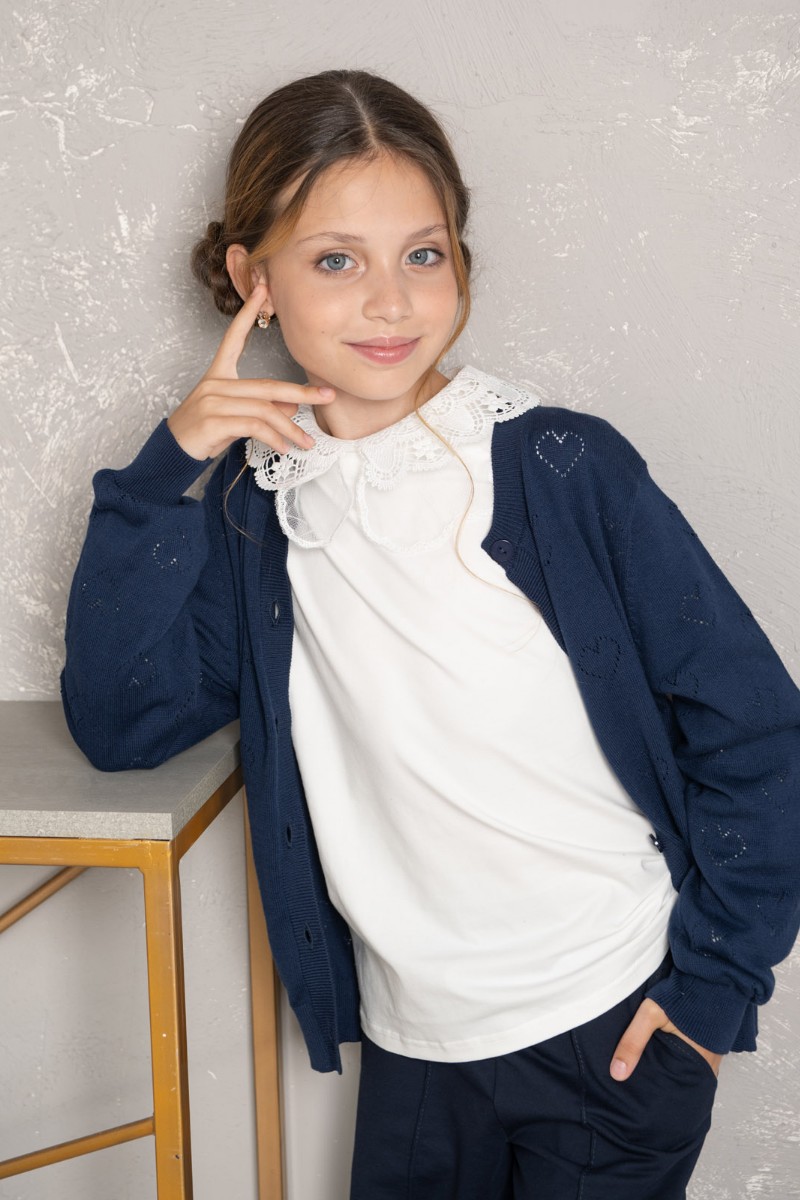 Представляем Вашему вниманию школьный жакет "Hearts", выполненный из мягкого трикотажа глубокого синего цвета. Ажурный узор с сердечками придаёт наряду нежность и стиль. Удобная застёжка на пуговицы и аккуратная посадка обеспечивают комфорт в течение всего учебного дня.