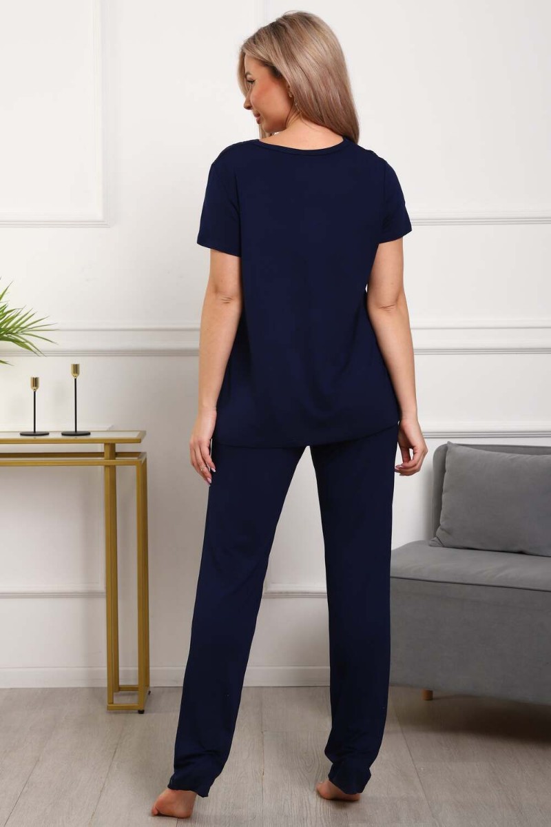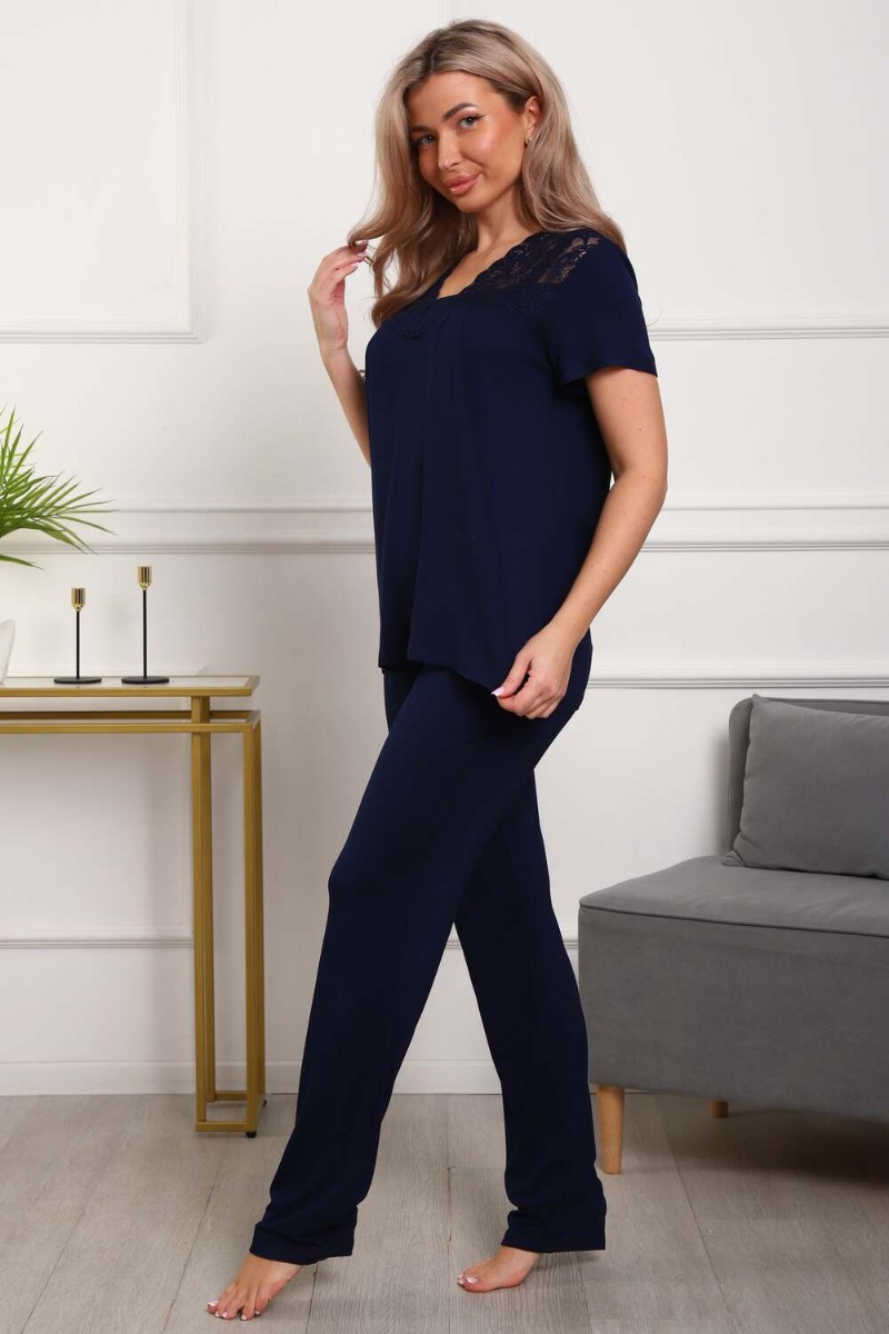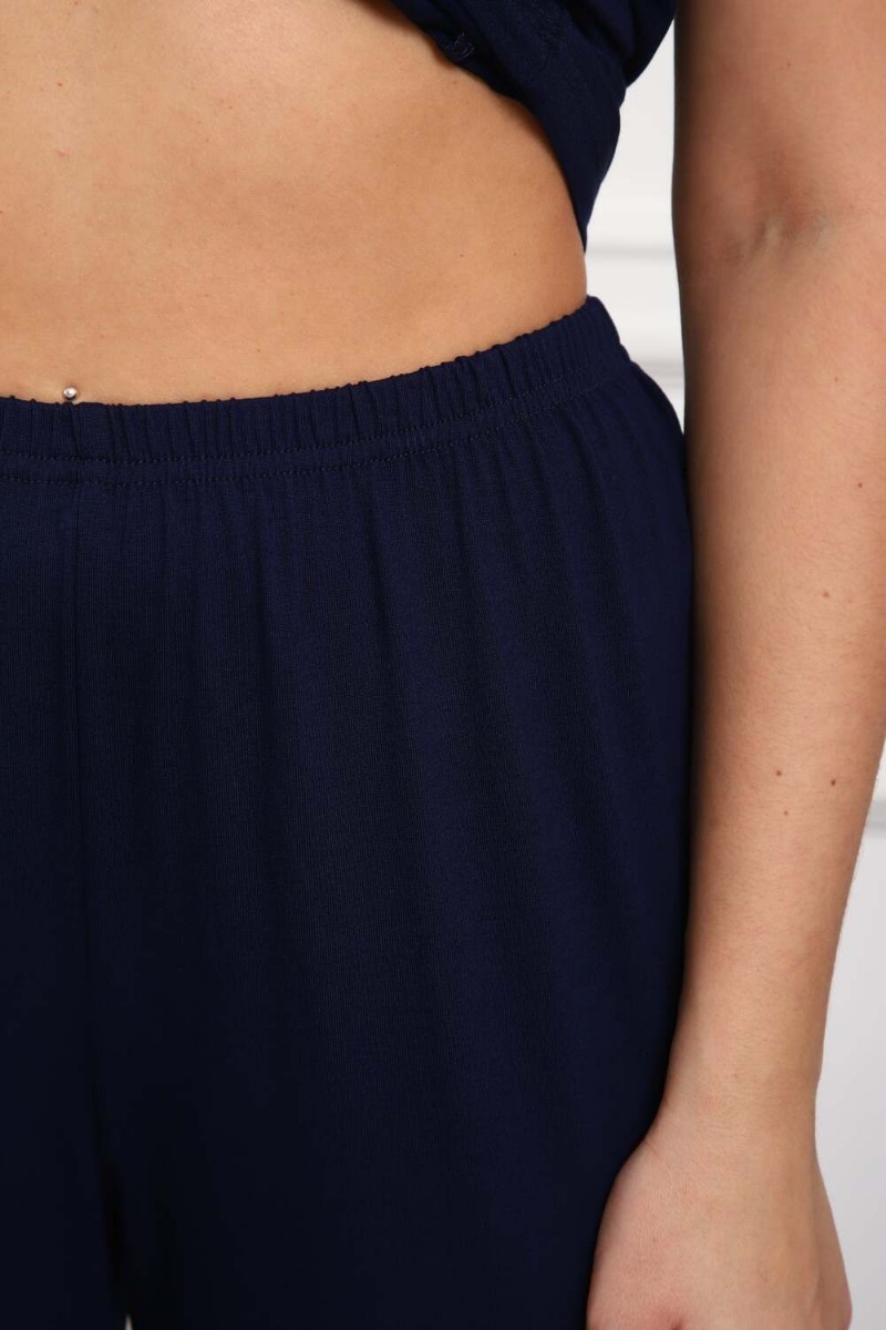 Представляем Вашему вниманию женскую пижаму из вискозы. Состоит из туники и брюк. Верх прямого силуэта, чуть расклешённый к низу, ниже середины бедра. Рукав короткий. Горловина V-образной формы, отделана кружевом. Низ прямой. Брюки прямые, зауженные к низу. Пояс цельнокроеный, на естественном месте.