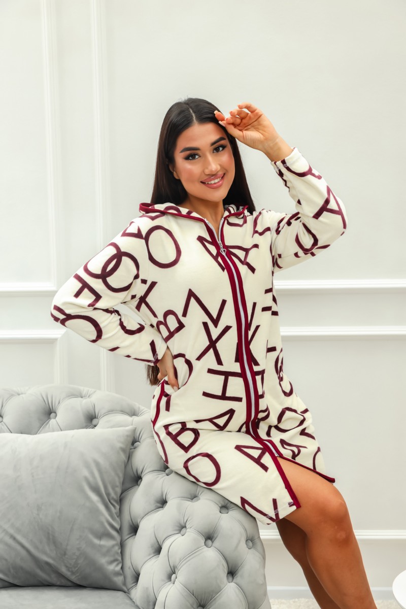 Представляем Вашему вниманию халат на молнии с капюшоном выполнен из велюра с принтом Буквы. Халат окантован тканью контрастного цвета, рукав длинный подшит. Халат комфортный, уютный, мягкий, идеально подойдет для дома и отдыха.