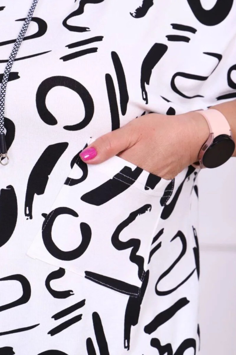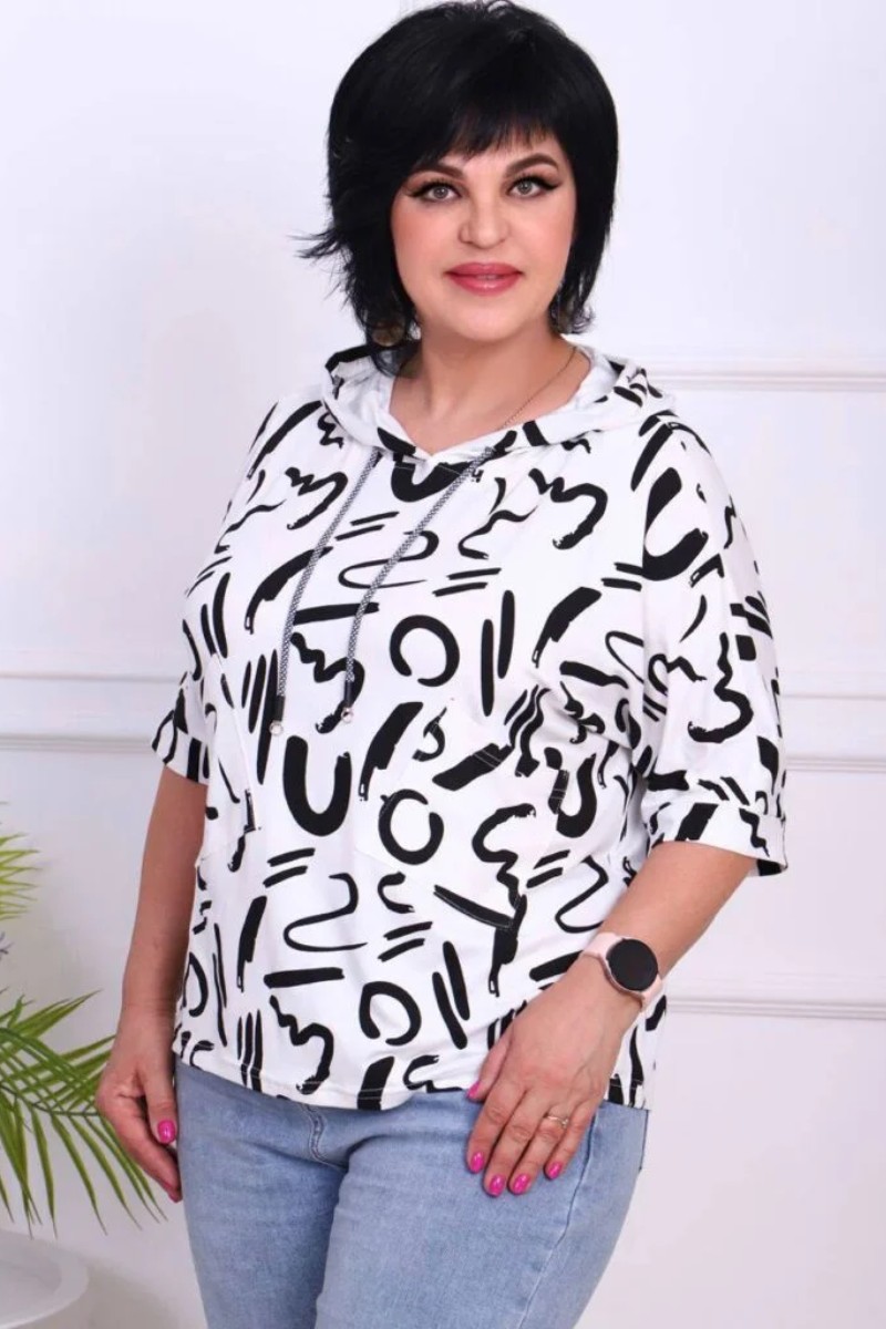 Представляем Вашему вниманию повседневную кофту больших размеров, с капюшоном, украшенную абстрактным принтом абстрактные буквы. Сшита из нежной турецкой ткани, которая приятно струиться по телу. Отлично сочетается с любым низом.