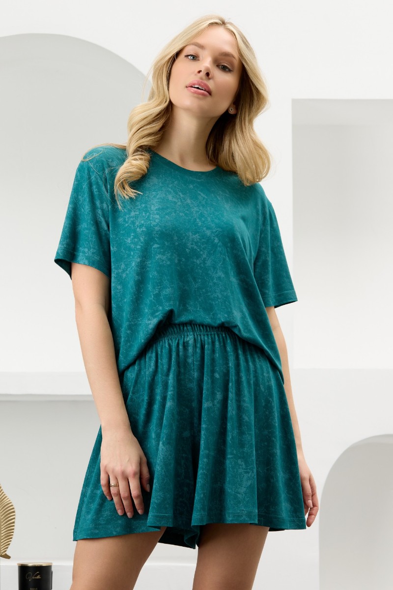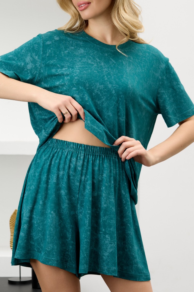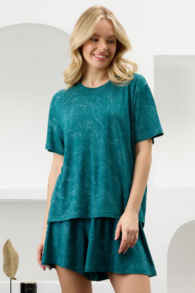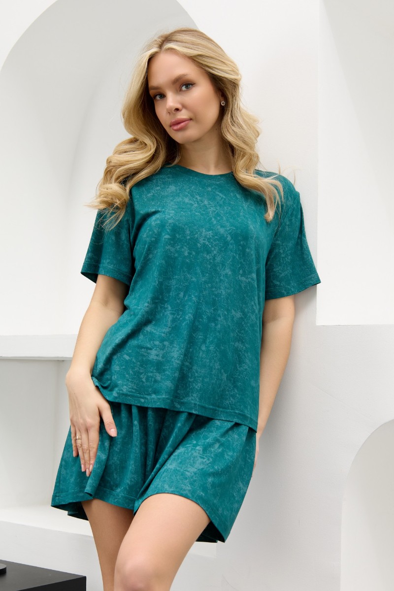 Представляем Вашему вниманию костюм женский в комбинации двух видов полотен: из гладкокрашенного трикотажного вискозного полотна с эффектом «варенка», состоящий из футболки и шорт. Футболка - классического покроя, с короткими втачными рукавами, горловиной овальной формы, обработанной втачной планкой.Шорты – свободные, средней длины, с эластичной тесьмой по талии.