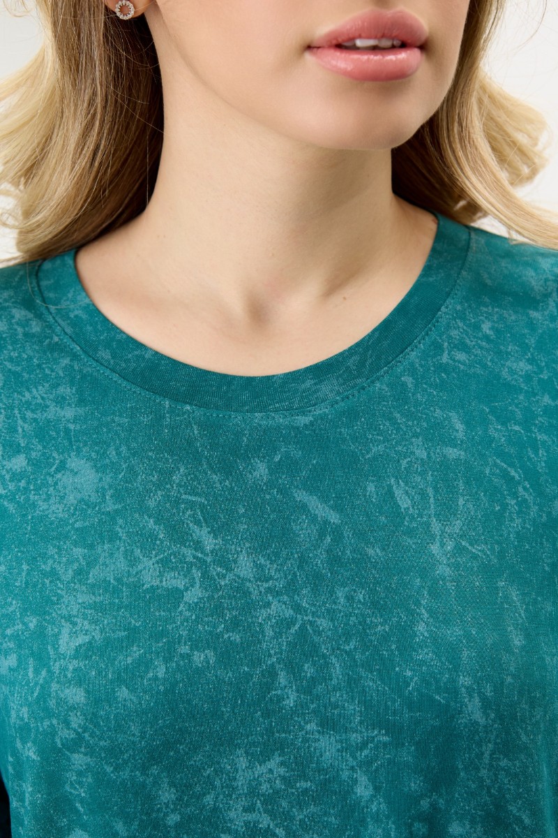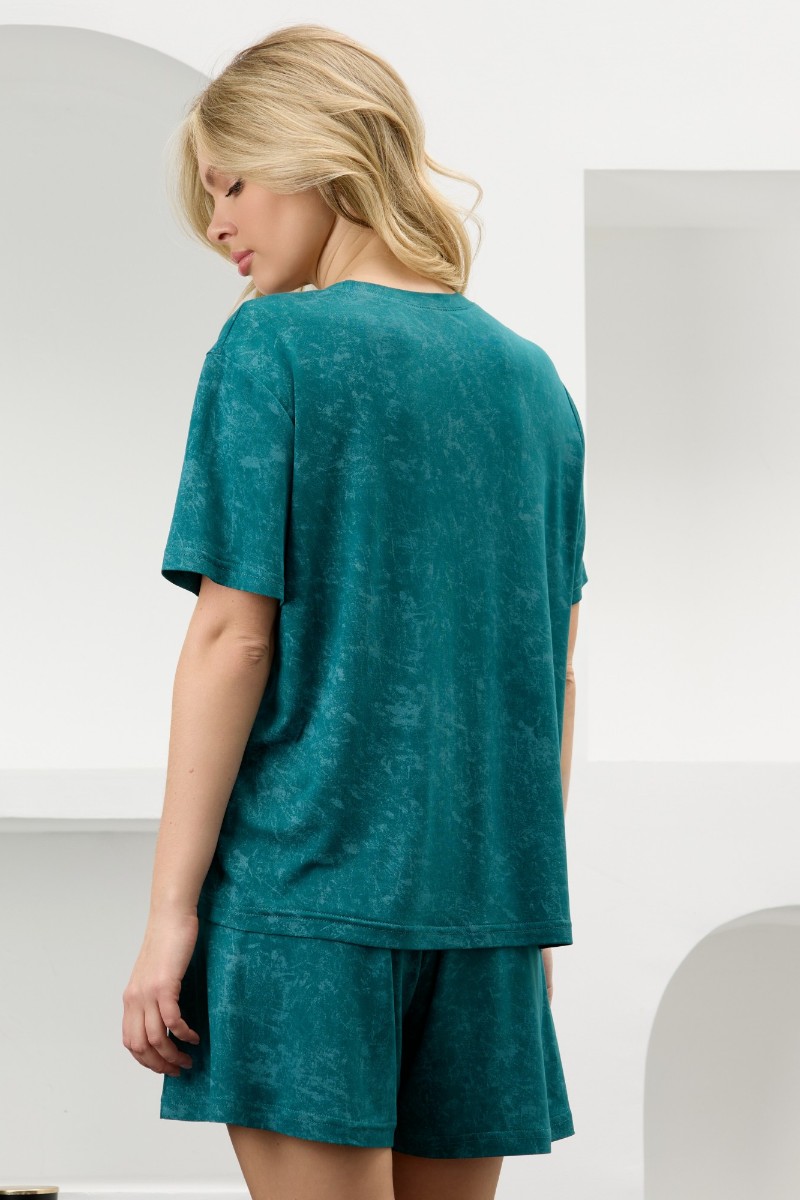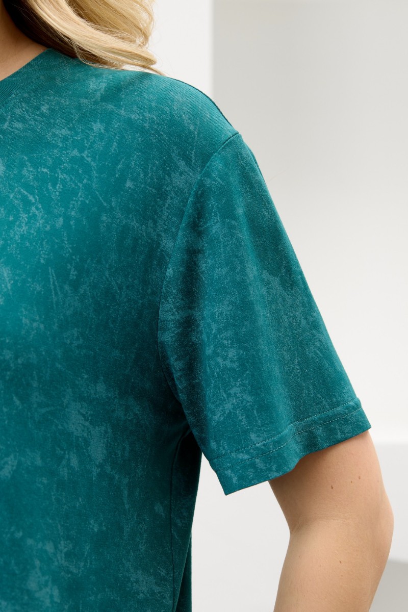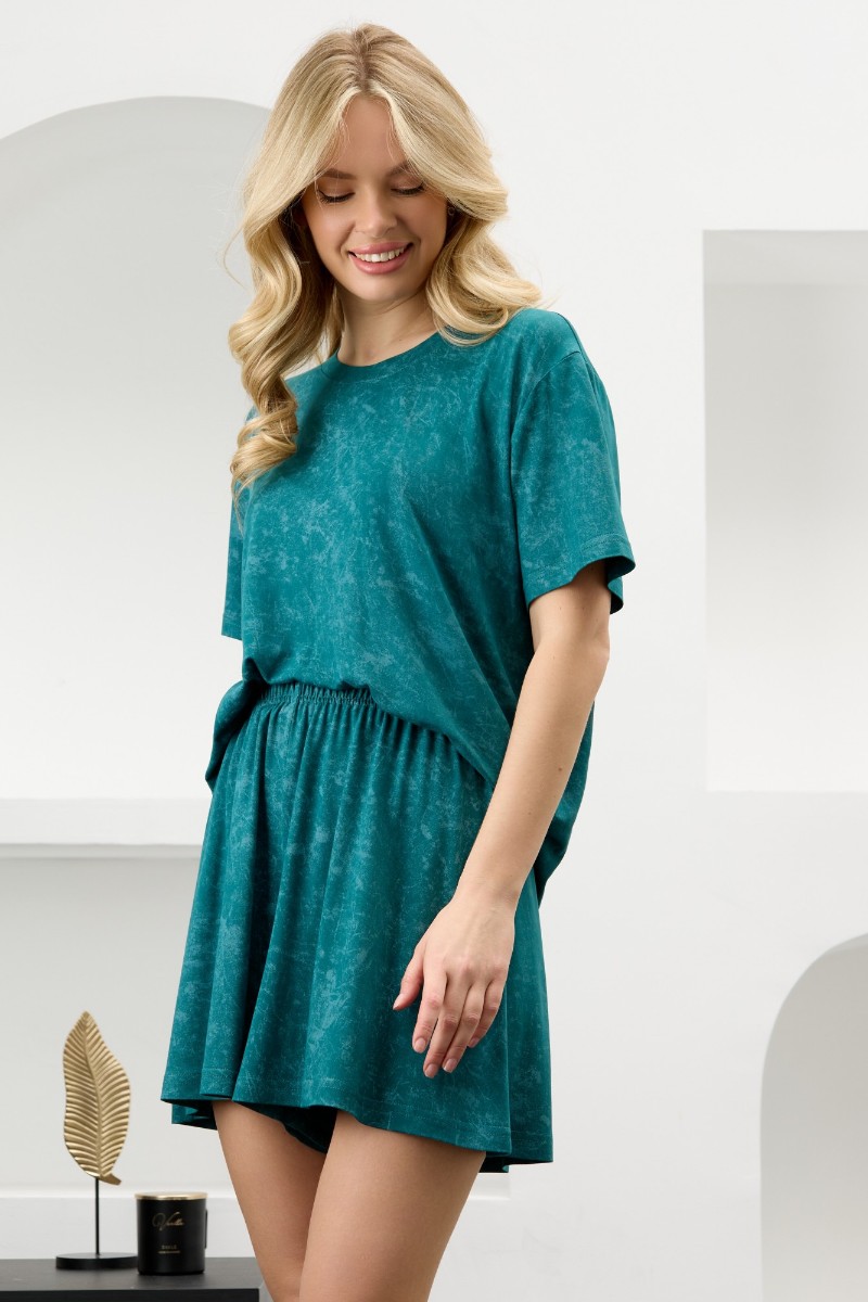 Представляем Вашему вниманию костюм женский в комбинации двух видов полотен: из гладкокрашенного трикотажного вискозного полотна с эффектом «варенка», состоящий из футболки и шорт. Футболка - классического покроя, с короткими втачными рукавами, горловиной овальной формы, обработанной втачной планкой.Шорты – свободные, средней длины, с эластичной тесьмой по талии.