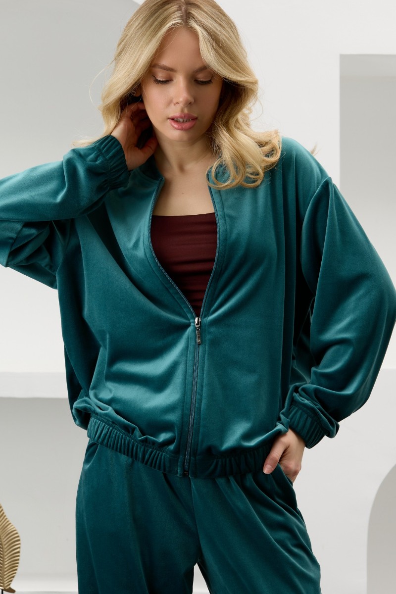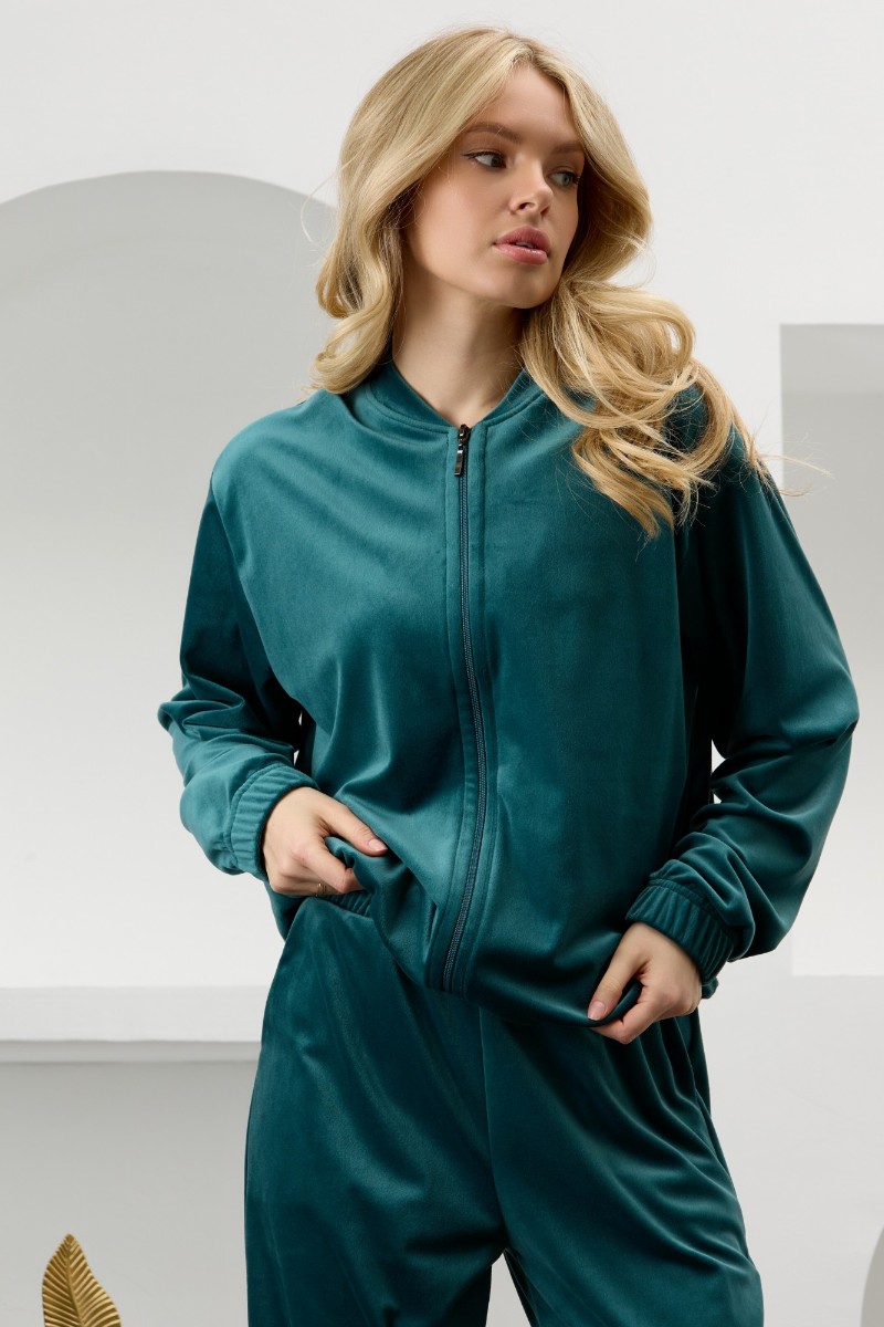 Представляем Вашему вниманию костюм молодежный из гладкокрашенного полотна «велюр-стрейч», Куртка-бомбер прямого силуэта, свободная, с длинными втачными рукавами, горловиной овальной формы, обработанной втачной планкой, центральной бортовой застежкой на тесьму «молния». Низ изделия и нижние срезы рукавов обработаны подгибкой с вложением широкой эластичной тесьмы.Брюки – длинные, с карманами в боковых швах, на притачном поясе с эластичной тесьмой внутри. Нижние срезы обработаны подгибкой с вложением эластичной тесьмы.