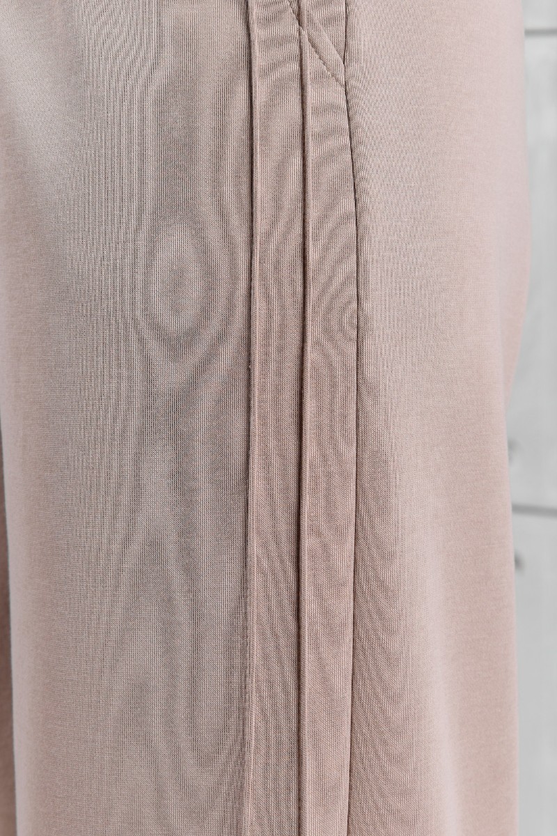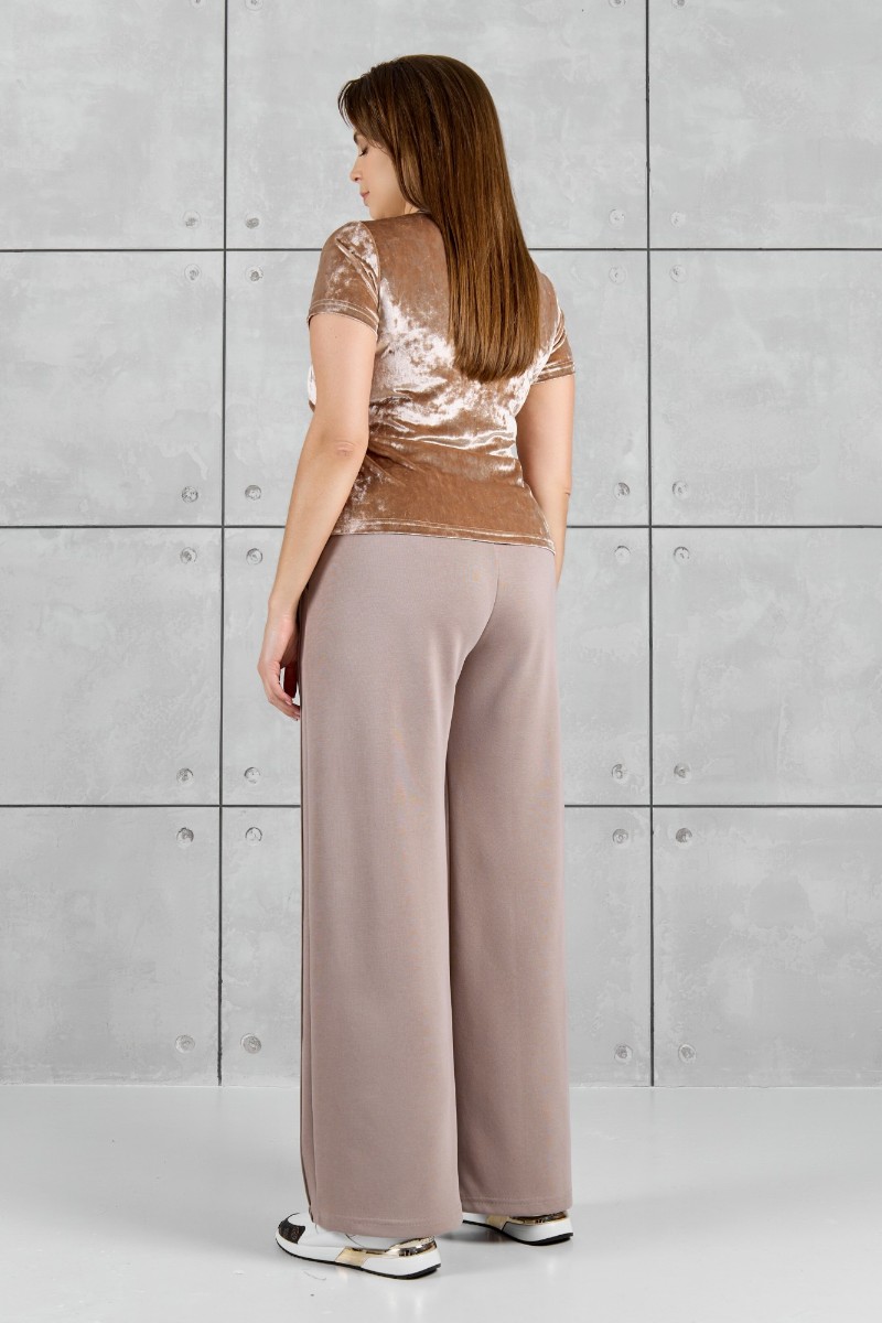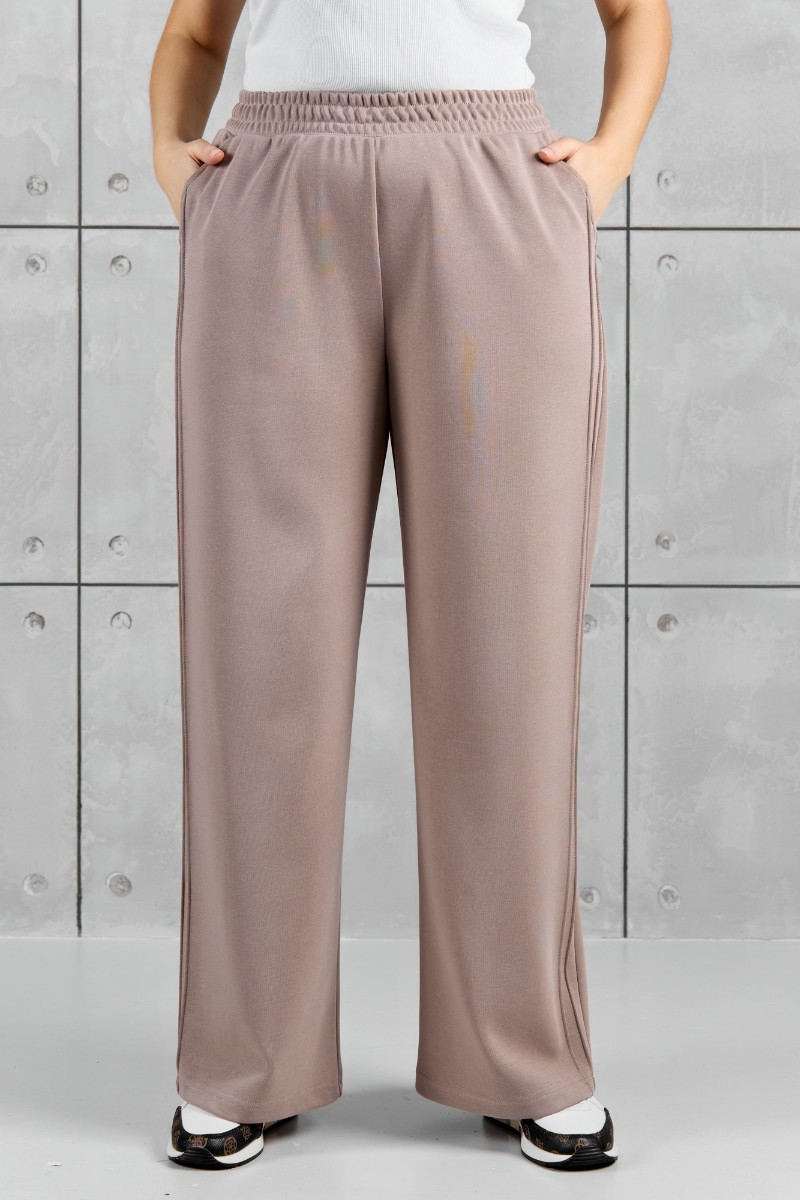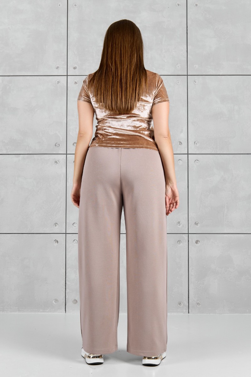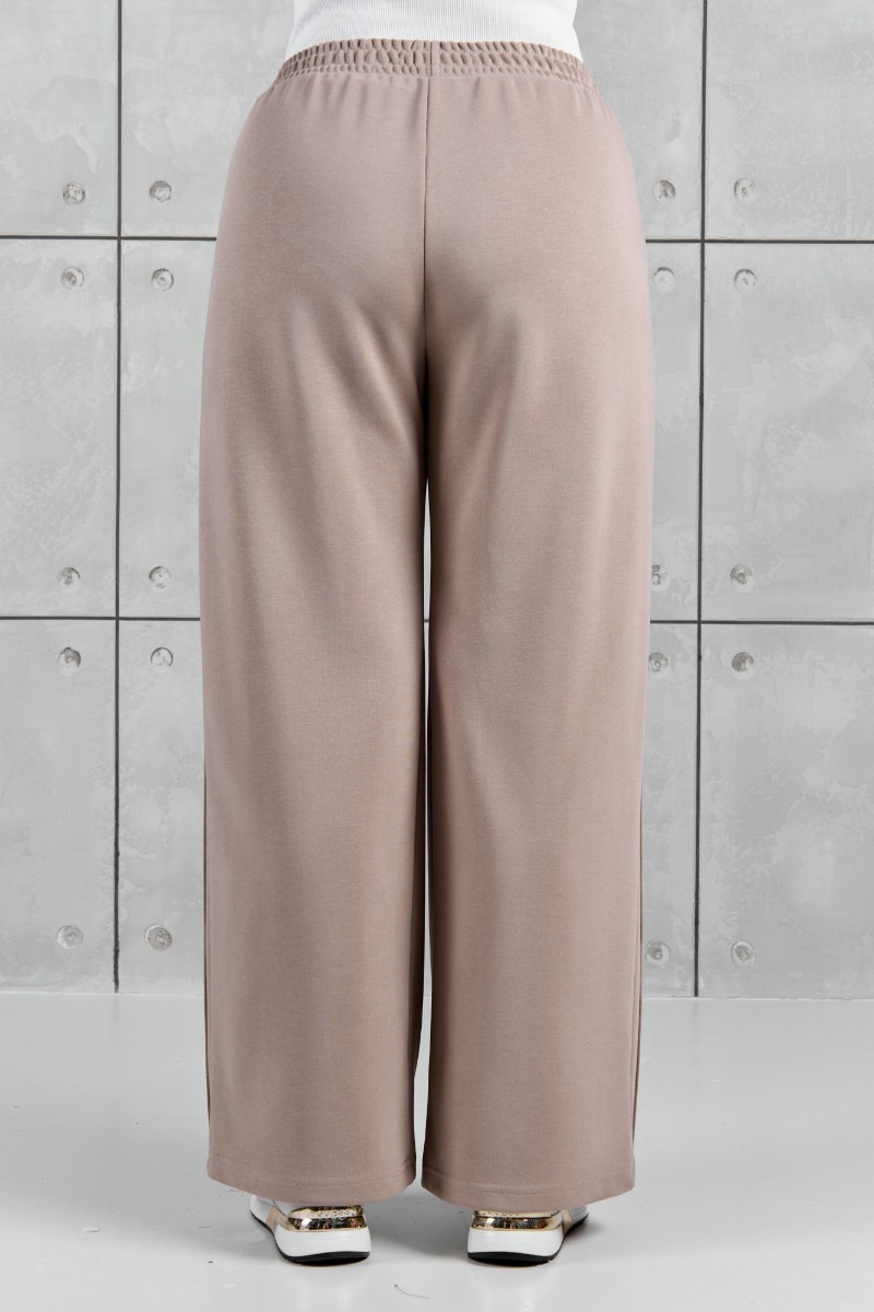 Представляем Вашему вниманию брюки женские из гладкокрашенного трикотажного полотна «лининг» прямого кроя, длинные, свободные, расширенные к низу, на поясе с эластичной тесьмой внутри, карманами в боковых швах. Передние половины застрочены двумя параллельными линиями, смещенными к боковым швам.