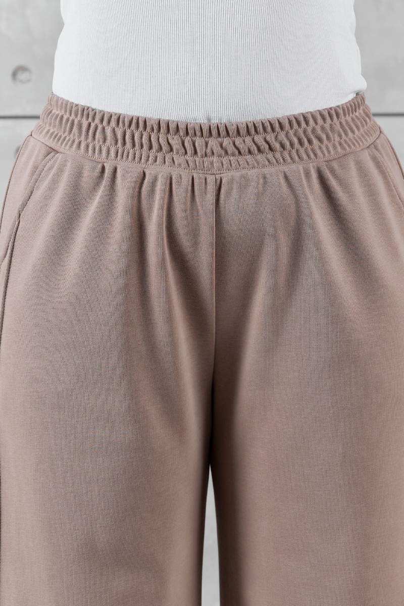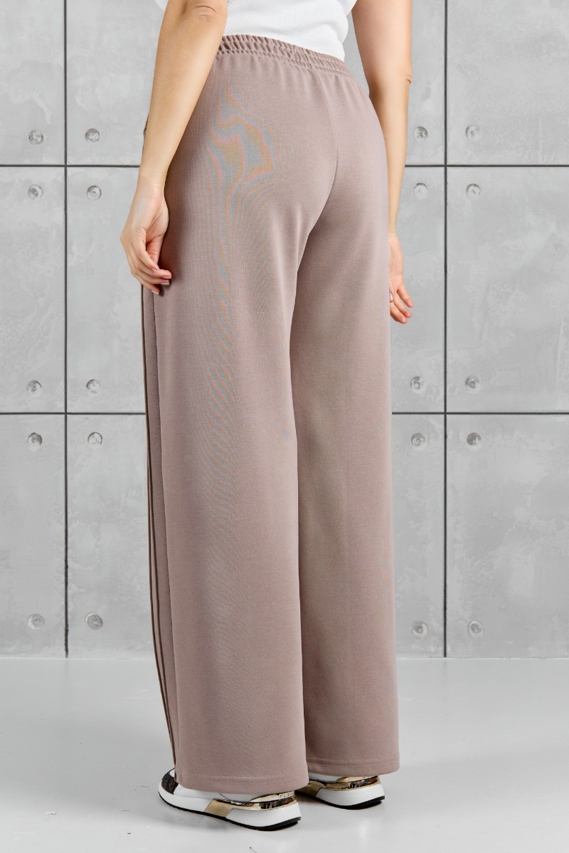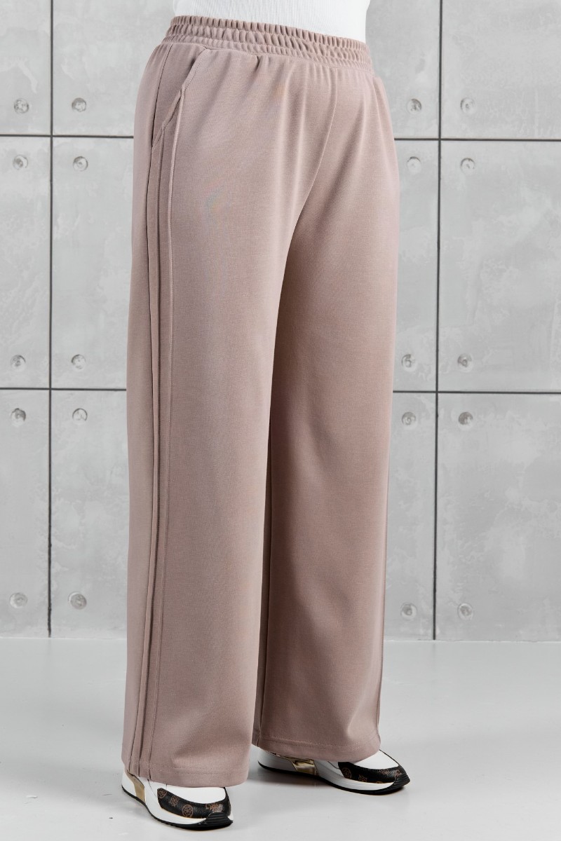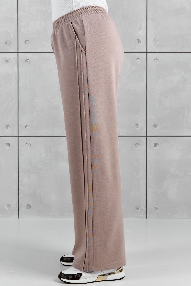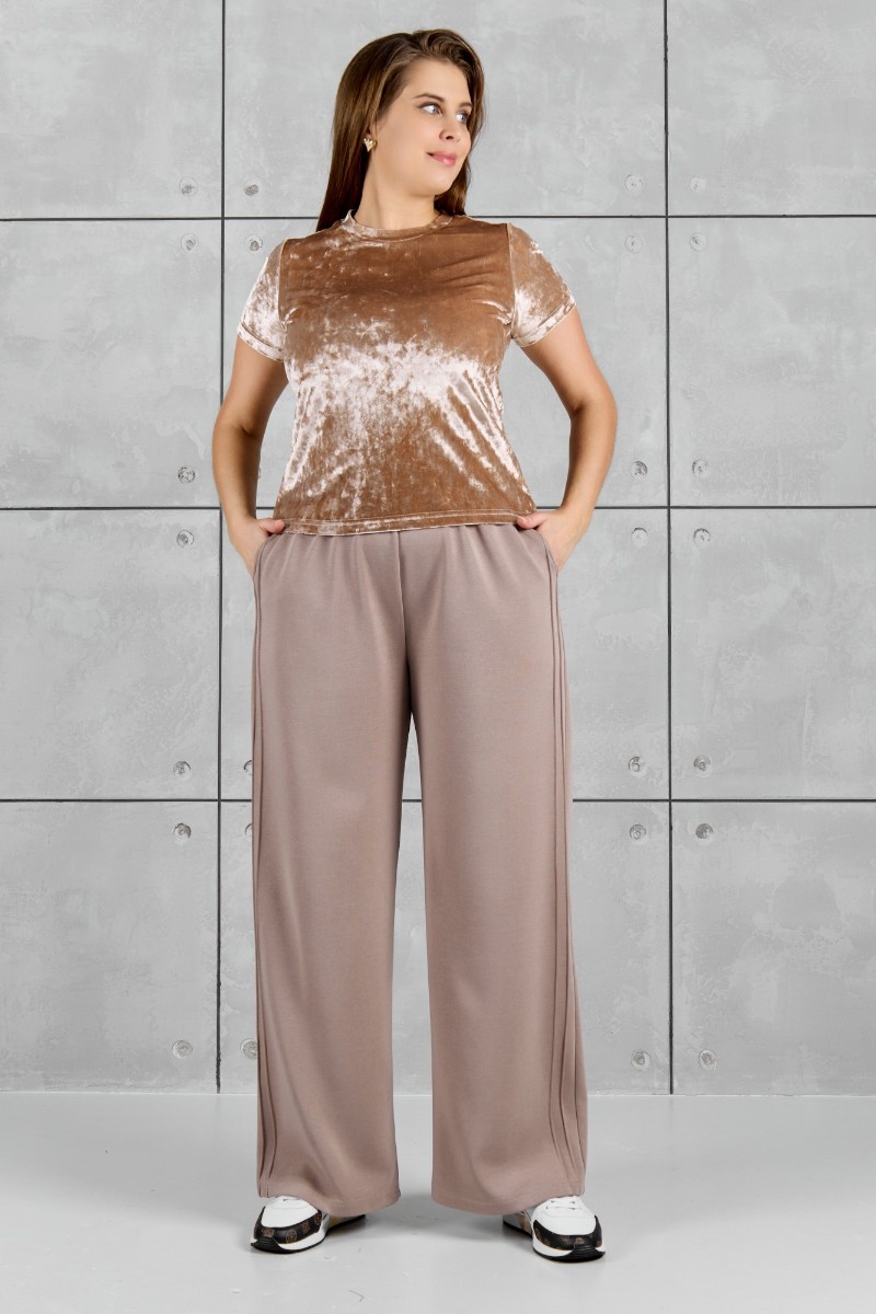 Представляем Вашему вниманию брюки женские из гладкокрашенного трикотажного полотна «лининг» прямого кроя, длинные, свободные, расширенные к низу, на поясе с эластичной тесьмой внутри, карманами в боковых швах. Передние половины застрочены двумя параллельными линиями, смещенными к боковым швам.