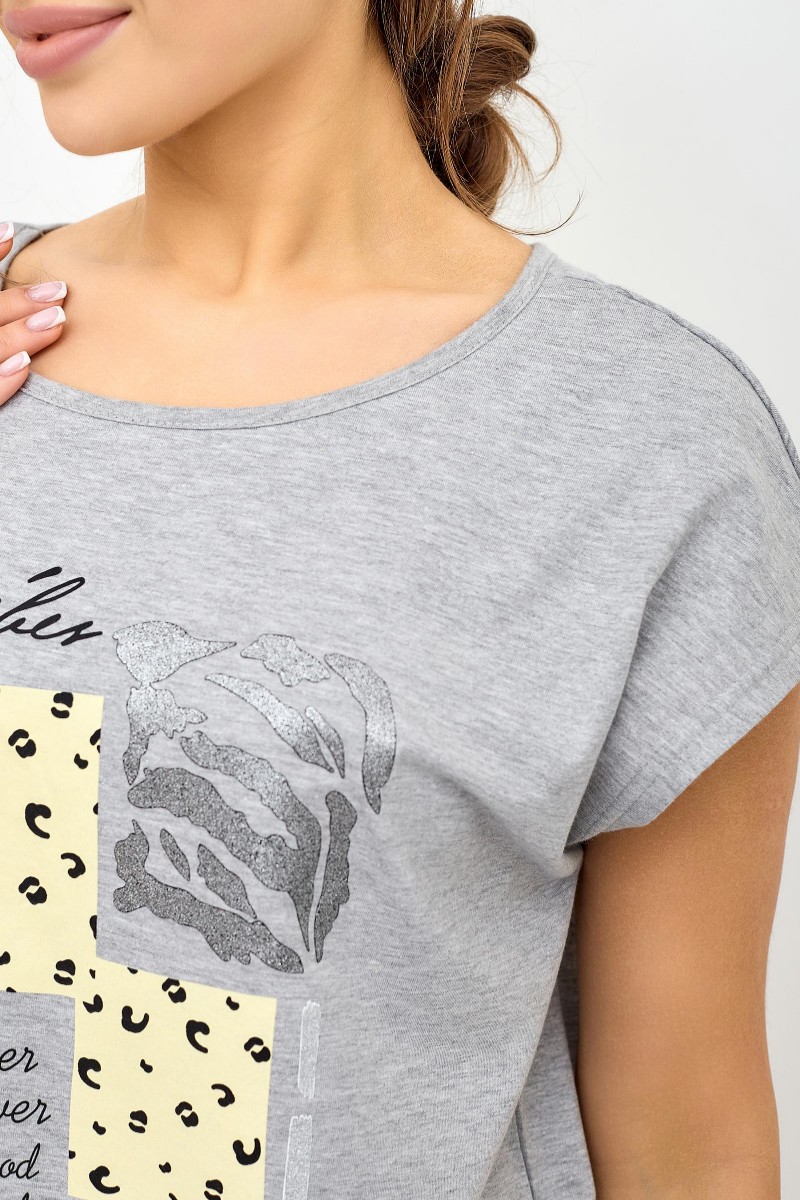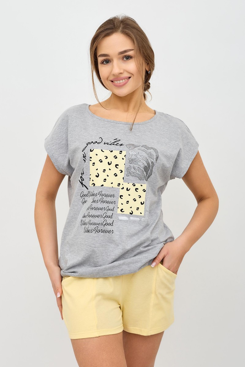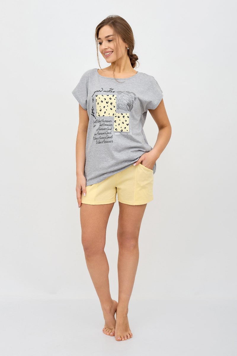 Представляем Вашему вниманию изящную женскую пижаму, которая состоит из футболки и шорт. Комплект имеет интересную расцветку, которая красиво смотрится и поднимает настроение. Пижама хорошо сидит на фигуре и подчеркивает её достоинства. Сон в ней будет максимально комфортным и расслабляющим.