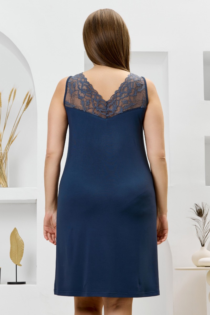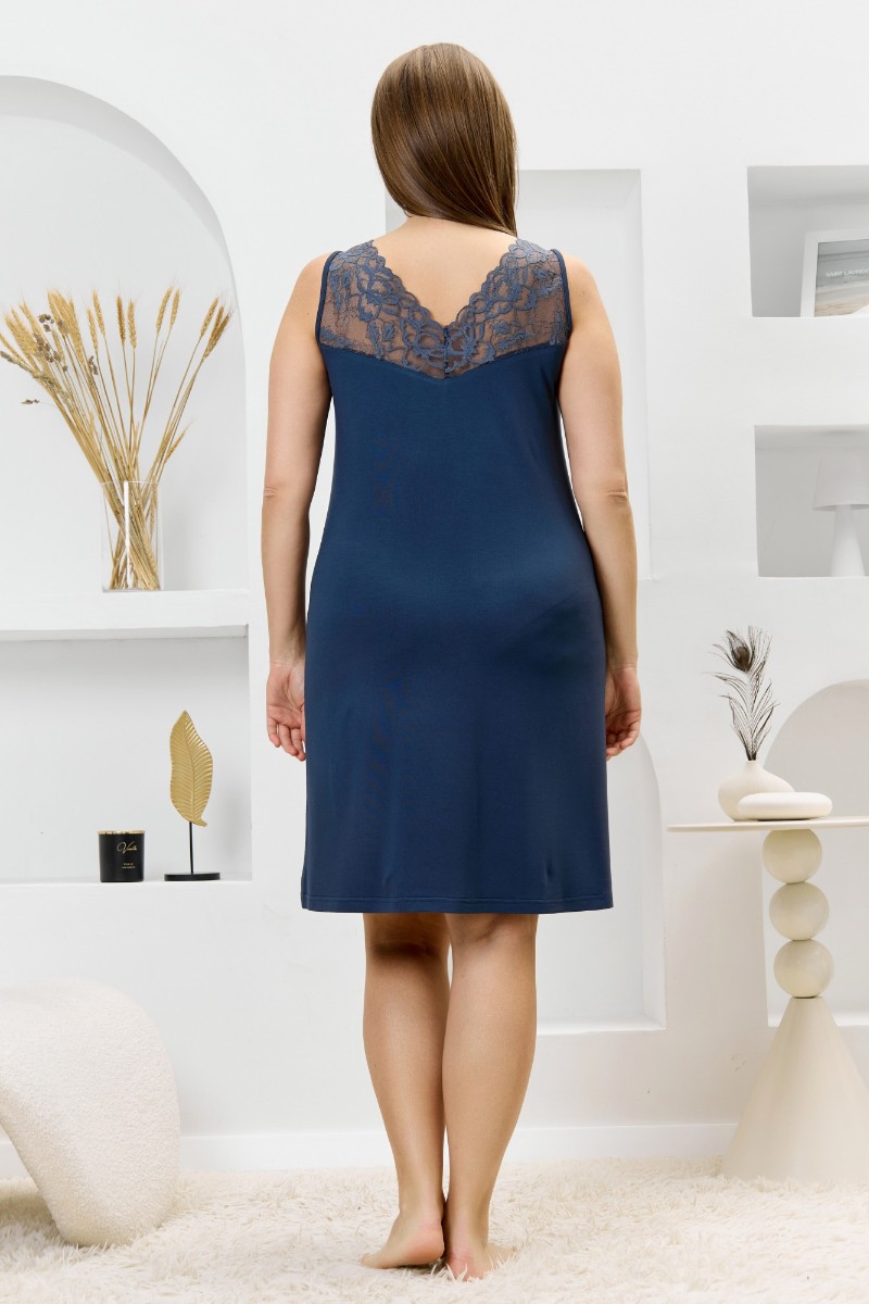 Представляем Вашему вниманию женскую сорочку из гладкокрашеного трикотажного вискозного полотна, без рукавов, полуприталенного силуэта, слегка расширенная книзу. V-образная горловина полочки и спинки отделана кружевными кокетками треугольной формы. Проймы окантованы основным материалом.