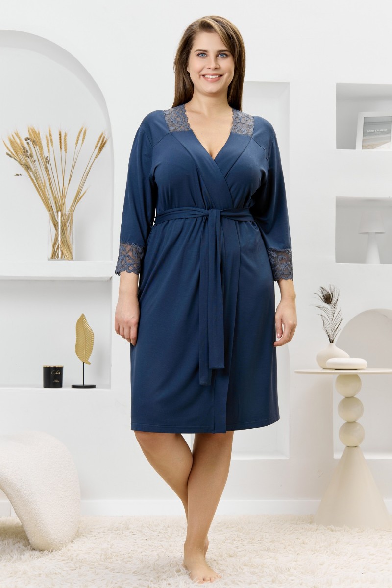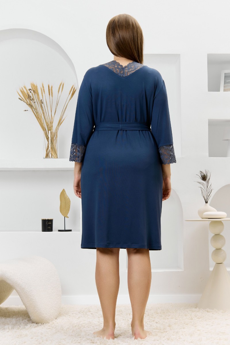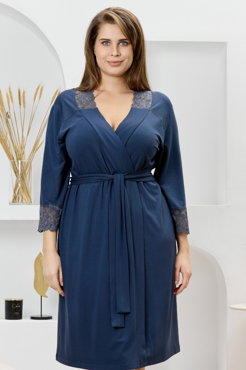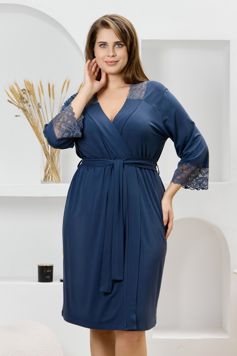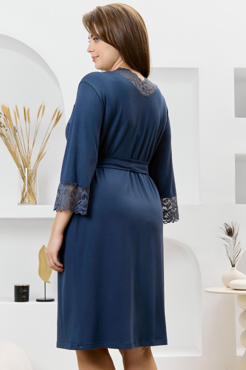 Представляем Вашему вниманию женский халат из гладкокрашеного трикотажного вискозного полотна, на запахе, с втачными рукавами 3/4 длины, кружевными манжетами, притачной планкой по бортовым срезам и съемным поясом, продетым через две шлевки в боковых швах. Спинка с кружевной притачной кокеткой - V-образной формы, бортовая планка с кружевными вставками, переходящими на полочку.