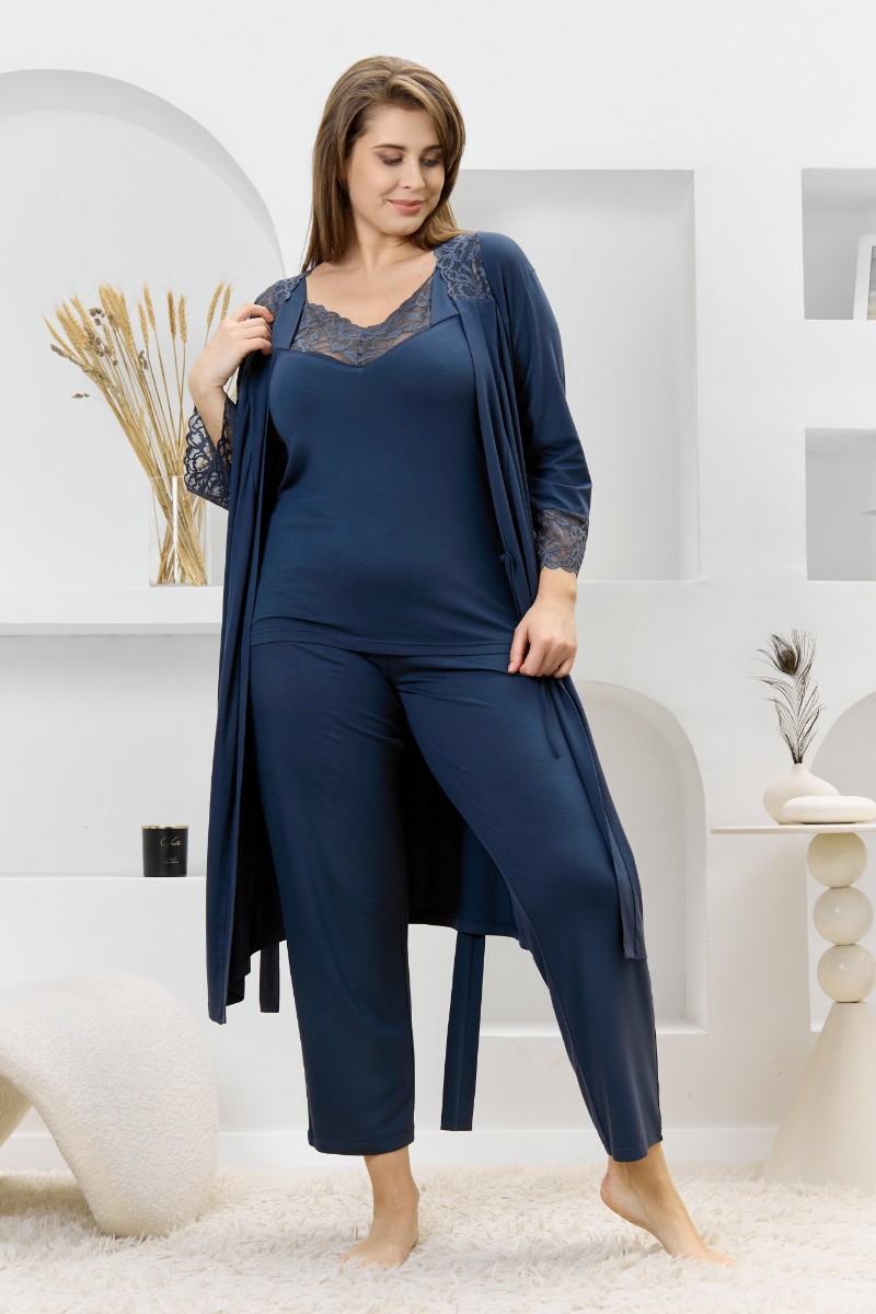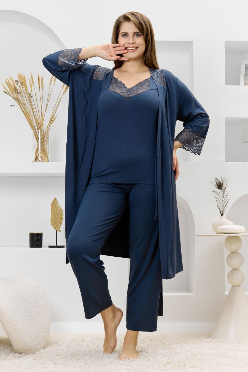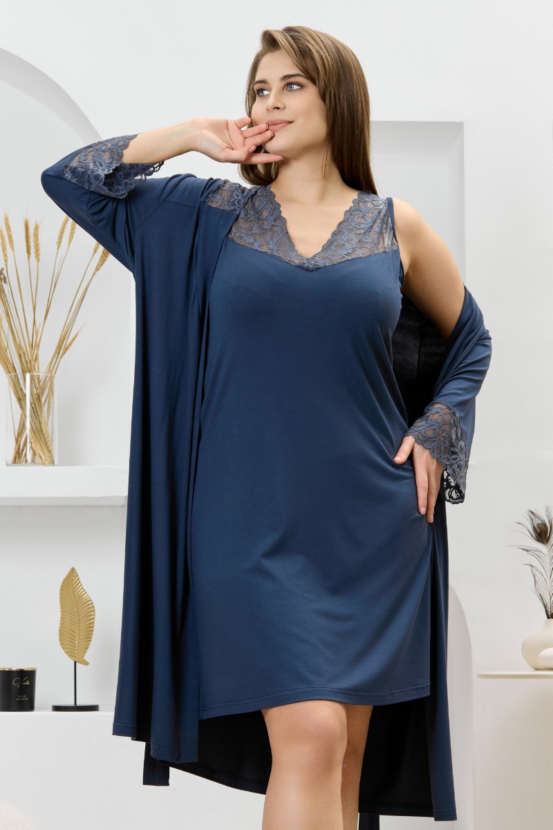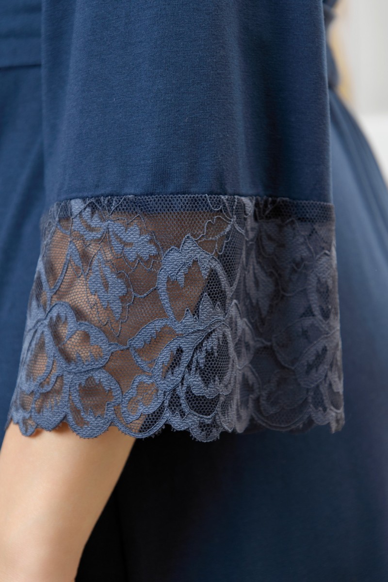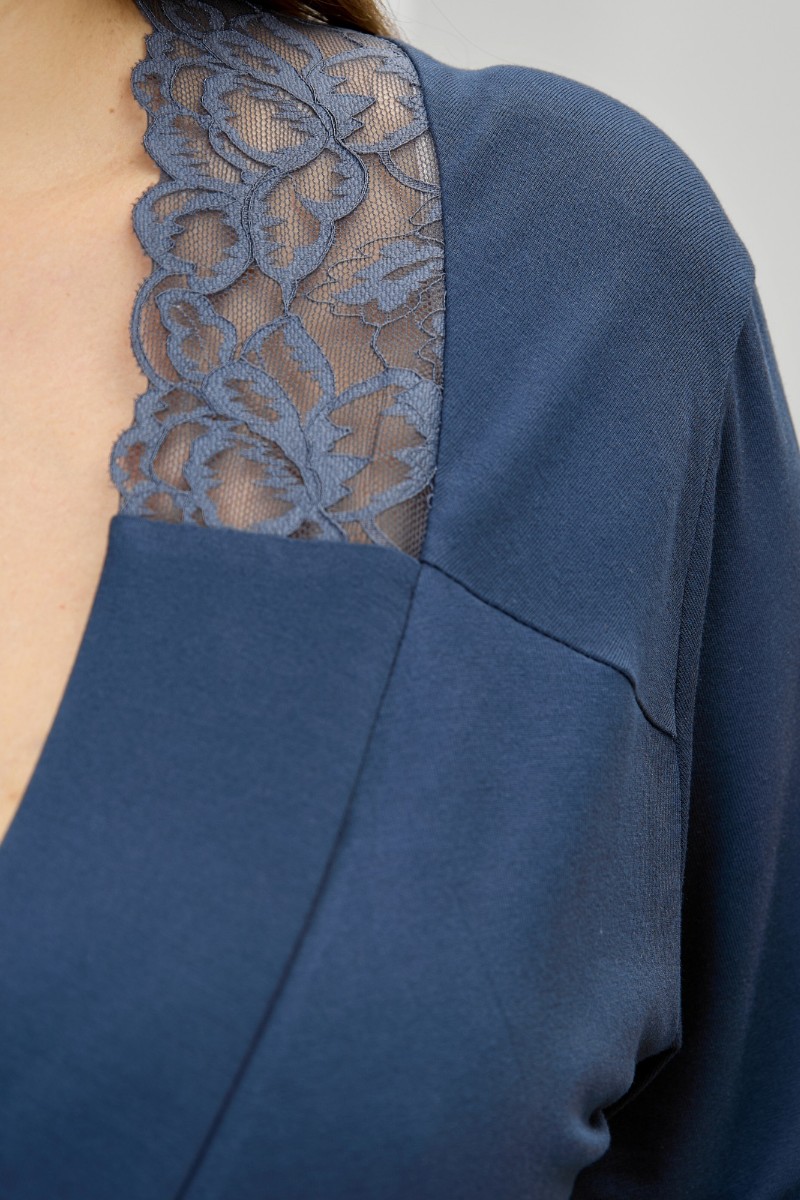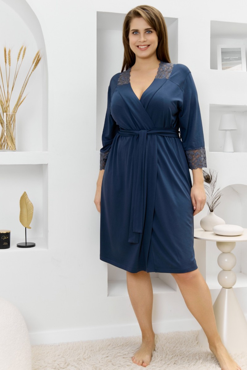Представляем Вашему вниманию женский халат из гладкокрашеного трикотажного вискозного полотна, на запахе, с втачными рукавами 3/4 длины, кружевными манжетами, притачной планкой по бортовым срезам и съемным поясом, продетым через две шлевки в боковых швах. Спинка с кружевной притачной кокеткой - V-образной формы, бортовая планка с кружевными вставками, переходящими на полочку.