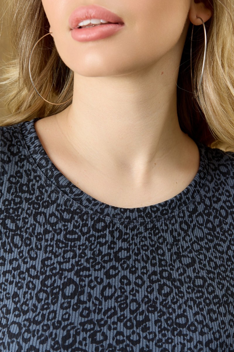 Представляем Вашему вниманию женскую майку из трикотажного полотна «рибана» с набивным «леопардовым» рисунком, укороченная, с горловиной овальной формы. Проймы и горловина изделия обработаны притачными планками с отделочными строчками по швам притачивания.