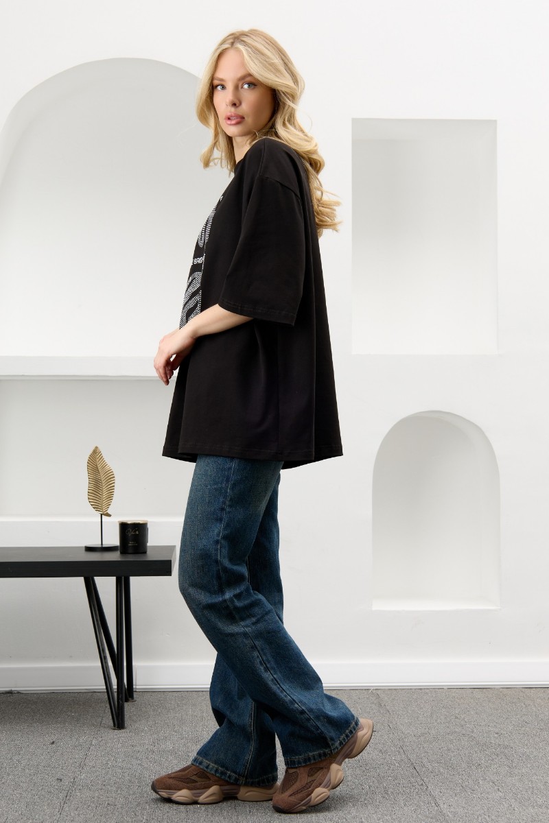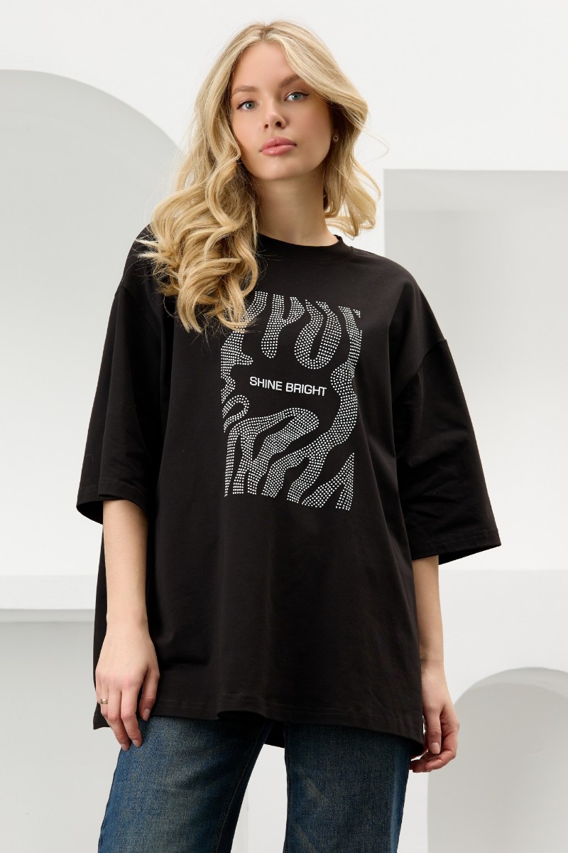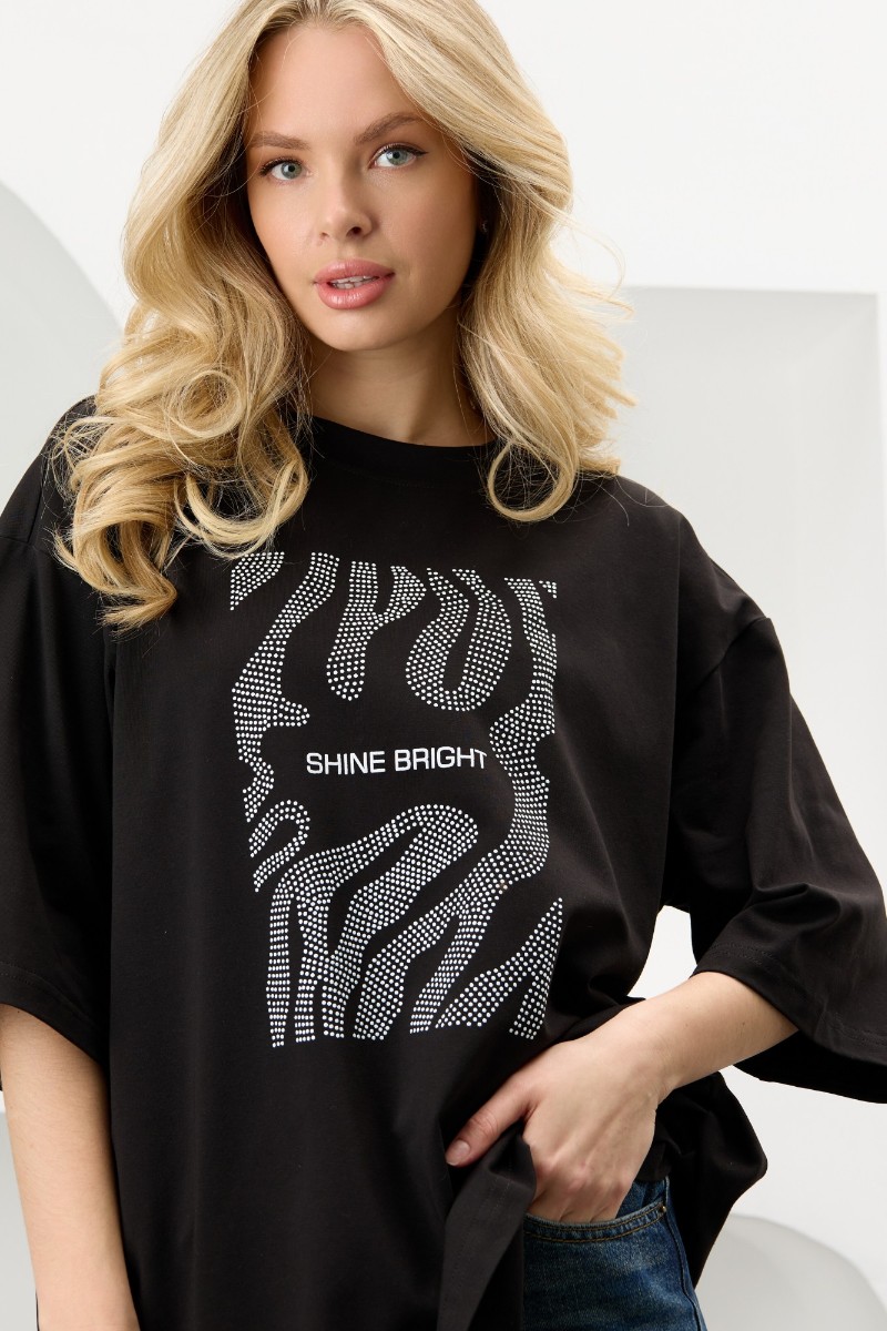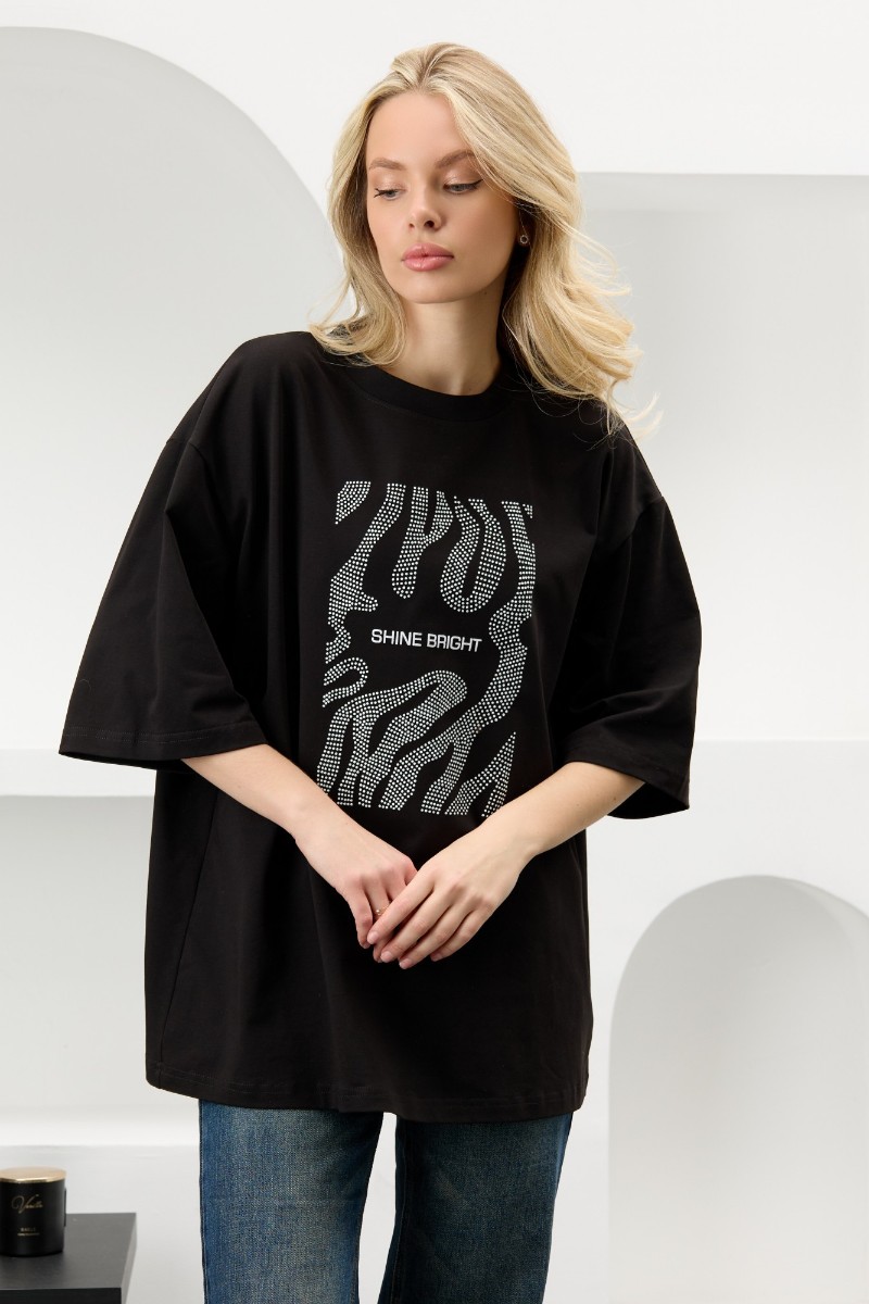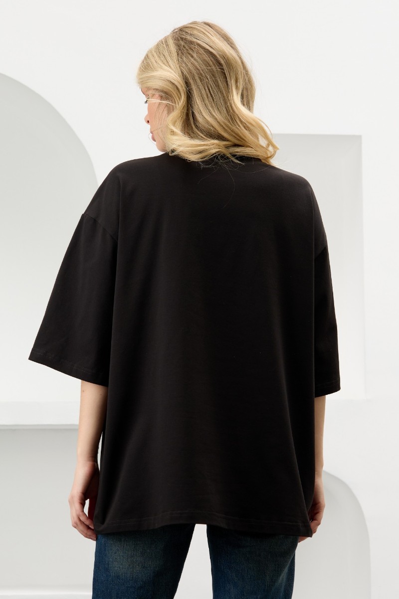Представляем Вашему вниманию женскую футболку из гладкокрашенного трикотажного полотна «кулирка» с лайкрой, свободная покроя «оверсайз», с горловиной овальной формы, обработанной притачной планкой, рукавами длиной до локтя. На полочке выполнена печать в технике «шелкографии».