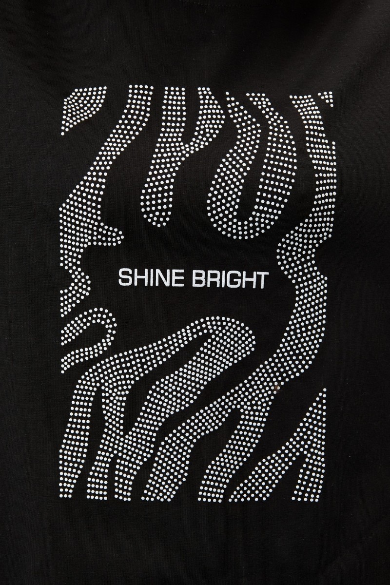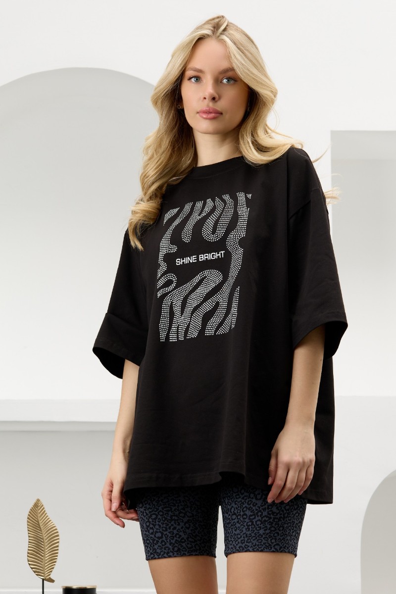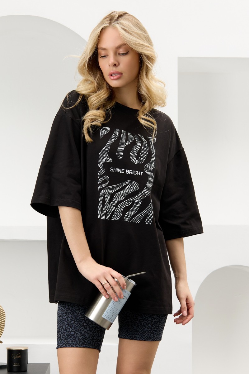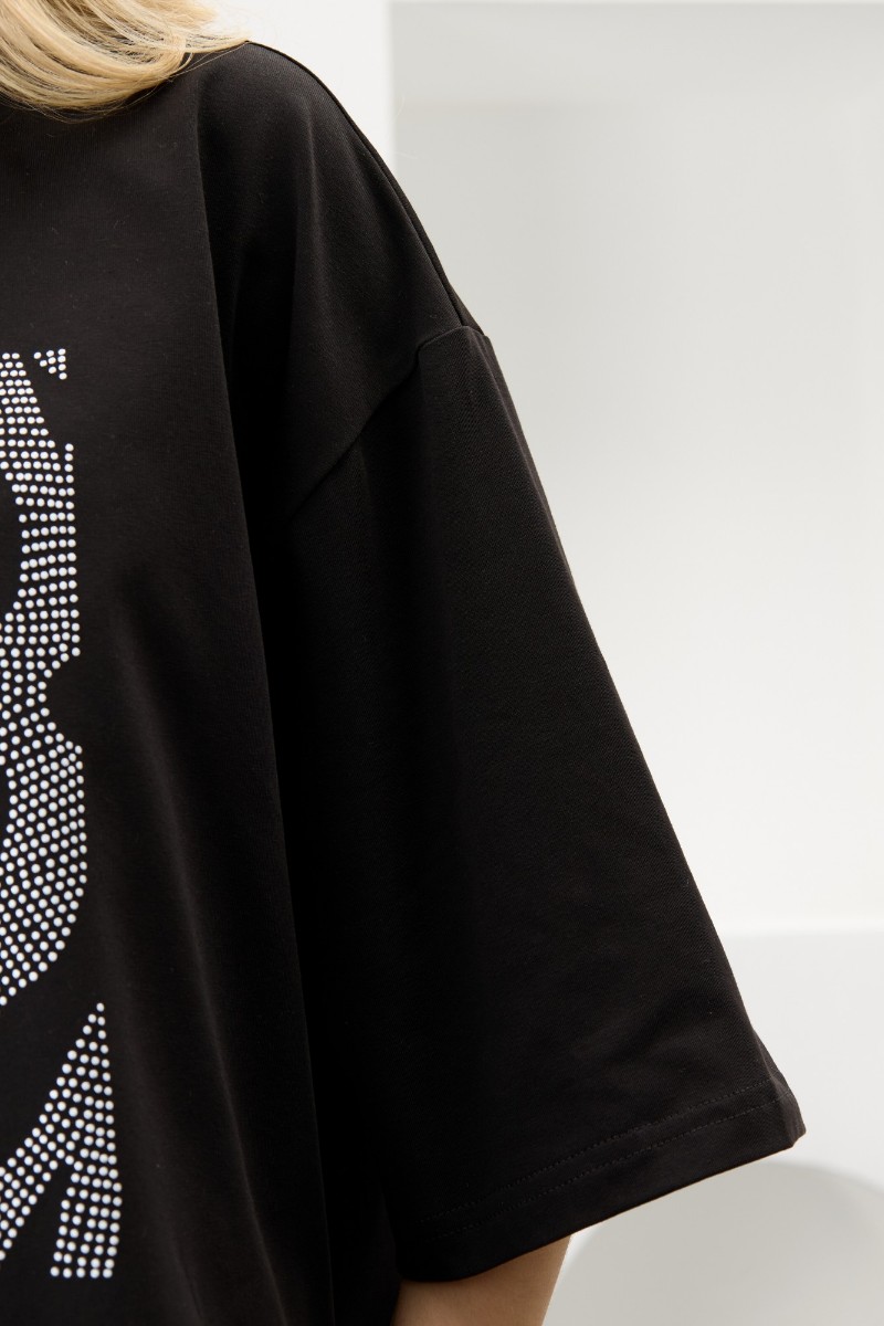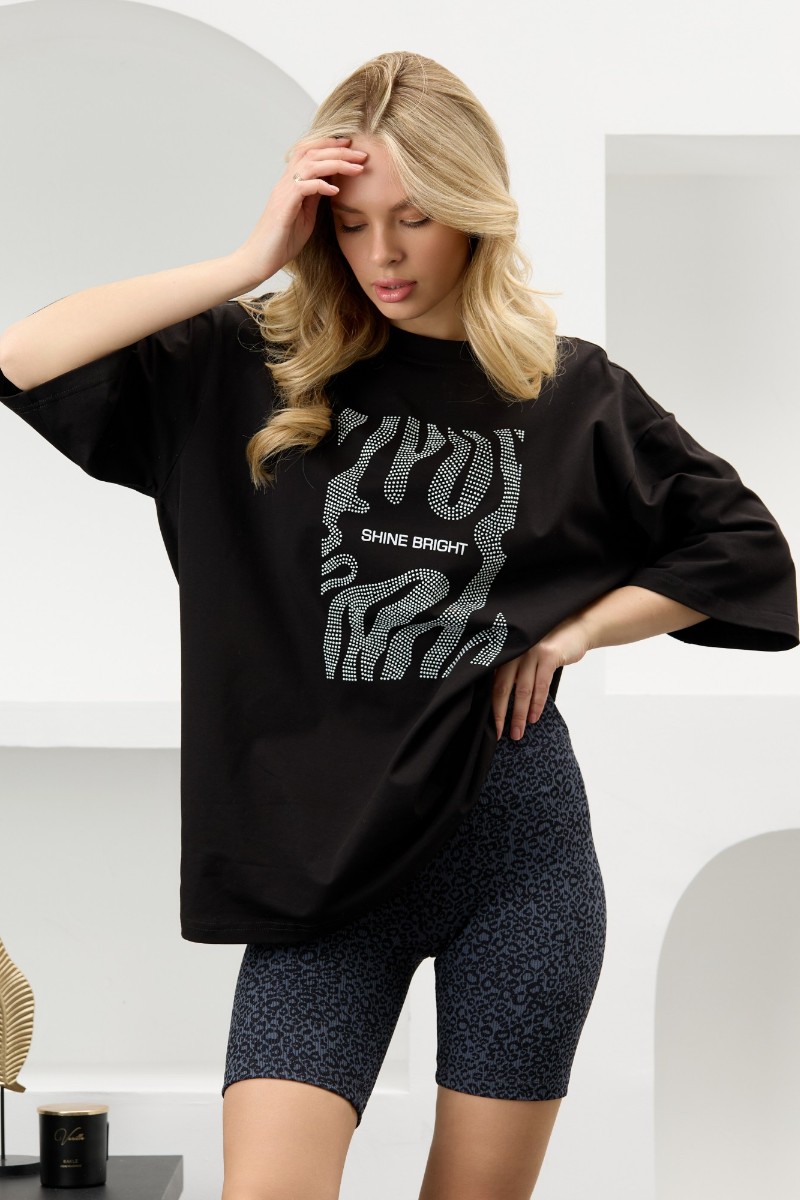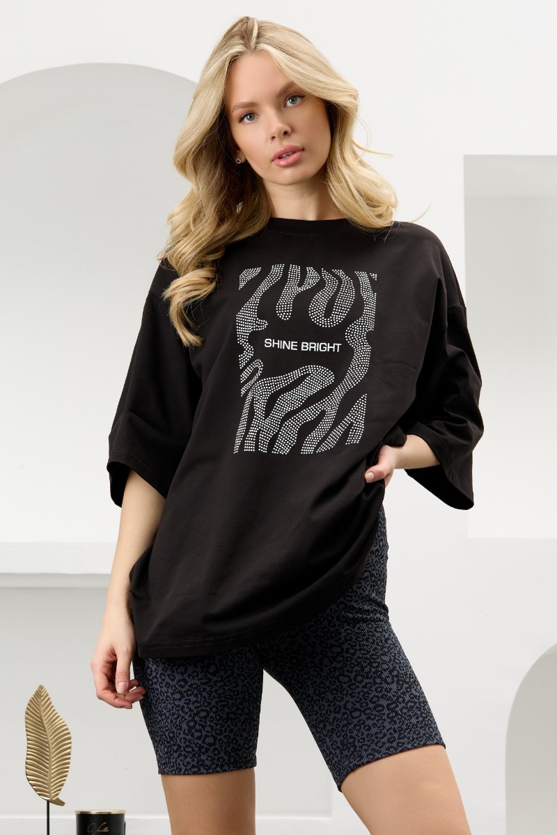 Представляем Вашему вниманию женскую футболку из гладкокрашенного трикотажного полотна «кулирка» с лайкрой, свободная покроя «оверсайз», с горловиной овальной формы, обработанной притачной планкой, рукавами длиной до локтя. На полочке выполнена печать в технике «шелкографии».