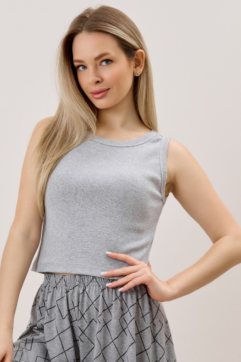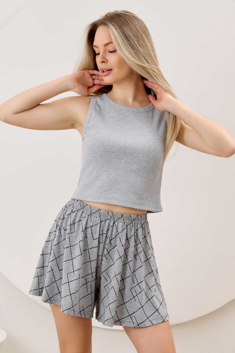 Представляем Вашему вниманию женский костюм из трикотажного полотна двух видов: «кашкорсе» и меланжированной «кулирки», состоящий из майки и шорт. Майка – из гладкокрашеного полотна «кашкорсе», средней длины, с горловиной овальной формы. Срезы пройм и горловина окантованы широкой окантовкой из основного материала. Шорты – из меланжированного полотна «кулирка» с набивным рисунком, средней длины, широкие, с эластичной тесьмой по талии.