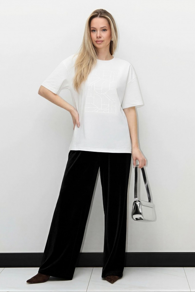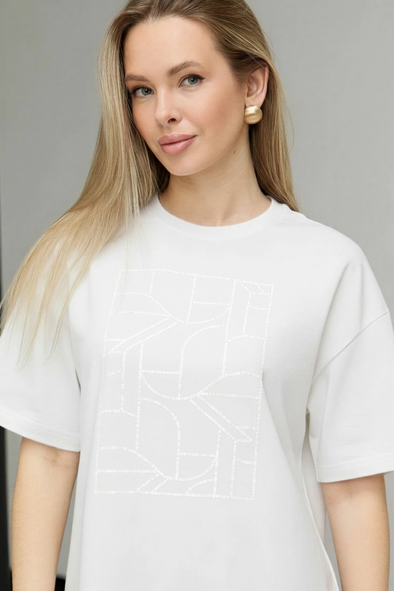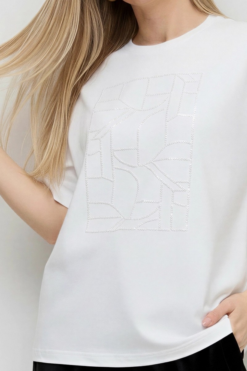 Представляем Вашему вниманию женскую футболку из гладкокрашенного трикотажного полотна «кулирка с лайкрой», свободного покроя, с короткими втачными рукавами, горловиной овальной формы, обработанной втачной планкой. По центру полочки выполнена вышивка «пайетками» в тон изделия.