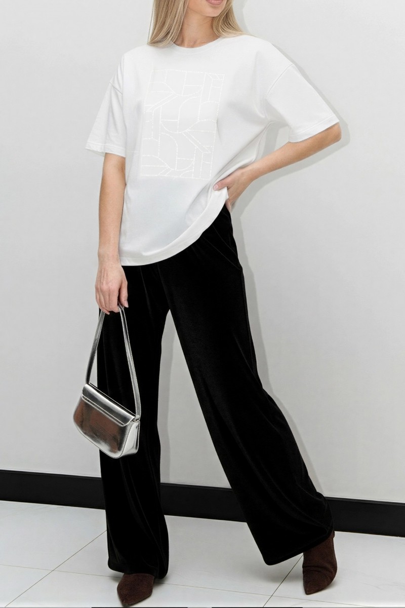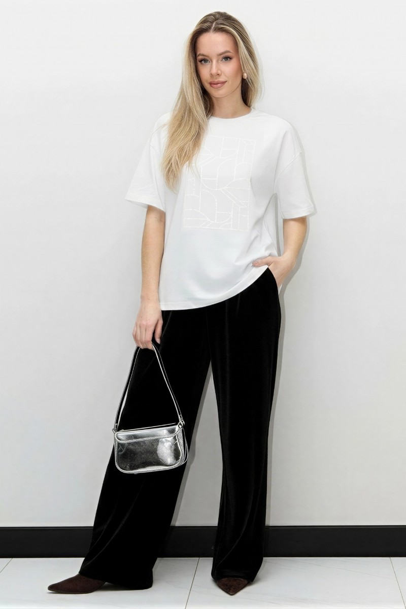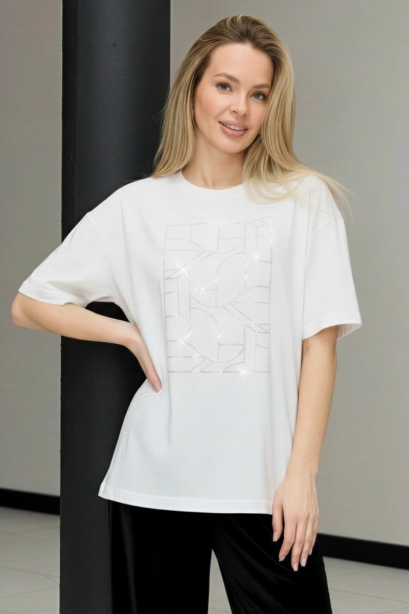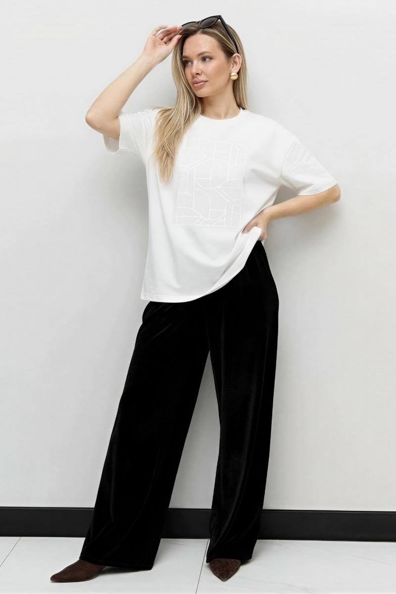 Представляем Вашему вниманию женскую футболку из гладкокрашенного трикотажного полотна «кулирка с лайкрой», свободного покроя, с короткими втачными рукавами, горловиной овальной формы, обработанной втачной планкой. По центру полочки выполнена вышивка «пайетками» в тон изделия.