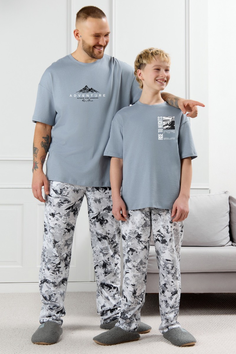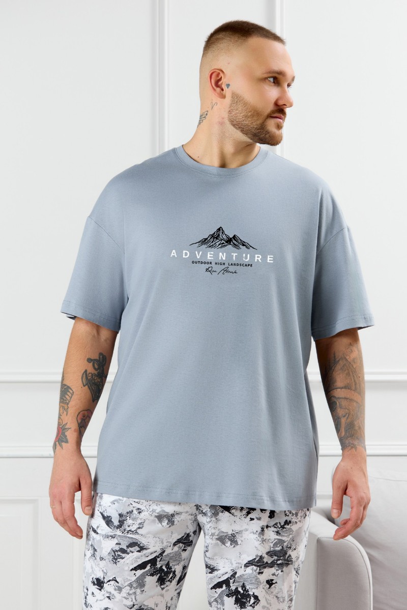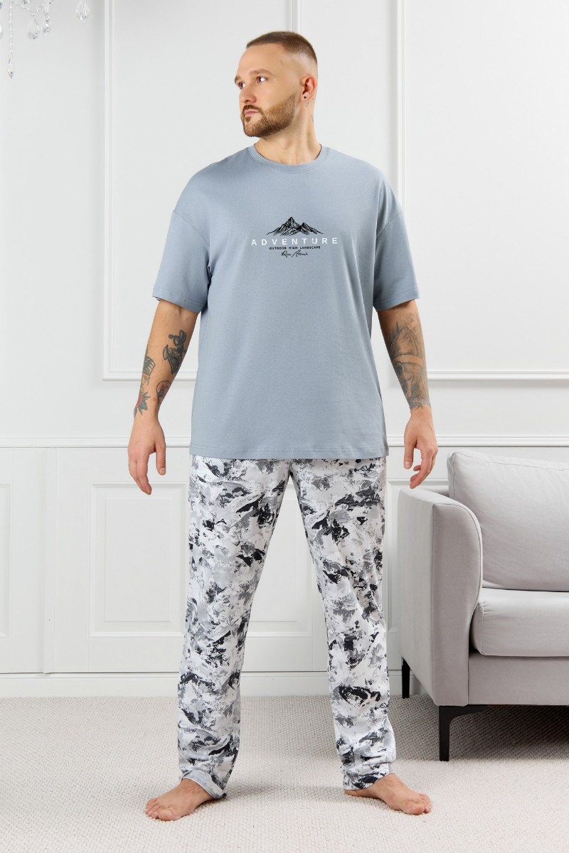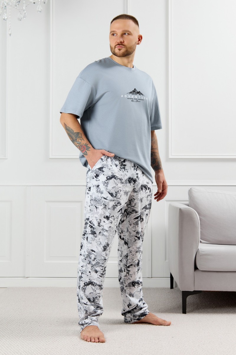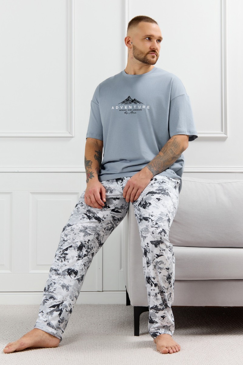 Представляем Вашему вниманию костюм мужской, состоящий из футболки и брюк. Футболка однотонная с принтом на груди; модель свободная, со спущенной линией плеч, овальным вырезом горловины. Брюки из полотна с набивным рисунком эксклюзивного дизайна, прямые, с боковыми карманами с обтачными входами, на притачном поясе с отстроченной эластичной тесьмой.