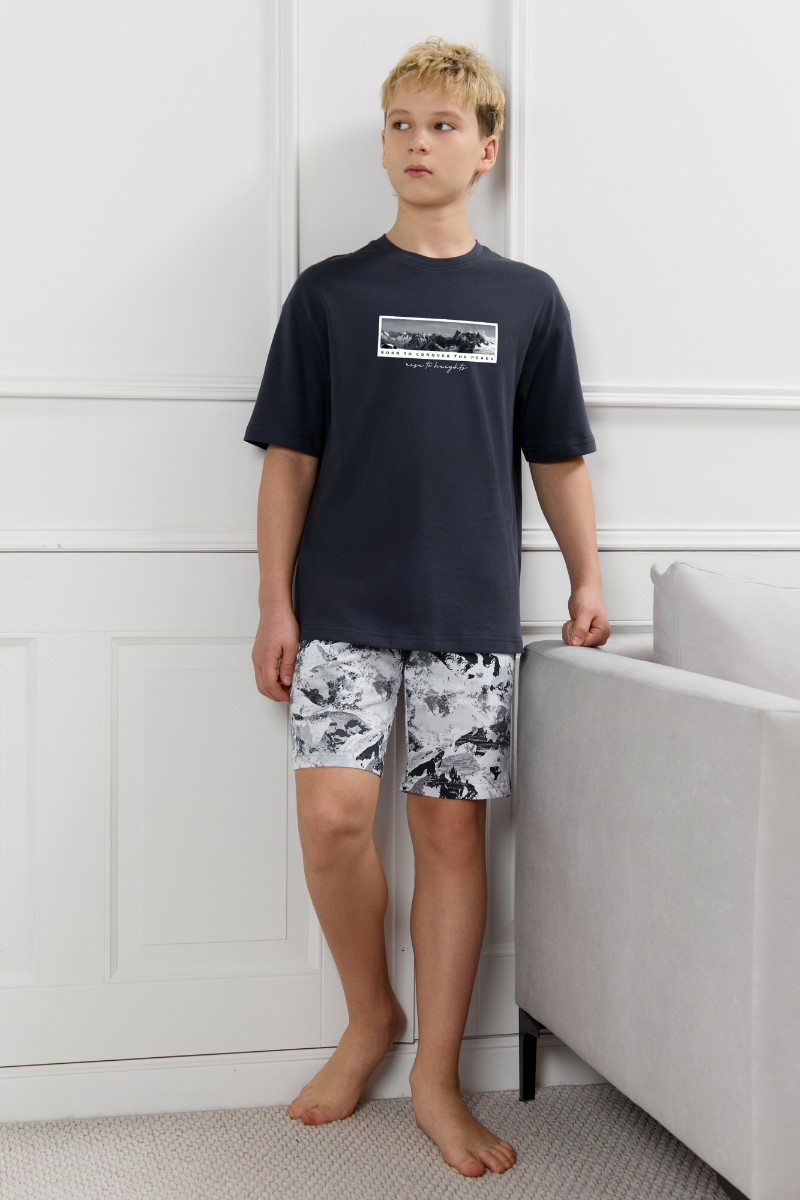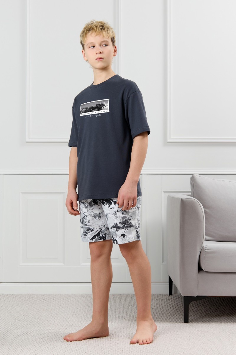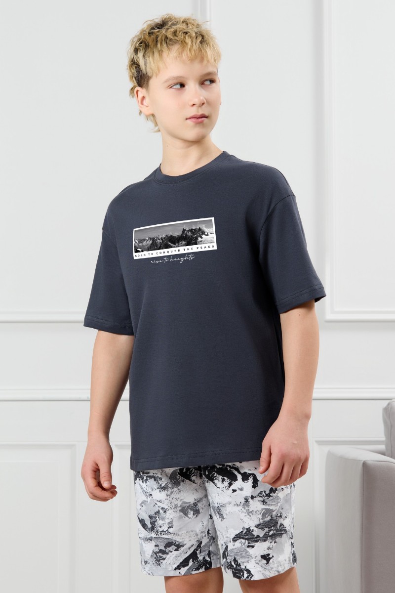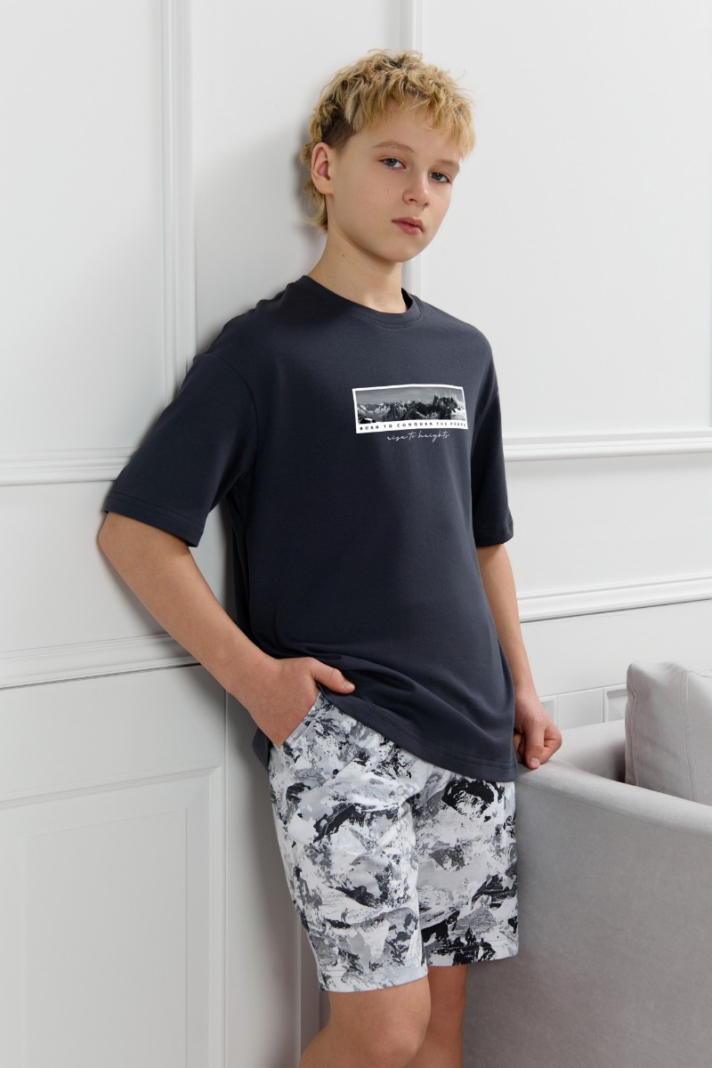 Представляем Вашему вниманию костюм для мальчика, состоящий из футболки и шорт. Футболка однотонная с принтом на груди; модель свободная, со спущенной линией плеч, овальным вырезом горловины. Шорты из полотна с набивным рисунком эксклюзивного дизайна, с боковыми карманами с обтачными входами, на притачном поясе с отстроченной эластичной тесьмой.