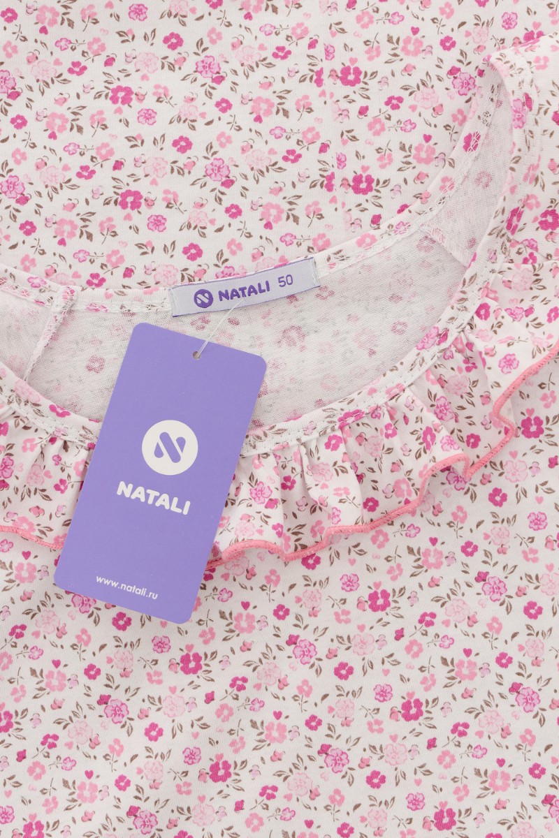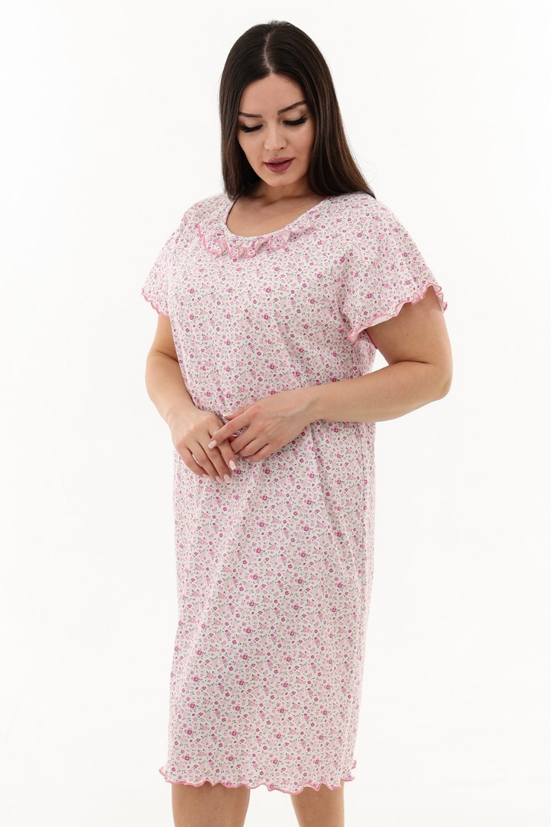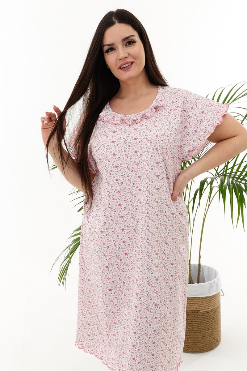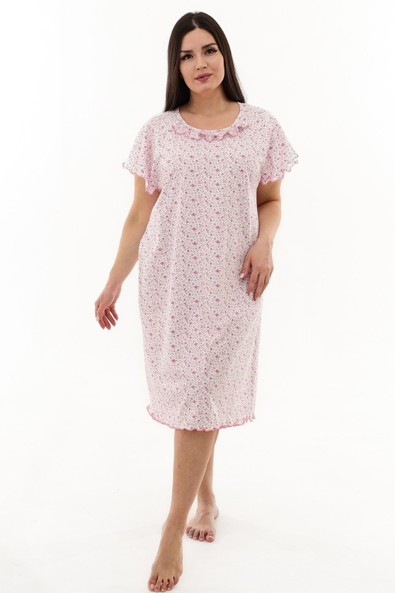 Представляем Вашему вниманию изящную женскую сорочку с симпатичной рюшей по горловине. Очень свободный и удобный крой. Рукав-реглан не стесняет движения рук. Обработка рукава и низа изделия в виде лёгкой волны придаёт лёгкость и воздушность.