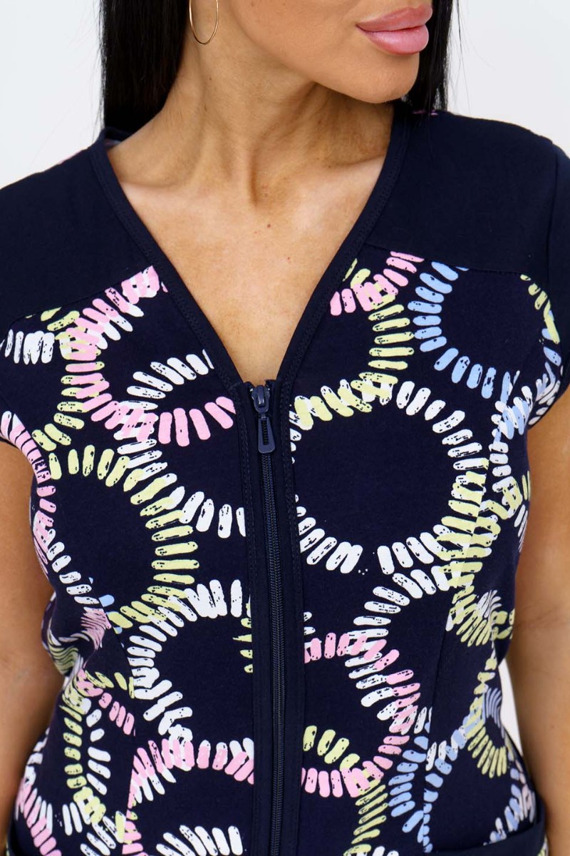 Представляем Вашему вниманию халат женский с застёжкой - молнией полуприлегающего силуэта длиной чуть выше уровня колена. На полочке присутствуют накладные карманы с отделкой в верхней части. Рукав - крылышко выполнен из отделочного материала, так же как и кокетка полочки. Вырез горловины V-образный, обработанный окантовкой.