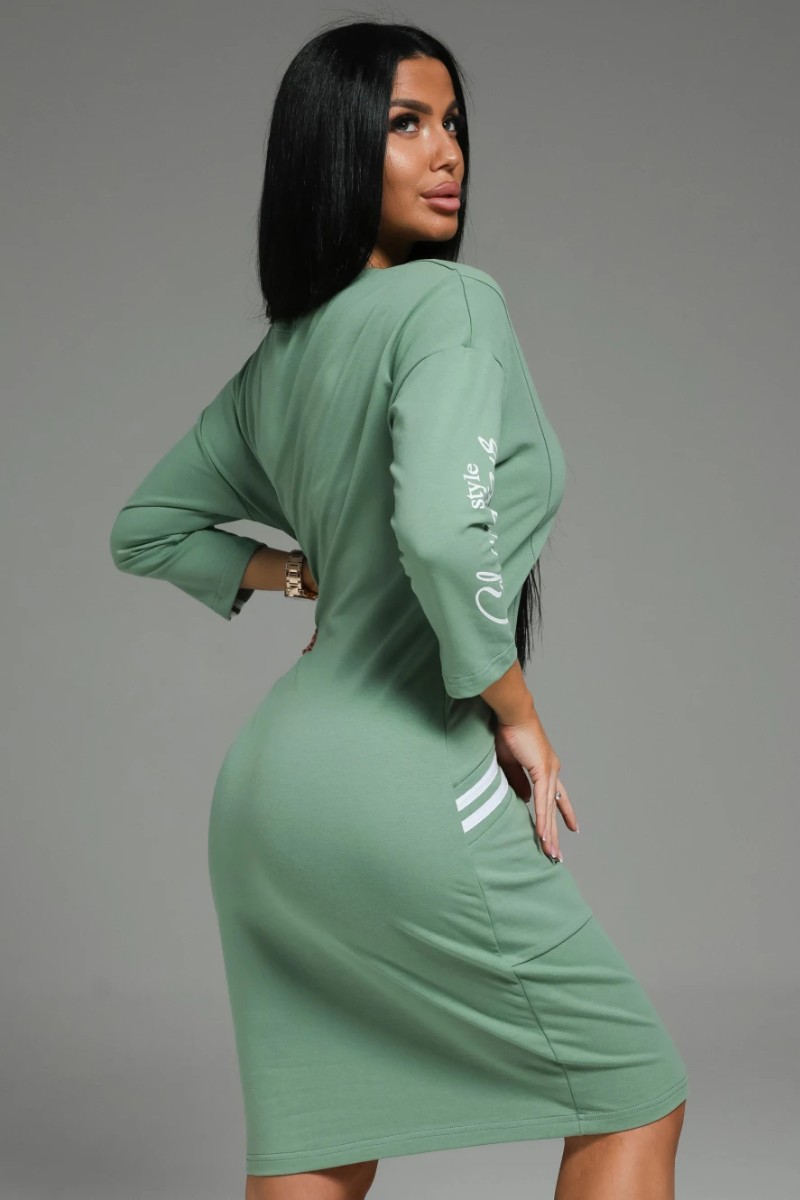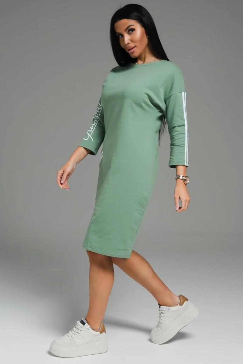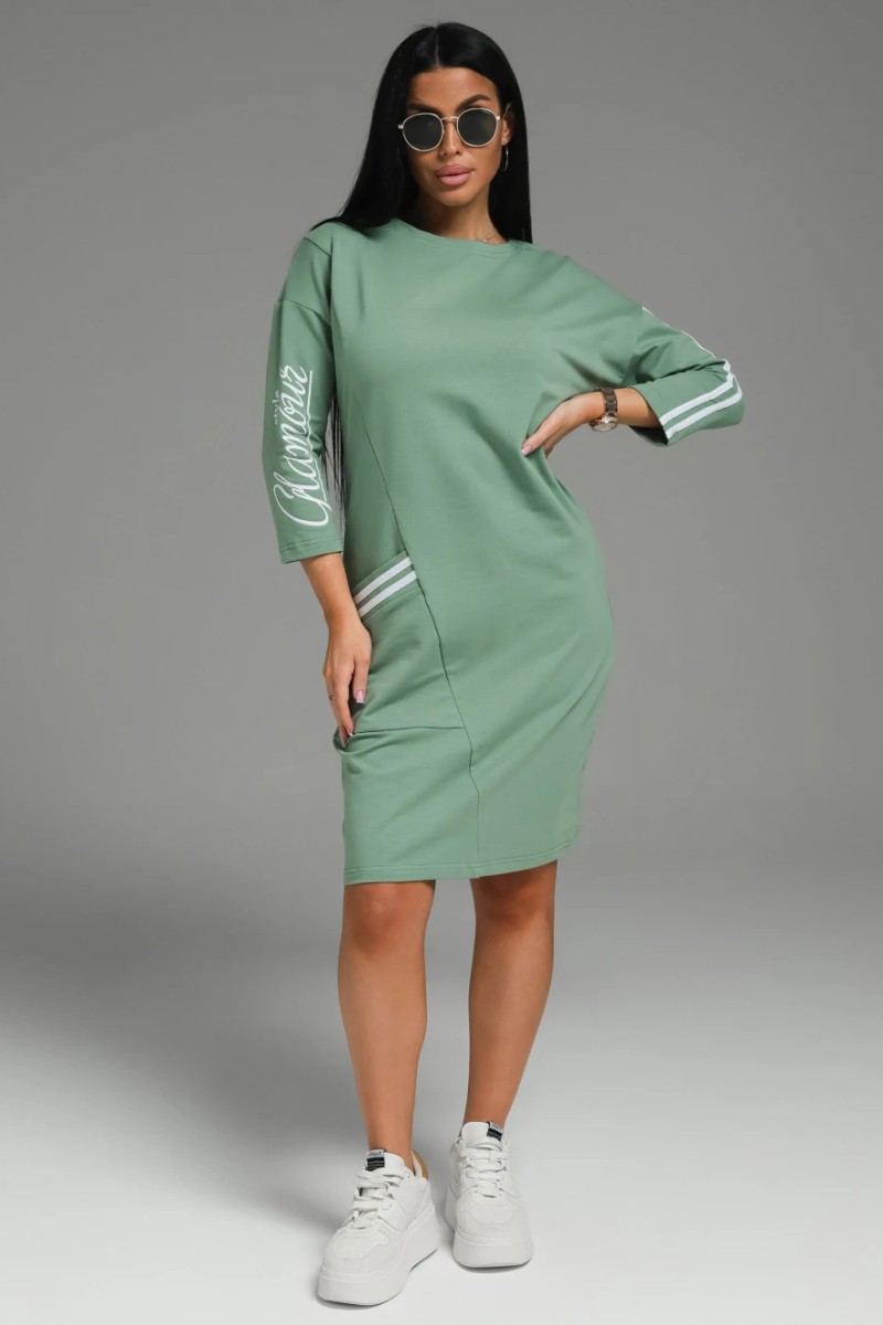 Представляем Вашему вниманию эффектное женское платье, изготовленное из футера 2-х нитки. Платье со спущенной линией плеча и рукавом рубашечного покроя обеспечивает полную свободу движений вноске. Это прекрасный вариант для прогулки, работы и приятного вечера. Стильным дополнением модели стали лампасы и печать. Платье спорт шик отлично сочетается с головными уборами: кепи, бейсболками. В холодное время года к этому наряду можно добавить укороченную кожаную куртку или бомбер. Из аксессуаров часто используют различные ремни, кушаки или женские сумки на пояс. Для студенческой вечеринки образ можно дополнить браслетами и серьгами геометрической формы.