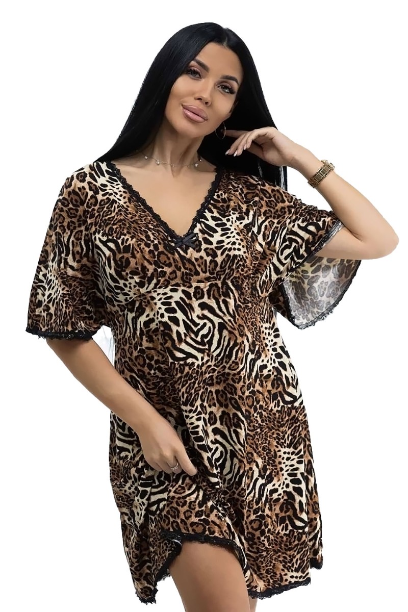 Представляем Вашему вниманию изящную женскую тунику, сшитую из высококачественной вискозы. Длина изделия до уровня колена. Рукав - спущенный, короткий. Вырез горловины V-образный. Нижняя часть домашнего платья, рукава и горловина имеют отделку кружевом.