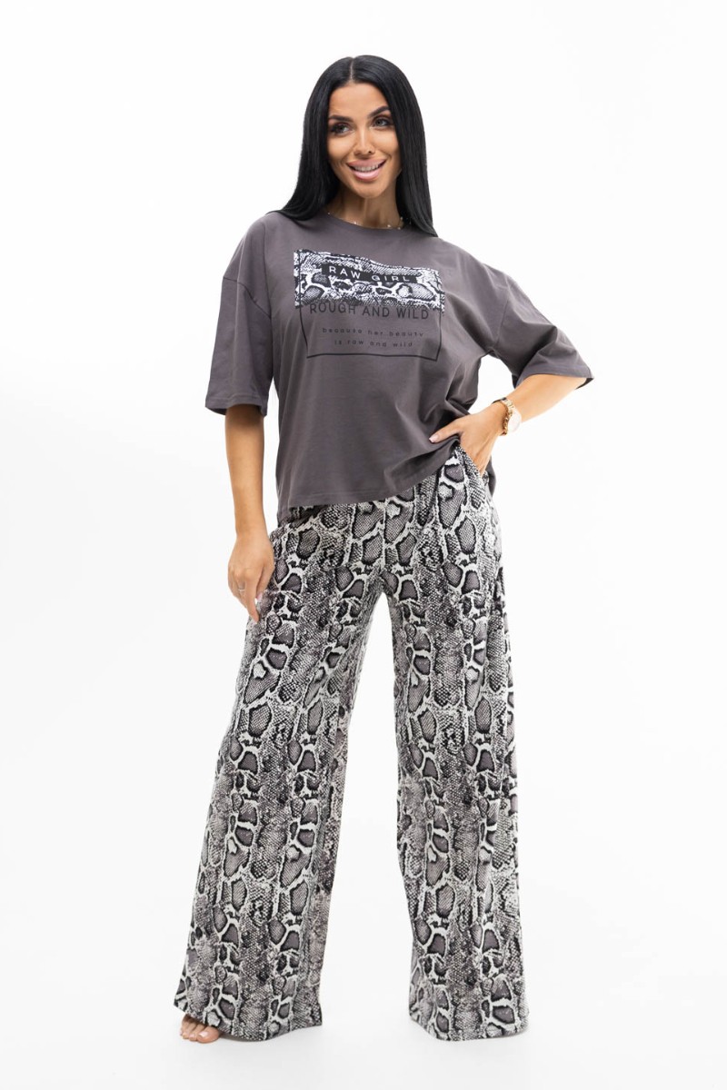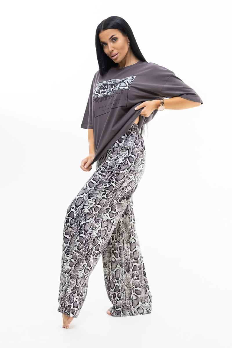 Представляем Вашему вниманию костюм женский домашний свободного силуэта, состоящий из футболки со спущенным удлиненным рукавом и брюк-шаровар. Футболка с округлым вырезом горловины и печатным принтом. Брюки с поясом на резинке и карманами с отрезным бочком. Стильный современный дизайн и свобода в движении делают данный костюм незаменимым в гардеробе каждой уважающей себя модницы. Идеально для тех, кто хочет быть в тренде, даже во время отдыха.