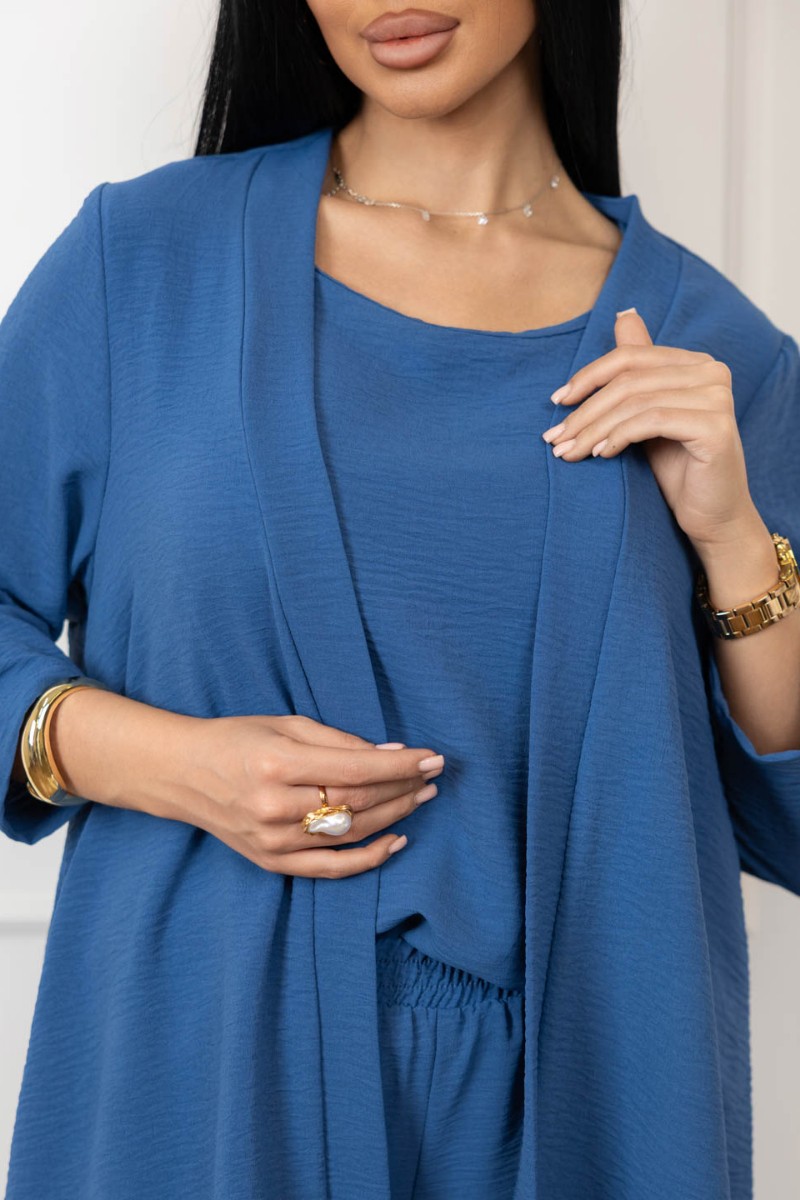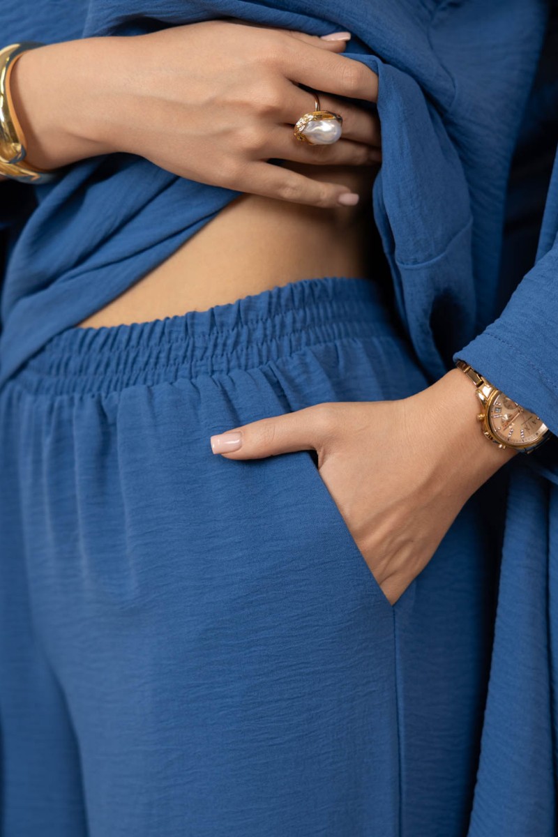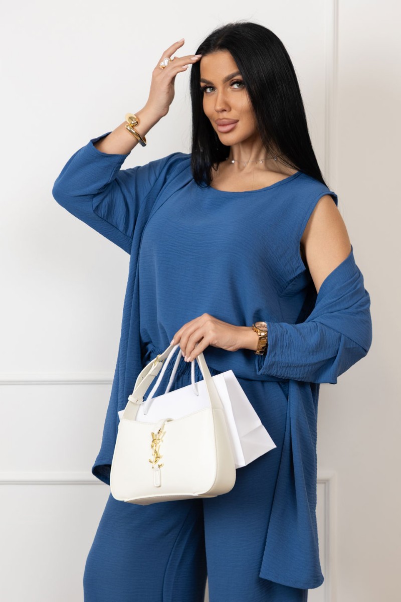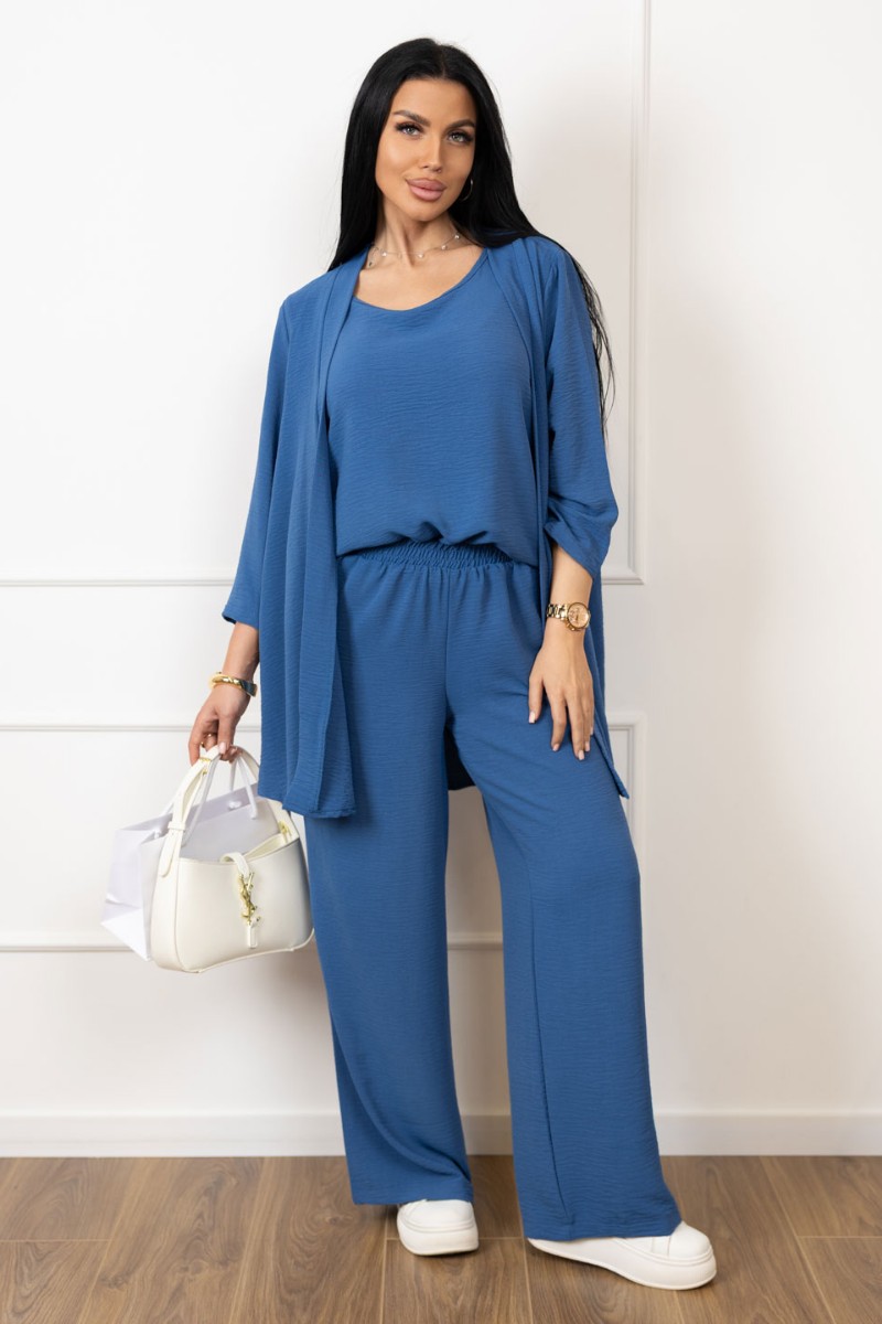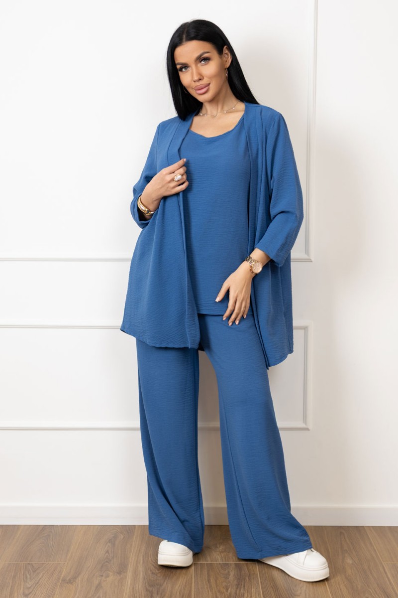 Представляем Вашему вниманию летний женский костюм-тройка: стильное кимоно, майка и свободные брюки. Майка без рукавов,с О-образной горловиной, длиной до середины бедра. Накидка-кимоно с втачным рукавом длиной 3/4. Брюки палаццо с карманами в боковых швах и поясом с эластичной резинкой и отстрочкой на поясной машине.
