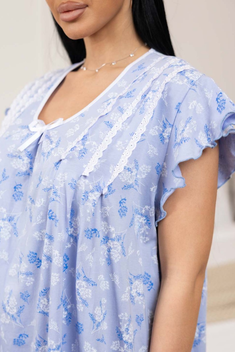 Представляем Вашему вниманию женскую сорочку для сна, длиной чуть ниже уровня колена. С округлым вырезом и коротким втачным рукавом. На передней части декоративные элементы в виде кружева и бантика.