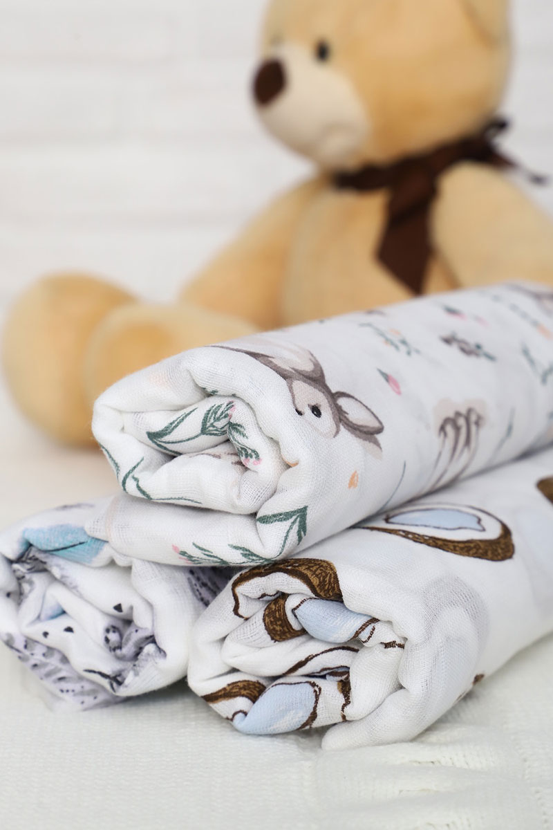 Муслин - натуральный хлопковый двухслойный материал пропускает воздух, впитывает влагу, обладает гипоаллергенными свойствами, тонкая, легкая, воздушная ткань, идеально подходит коже малыша. Изделия можно применять как простынку, подгузник для грудничка, детей любых возрастов. Оптимальны при ежедневном применении: пеленание на столике, в роддом на выписку, на крестины, в коляску и кроватку, для купания, как постельные принадлежности и полотенце.
