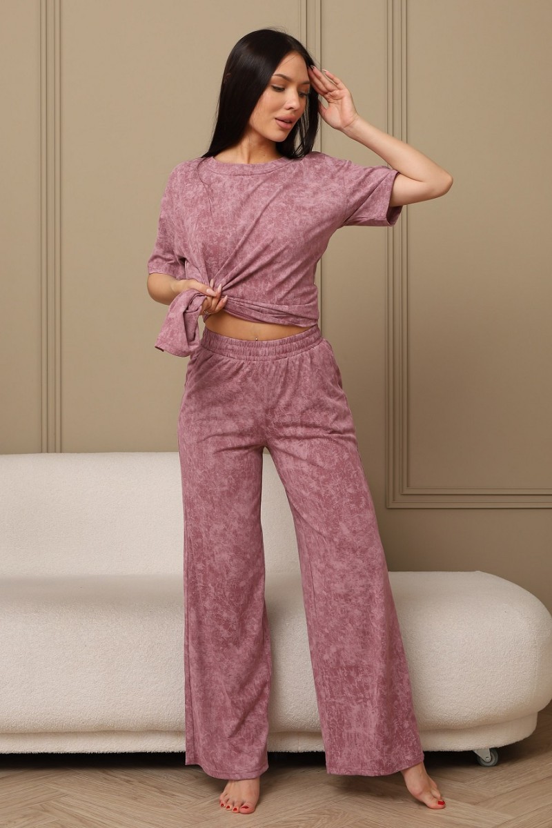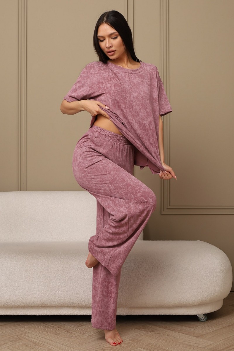 Представляем Вашему вниманию домашний женский костюм двойку, состоящий из футболки оверсайз, с разрезами в боковых швах по низу изделия, и свободных штанов-палаццо, дополненных широким поясом на резинке. Сшиты из качественного хлопкового полотна, позволяющего коже дышать.
