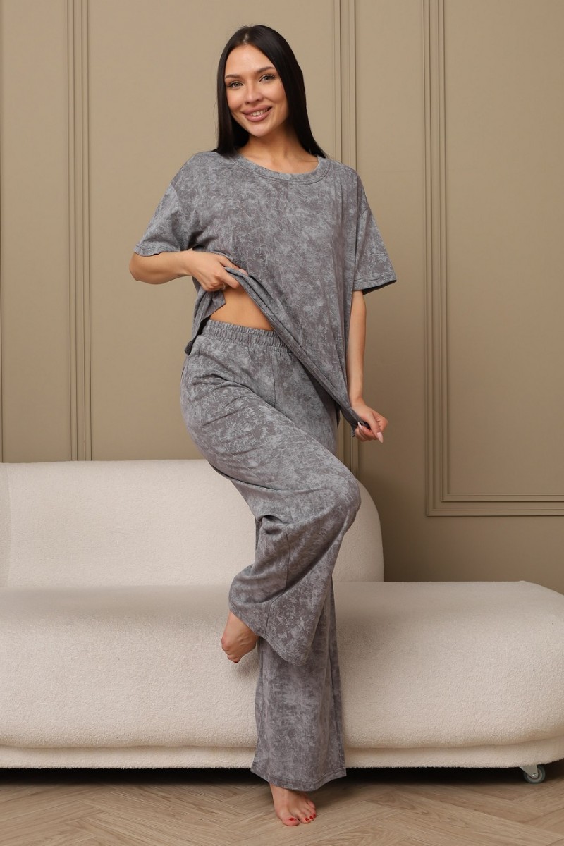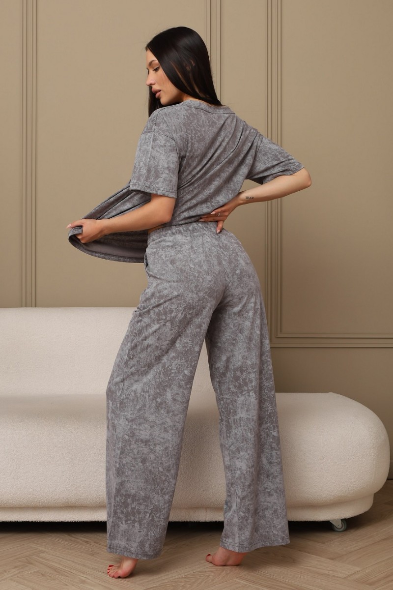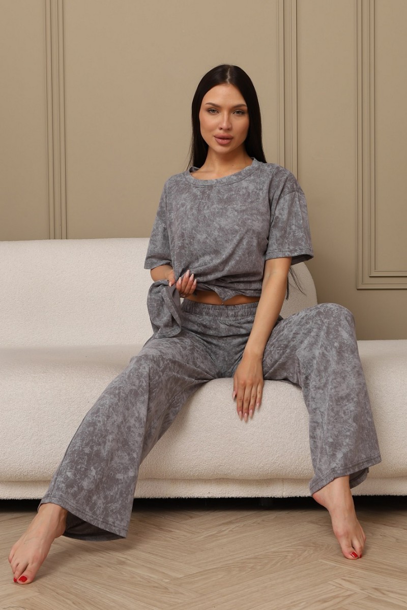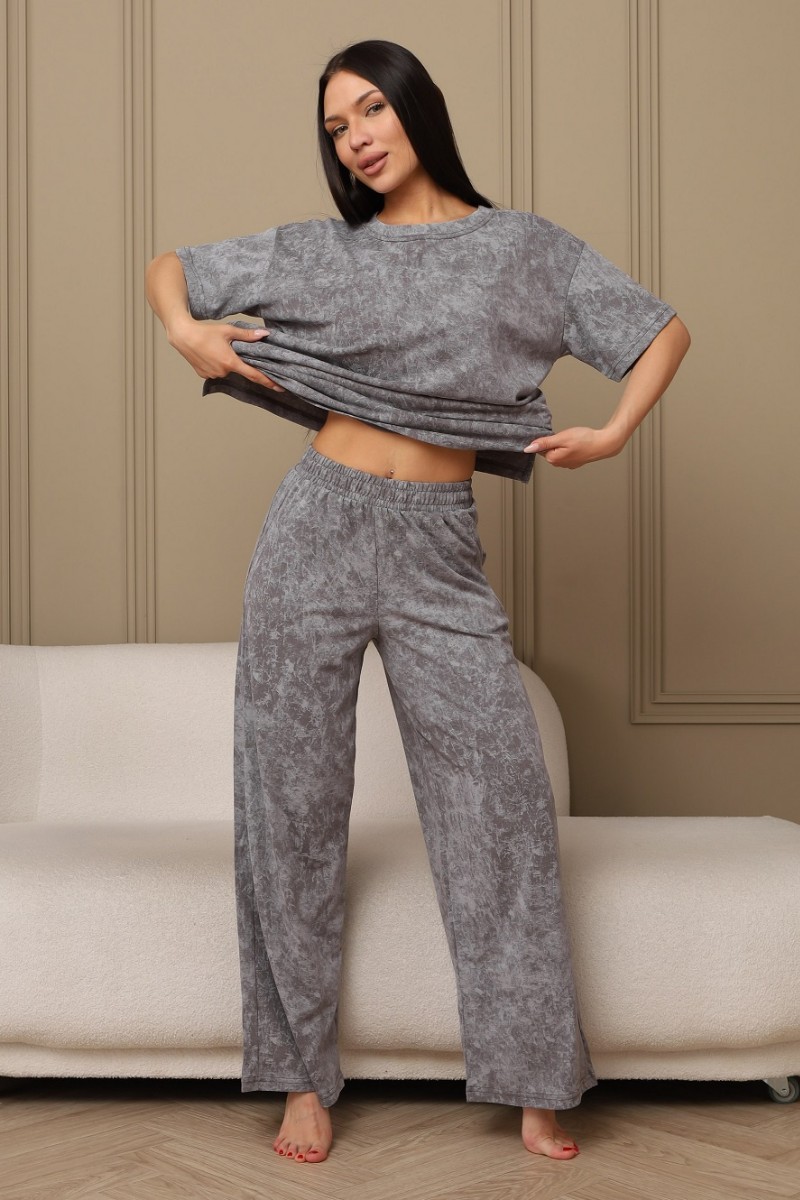 Представляем Вашему вниманию домашний женский костюм двойку, состоящий из футболки оверсайз, с разрезами в боковых швах по низу изделия, и свободных штанов-палаццо, дополненных широким поясом на резинке. Сшиты из качественного хлопкового полотна, позволяющего коже дышать.